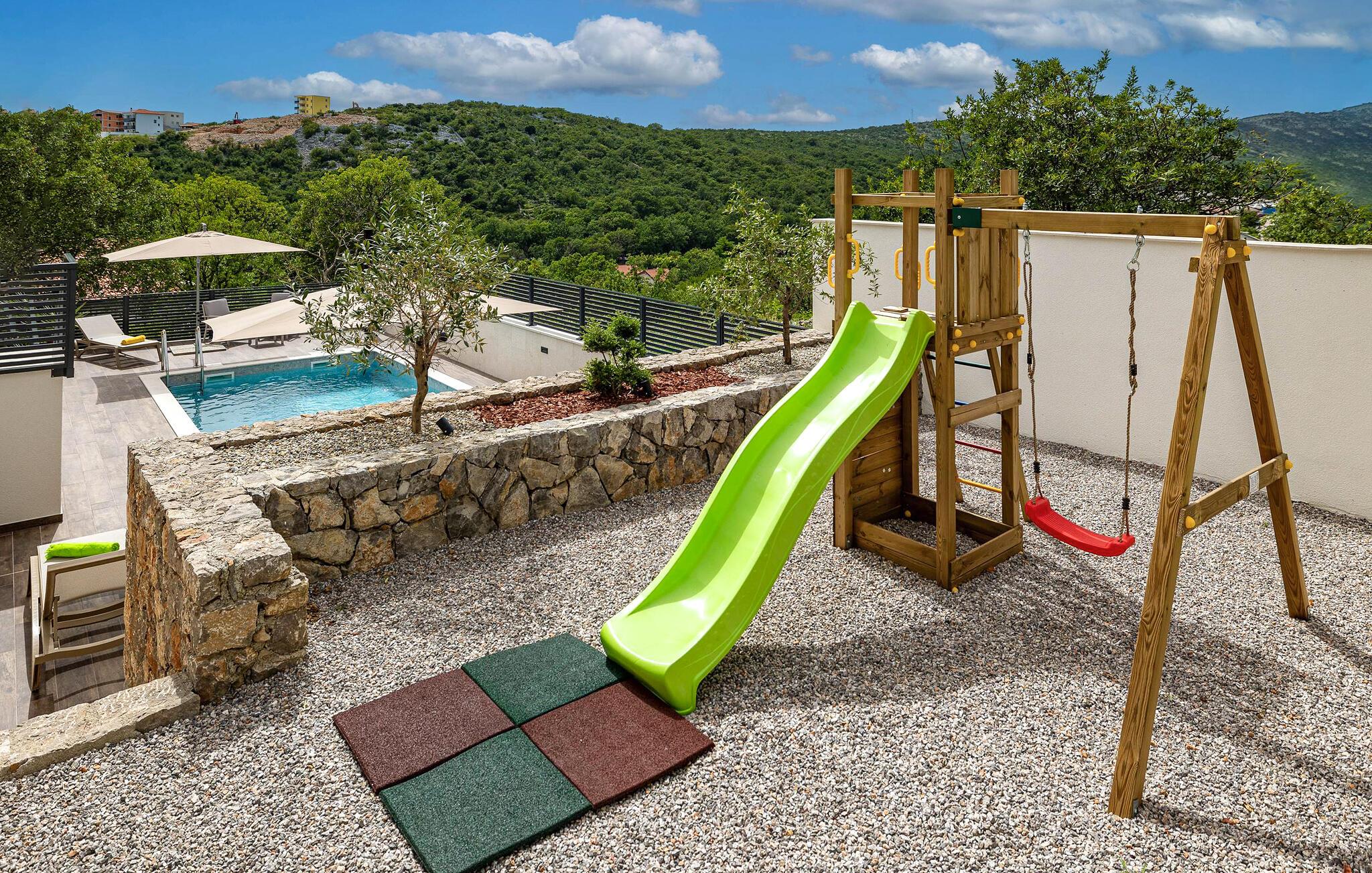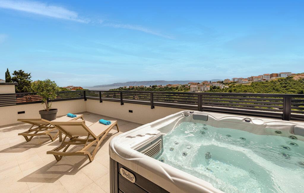 Dette feriehus i Novi Vinodolski på Crikvenica-Vinodol Riviera byder jer velkommen til en unik ferie i Kroatien. Begynd jeres dage med en forfriskende svømmetur i den private pool, før I finder ren afslapning i saunaen eller det udendørs spabad. Udnyt fitnessfaciliteterne til at holde jer i form og lad børnene lege indendørs eller løbe rundt udenfor på legepladsen. Nyd husets rummelige værelser og de mange faciliteter, det har at tilbyde.