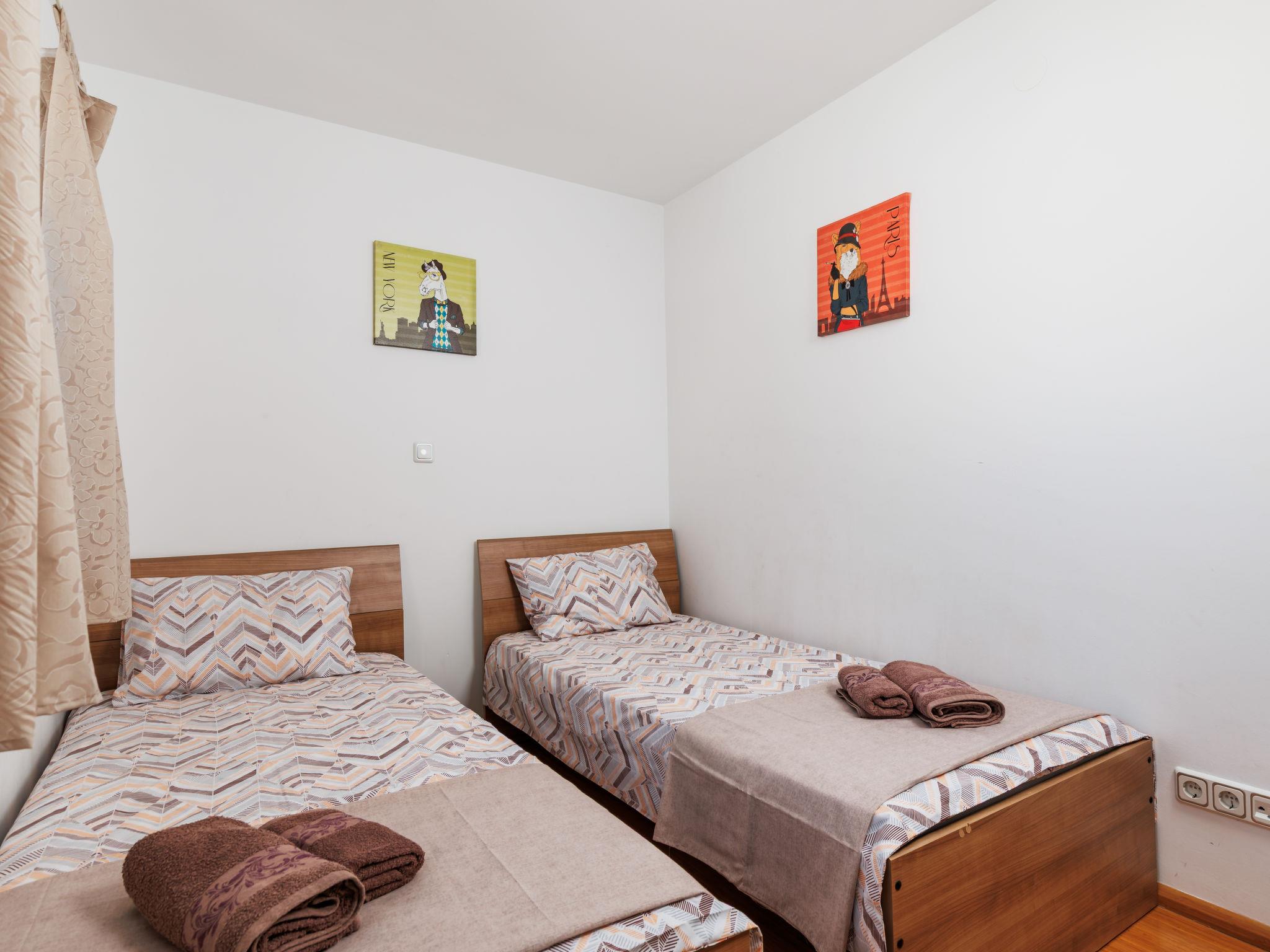 3-room apartment 56 m2, on the ground floor, south-west facing position. Tasteful furnishings: living/dining room 21 m2 with 1 double sofabed (160 cm, length 190 cm), satellite TV (flat screen), air conditioning. Exit to the balcony. 1 room with 1 french bed (160 cm, length 200 cm), TV (flat screen). 1 room with 2 beds (90 cm, length 200 cm). Open kitchen (oven, 4 ceramic glass hob hotplates, microwave, freezer, electric coffee machine). Shower/WC. No heating option. Balcony 10 m2. Balcony furniture. View of the swimming pool. Facilities: hair dryer. Internet (WiFi, free). Bedrooms with higher placed windows.