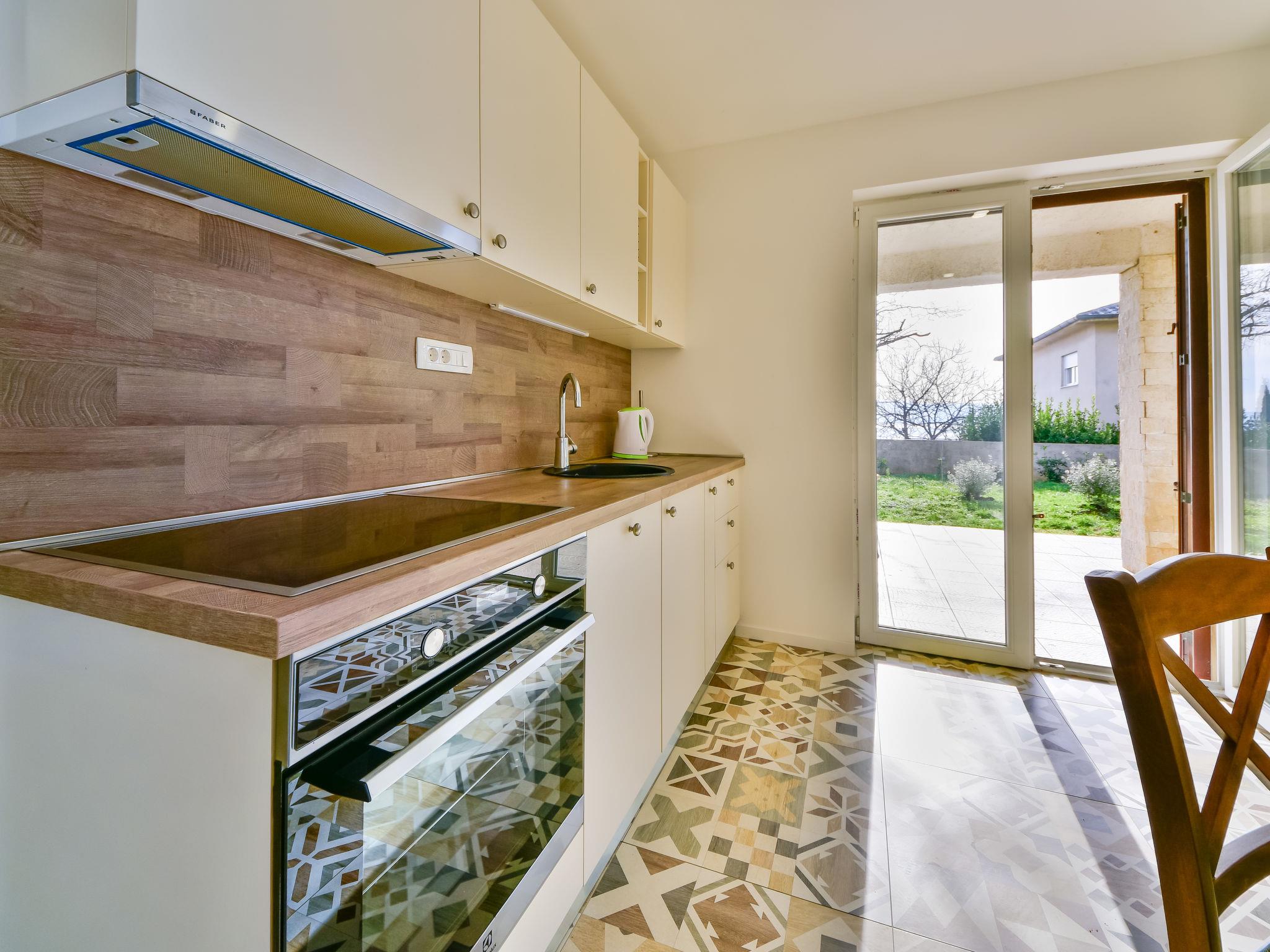 2-room apartment 50 m2, on the ground floor. Fully renovated in 2023, cosy furnishings: dining room with air conditioning. Exit to the garden, to the terrace. 1 room with 1 bed (90 cm, length 200 cm), 1 double bed (2 x 90 cm, length 200 cm), digital TV. Open kitchen (oven, dishwasher, 4 ceramic glass hob hotplates, kettle, freezer). Shower/WC. Electric heating, floor heating. Heating available only from 01.10. to 01.05. Terrace 20 m2 partly roofed. Terrace furniture. Beautiful view of the sea. Facilities: washing machine. Internet (WiFi, free). Please note: TV only HR. Private entrance.