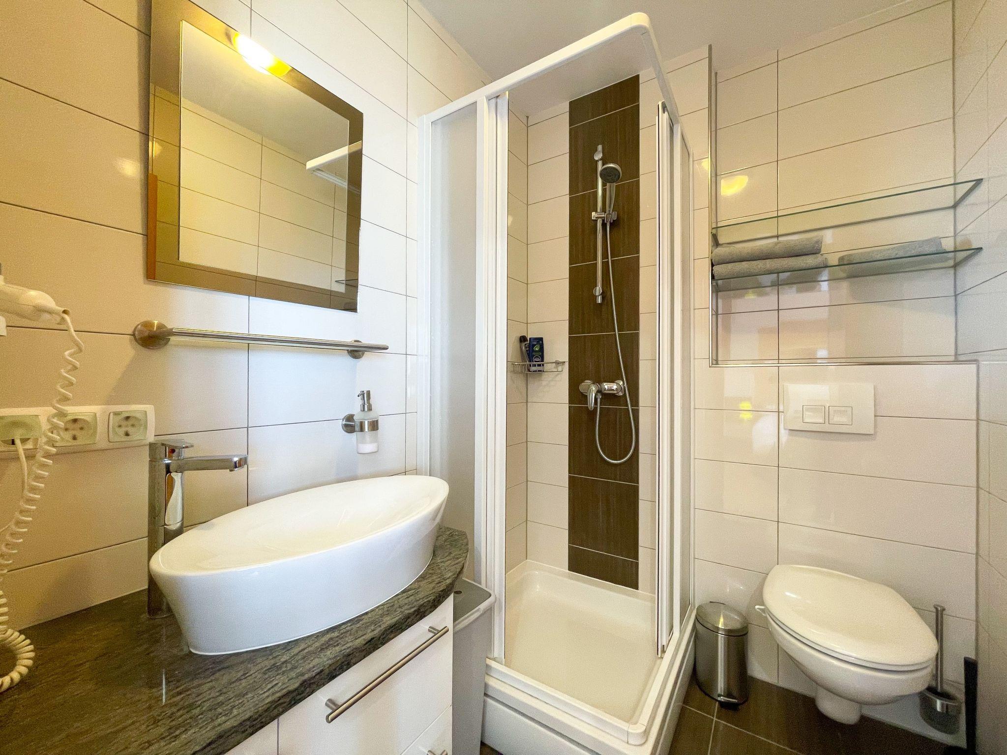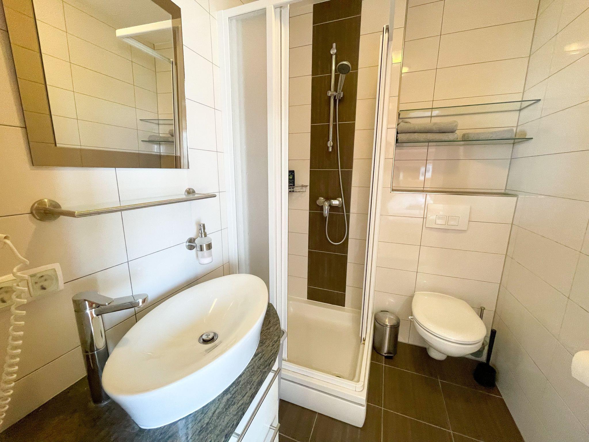 The flat comprises a combined sleeping and living area, furnished with a comfortable double bed and a spacious wardrobe for your holiday wardrobe. The practical kitchen area is equipped with a 2-plate induction hob, a filter coffee machine, a kettle and a fridge for your self-catering needs. Thanks to the central air conditioning, you can always enjoy a pleasant temperature in the room, regardless of the outside temperature.