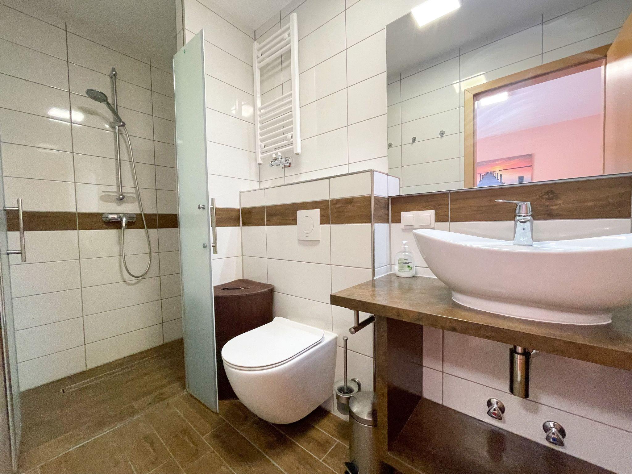 Inside, you'll find a cosy space equipped with all the comforts for a carefree stay. You'll find a cosy living room with a sofa bed, perfect for relaxing after a day of adventure. The flat also includes two bedrooms with double beds - each room offers privacy and comfort for a good night's sleep. A practical kitchenette with a 2-plate induction hob, filter coffee machine and kettle is available for shared meals. Two bathrooms with showers ensure that waiting times in the morning are avoided.