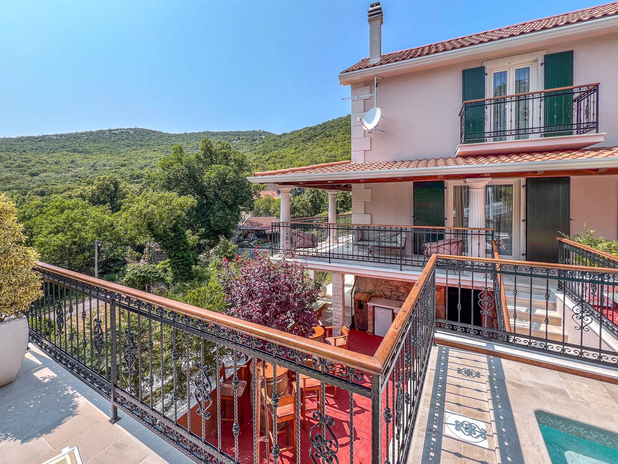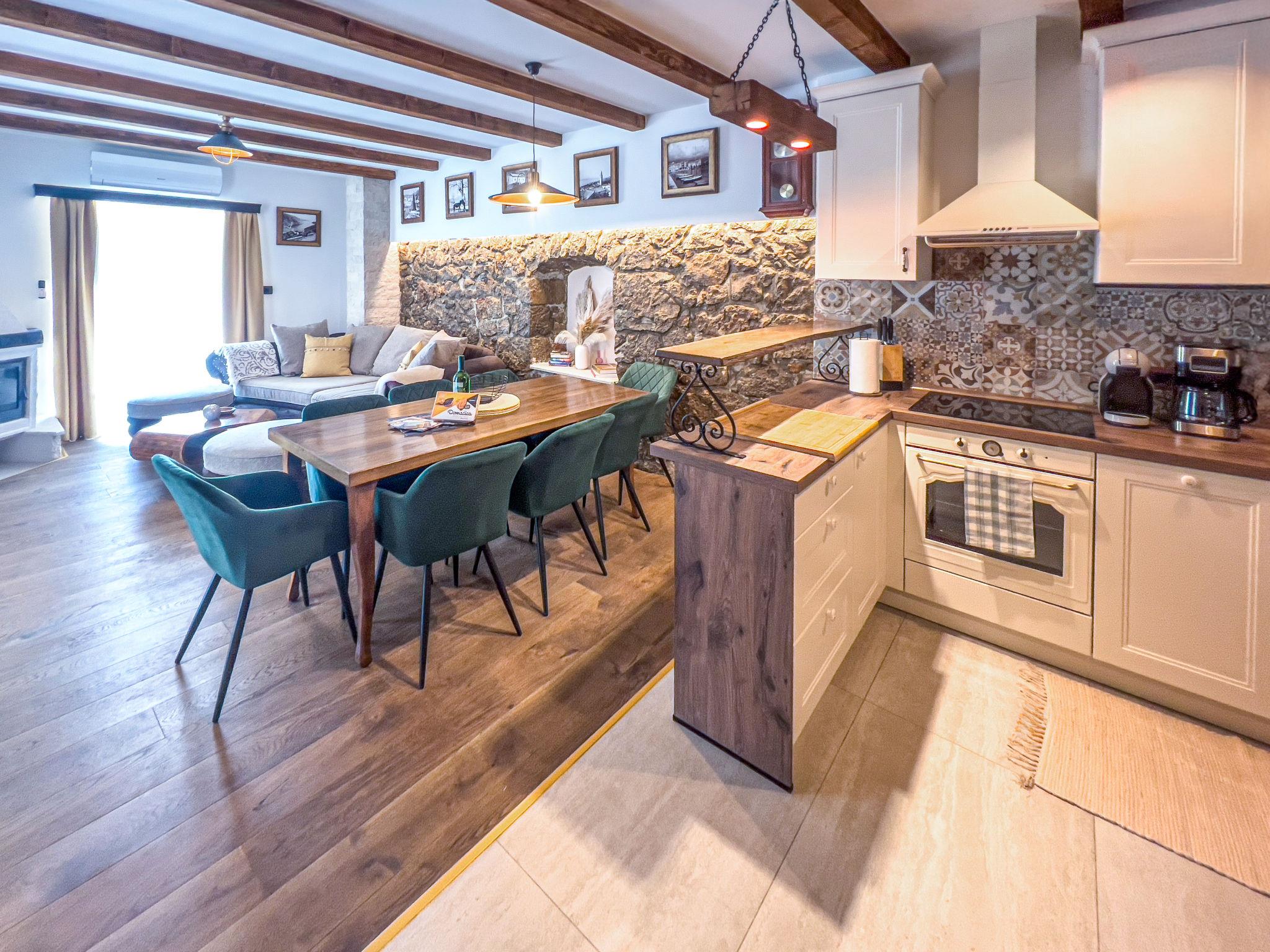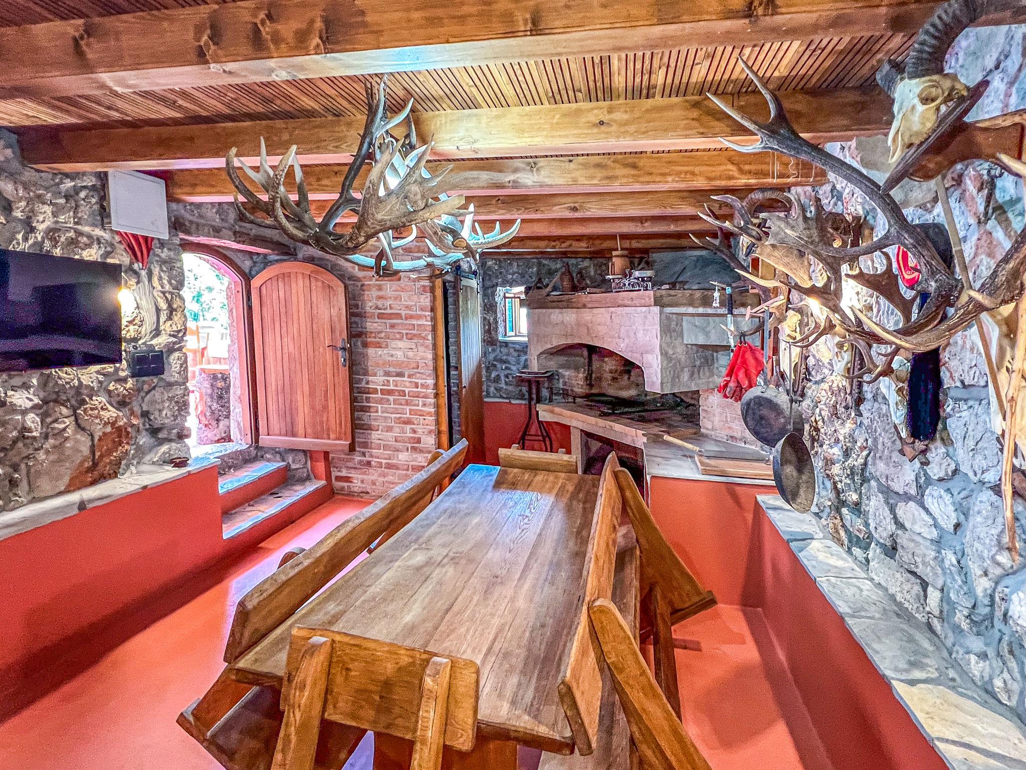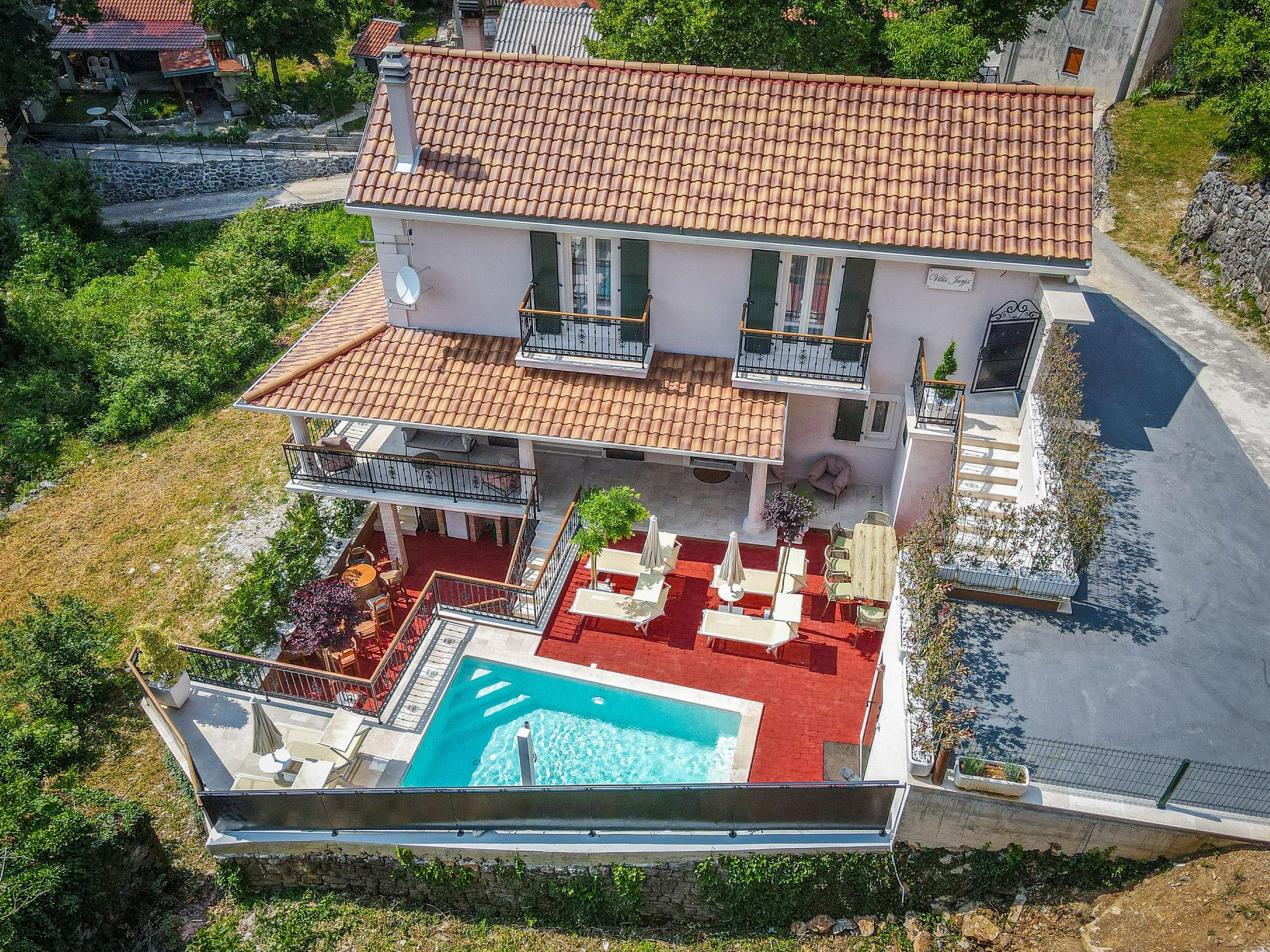 Gornji Zagon: Single-family house "Vila Jurja", 3 storeys, renovated in 2025. Above Novi Vinodolski 16 km from the centre of Novi Vinodolski, 15 km from the sea, in the countryside. Private: property 350 m2 (fenced), swimming pool angular, heated (5 x 3 m, depth 135 cm, seasonal availability: 01.May. - 30.Sep.) with internal staircase and shutter cover. Outdoor shower, barbecue, pool maintenance by the owner/gardener. In the house: internet access, table football, washing machine, tumble dryer. Narrow motor access to the house. Parking (for 3 cars) at the house on the premises. Shop 15 km, restaurant 4 km, café 4 km, bus stop 4 km, pebble beach 15 km.
