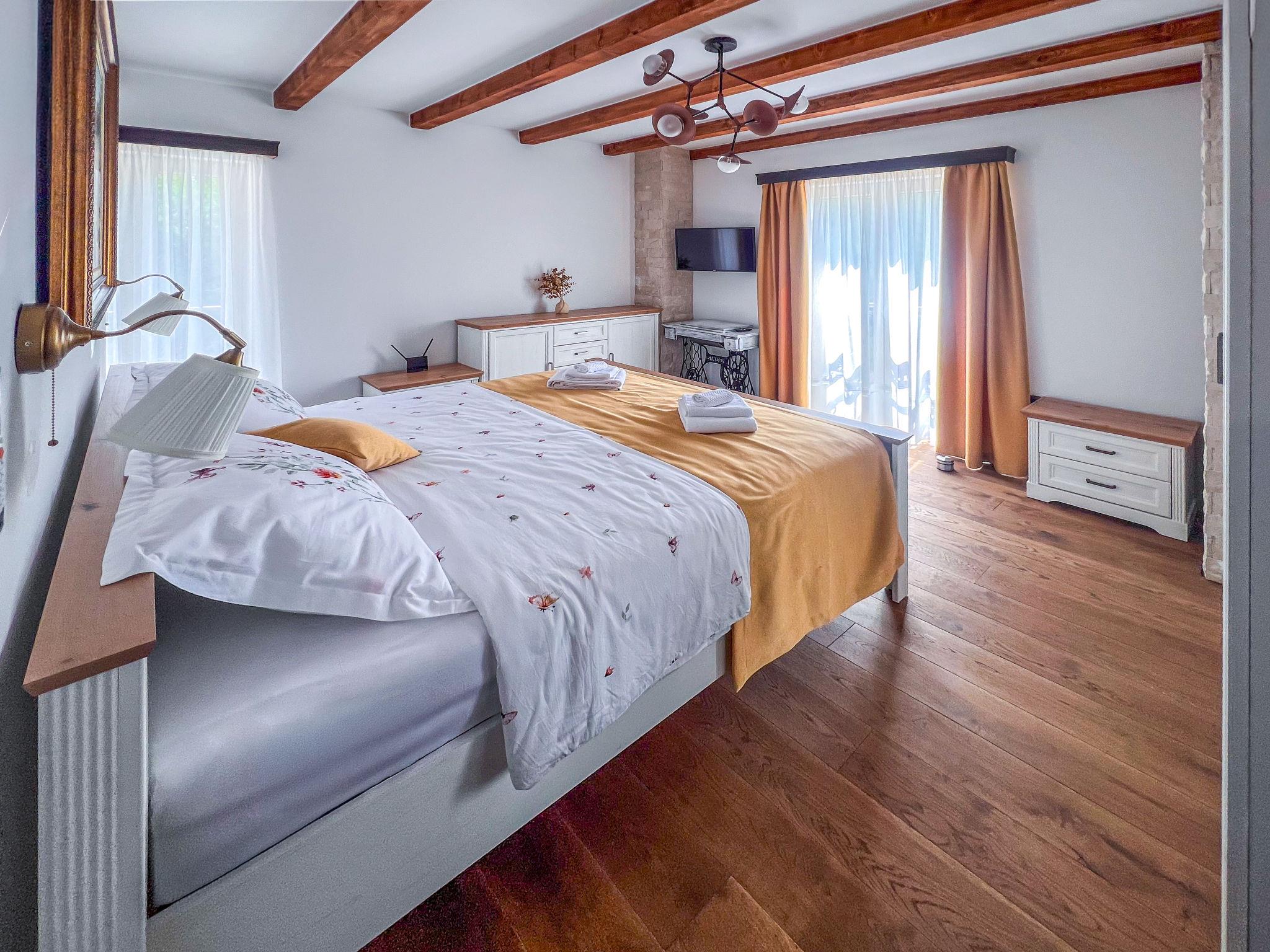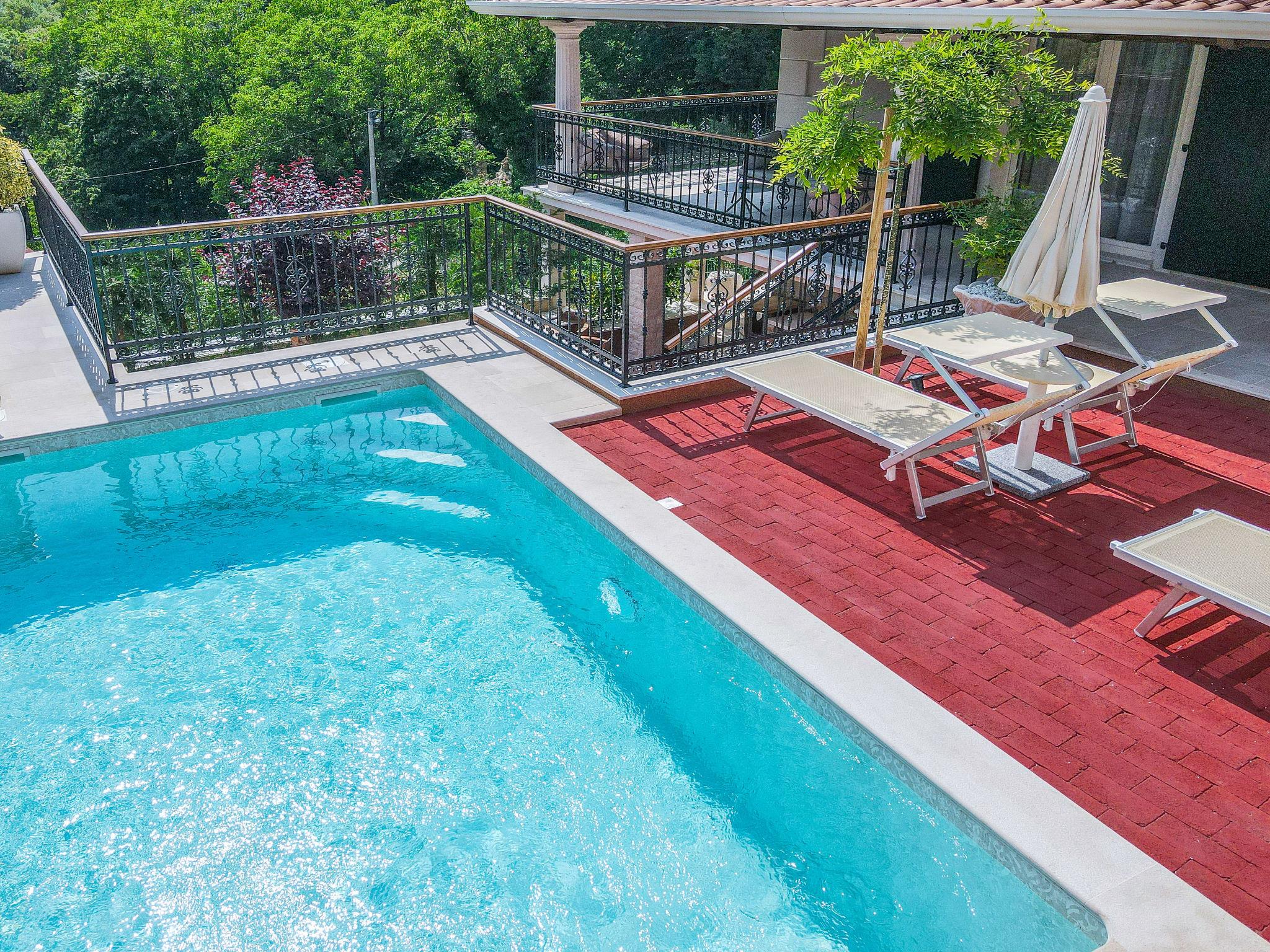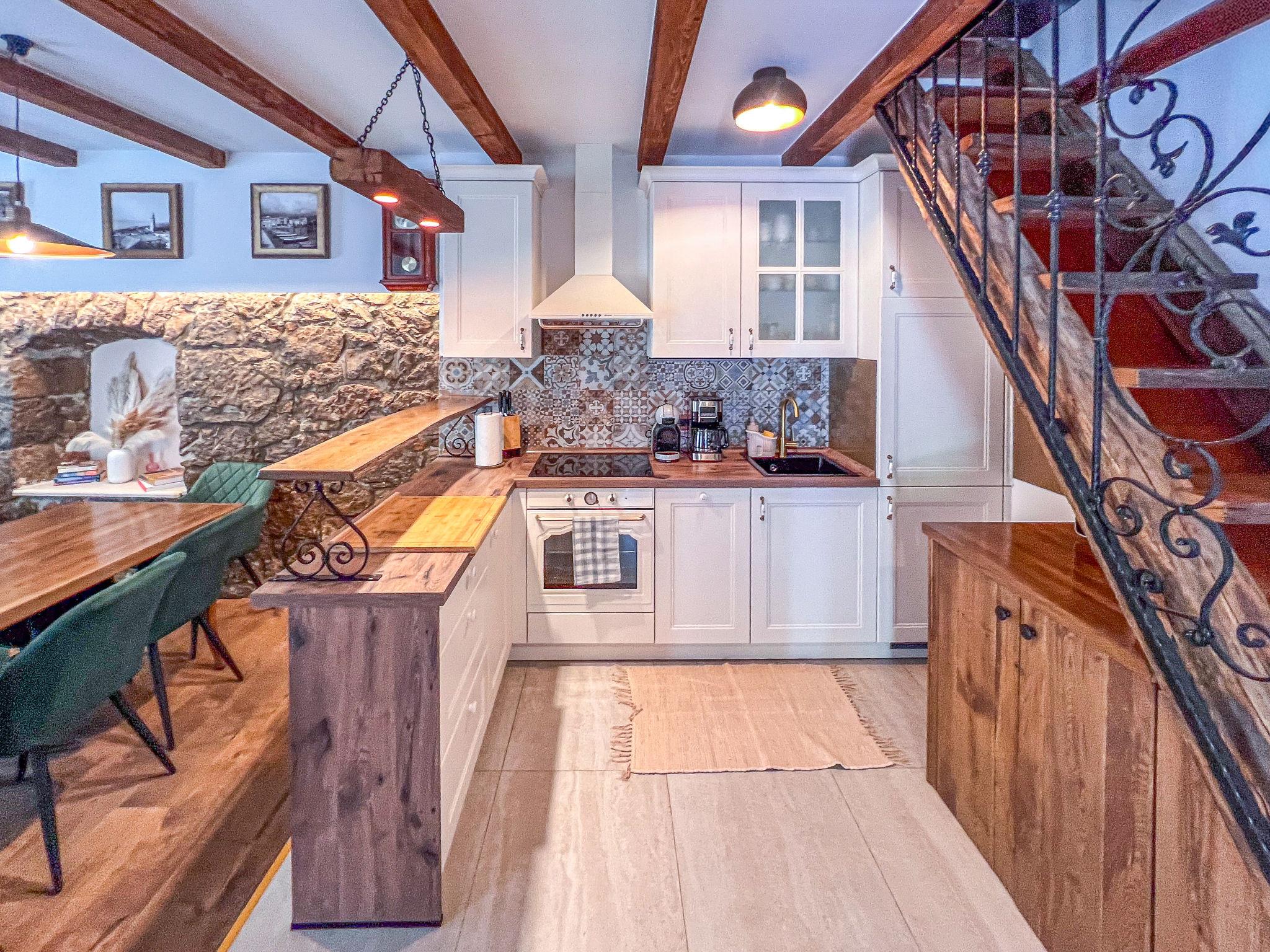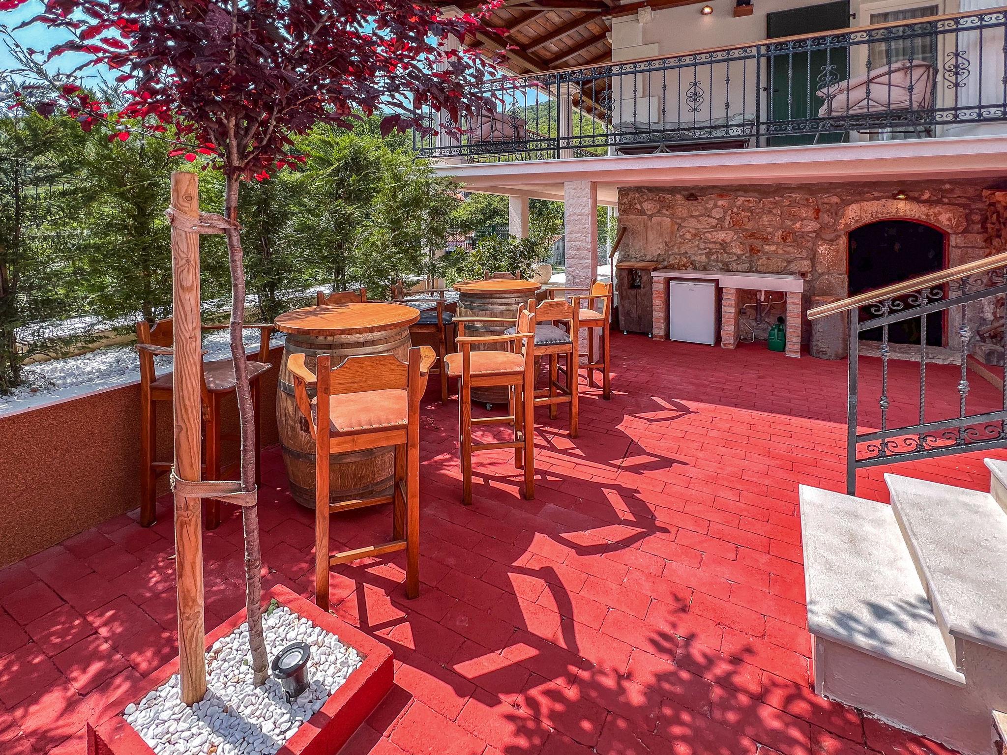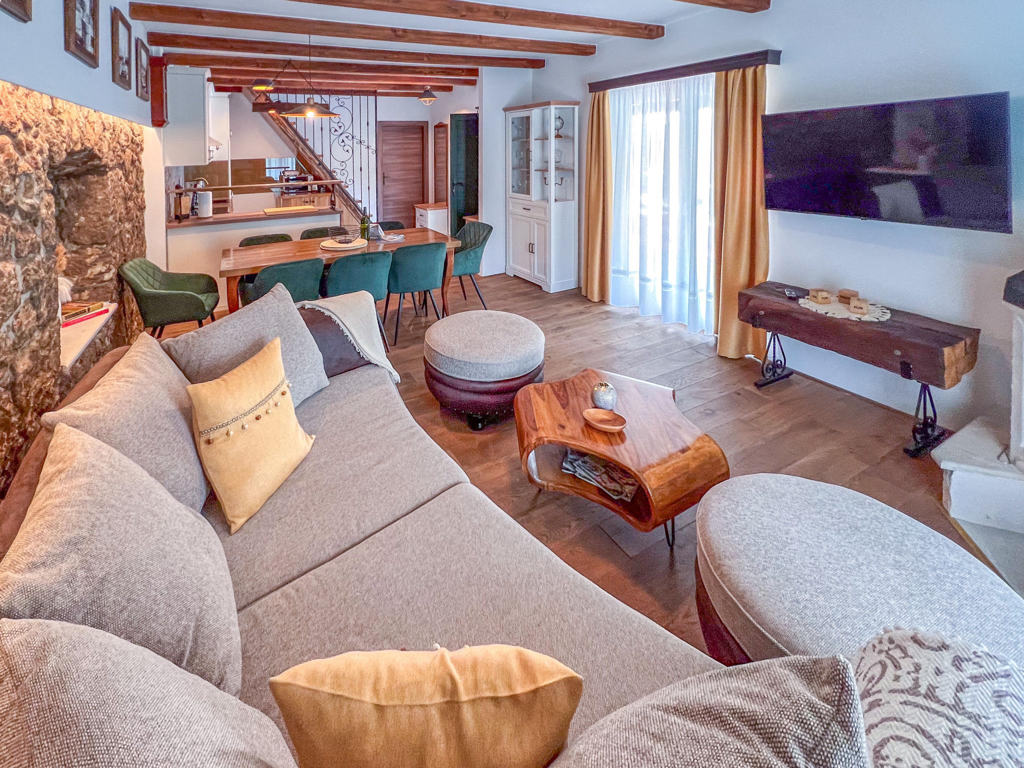 Gornji Zagon: Single-family house "Vila Jurja", 3 storeys, renovated in 2025. Above Novi Vinodolski 16 km from the centre of Novi Vinodolski, 15 km from the sea, in the countryside. Private: property 350 m2 (fenced), swimming pool angular, heated (5 x 3 m, depth 135 cm, seasonal availability: 01.May. - 30.Sep.) with internal staircase and shutter cover. Outdoor shower, barbecue, pool maintenance by the owner/gardener. In the house: internet access, table football, washing machine, tumble dryer. Narrow motor access to the house. Parking (for 3 cars) at the house on the premises. Shop 15 km, restaurant 4 km, café 4 km, bus stop 4 km, pebble beach 15 km.