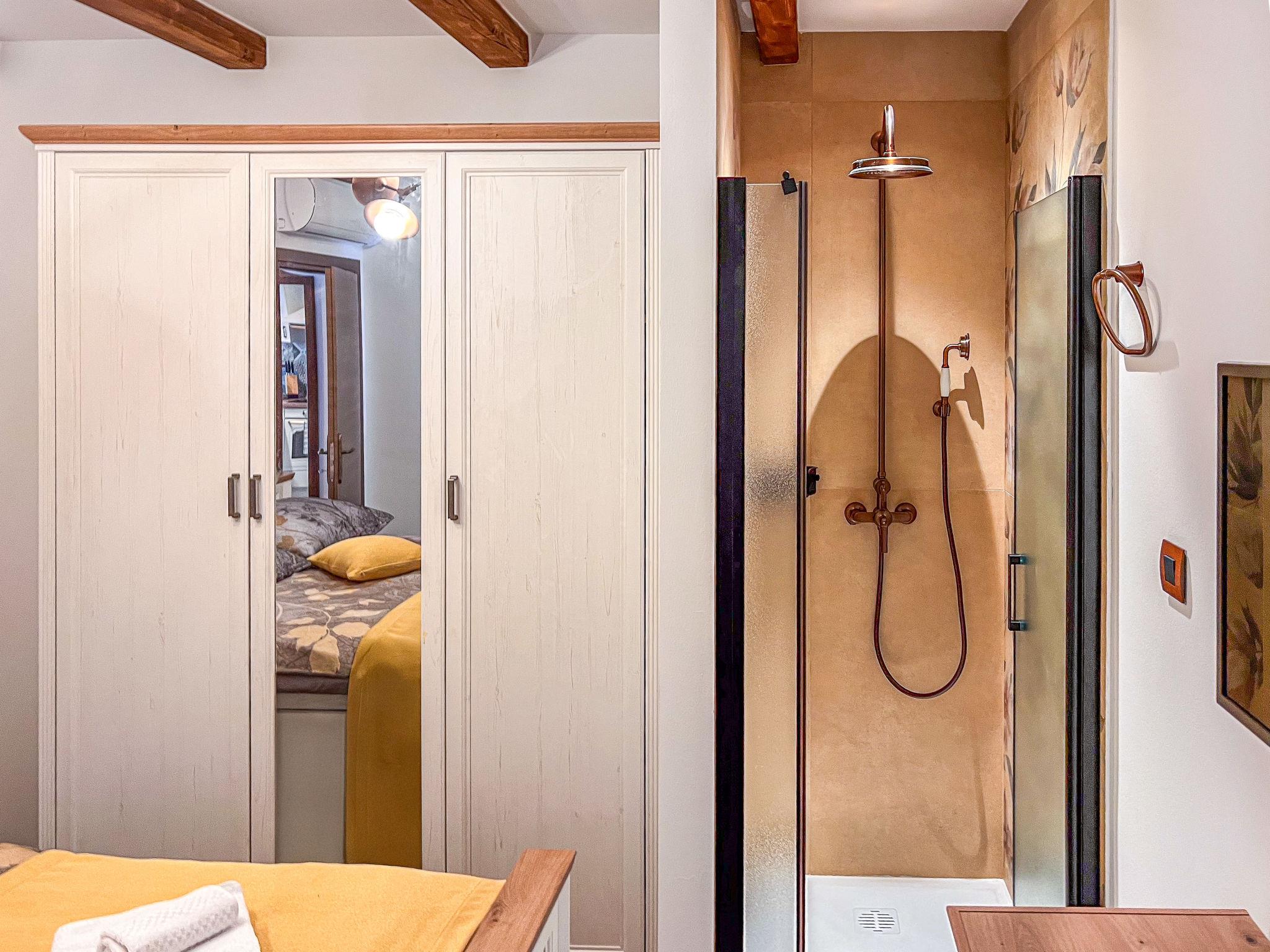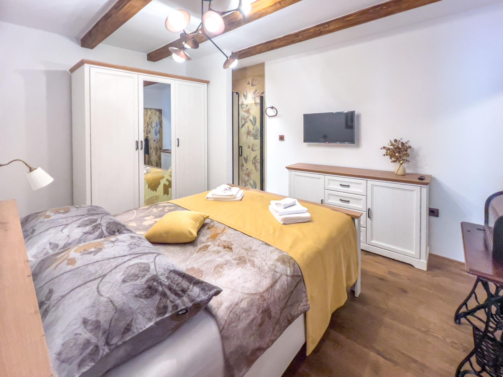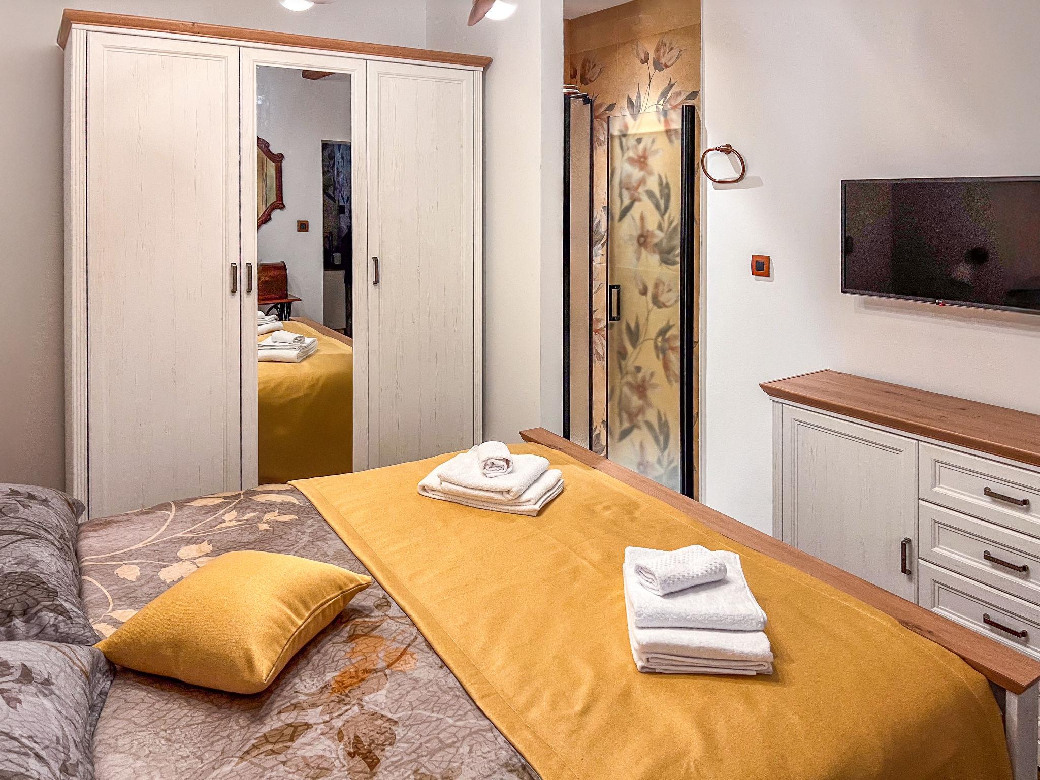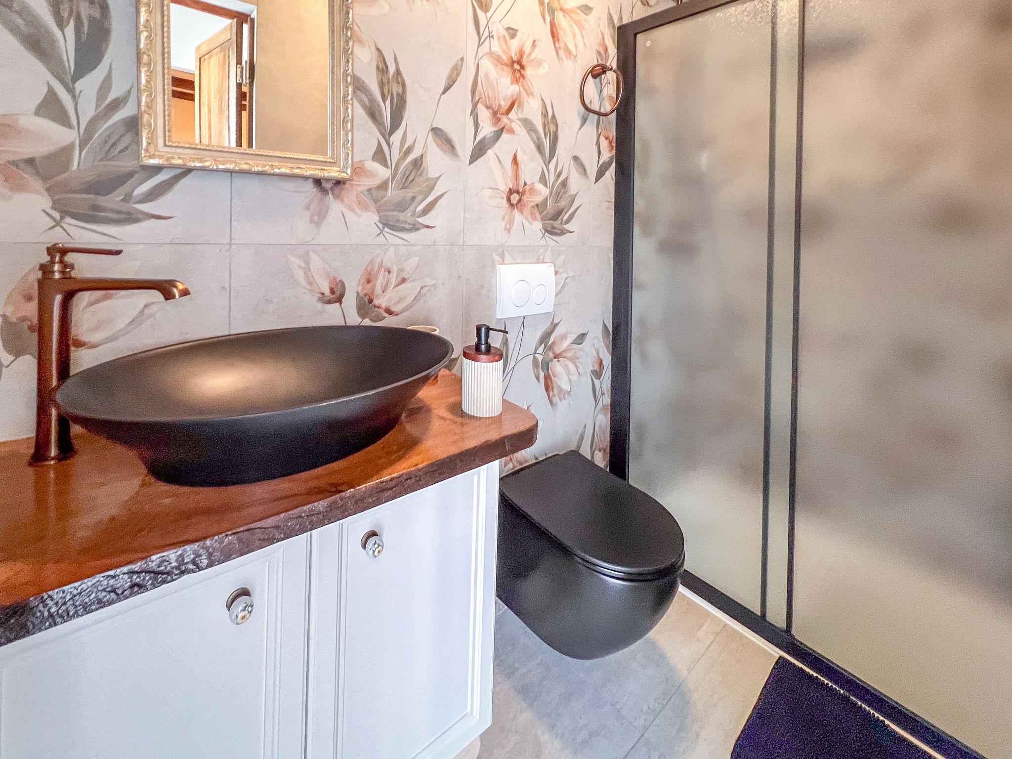 5-room house 110 m2 on 3 levels. Rustic furnishings: living/dining room with 1 double sofabed (140 cm, length 190 cm), open-hearth fireplace and satellite TV (flat screen), air conditioning. Exit to the terrace. 1 room with 1 french bed (160 cm, length 200 cm), shower/WC and satellite TV (flat screen), air conditioning. Open kitchen (oven, dishwasher, 4 ceramic glass hob hotplates, toaster, kettle, microwave, freezer, electric coffee machine). Wood heating, forced-air heating. Heating available only from 01.09. to 31.05. Upper floor: 1 room with 1 french bed (180 cm, length 200 cm), shower/WC and satellite TV (flat screen), air conditioning. Exit to the balcony. 1 room with 1 french bed (180 cm, length 200 cm), bath/shower/WC and satellite TV (flat screen), air conditioning. Exit to the balcony. Forced-air heating. Heating available only from 01.09. to 31.05. 2 small balconies 3 m2, terrace 25 m2, roofed. Terrace furniture. View of the swimming pool and the forest. Facilities: safe, iron, mosquito net, children's high chair, baby cot, hair dryer. Internet (WiFi, free). Please note: maximum 1 pet/ dog allowed. Fire extinguisher.
