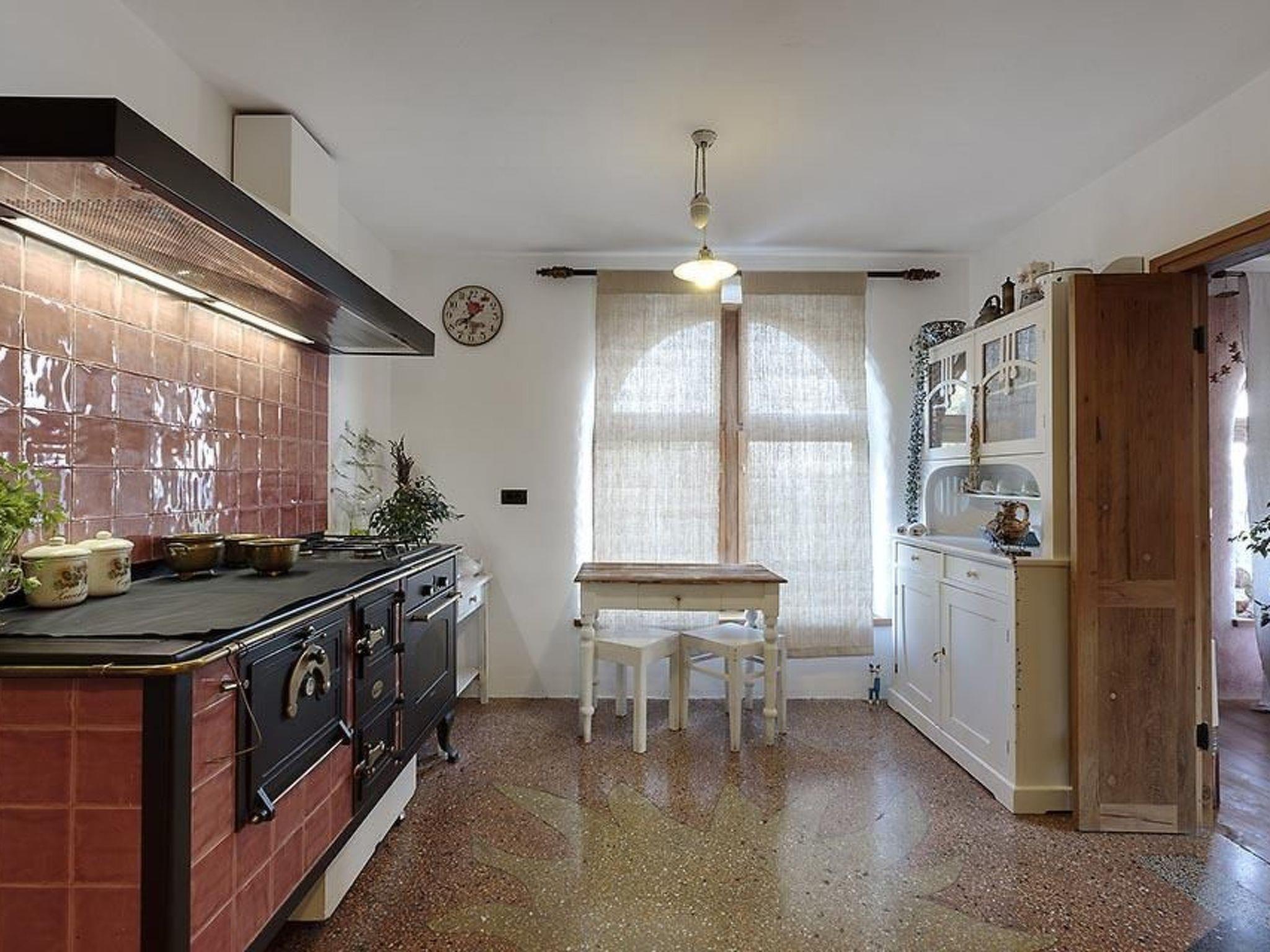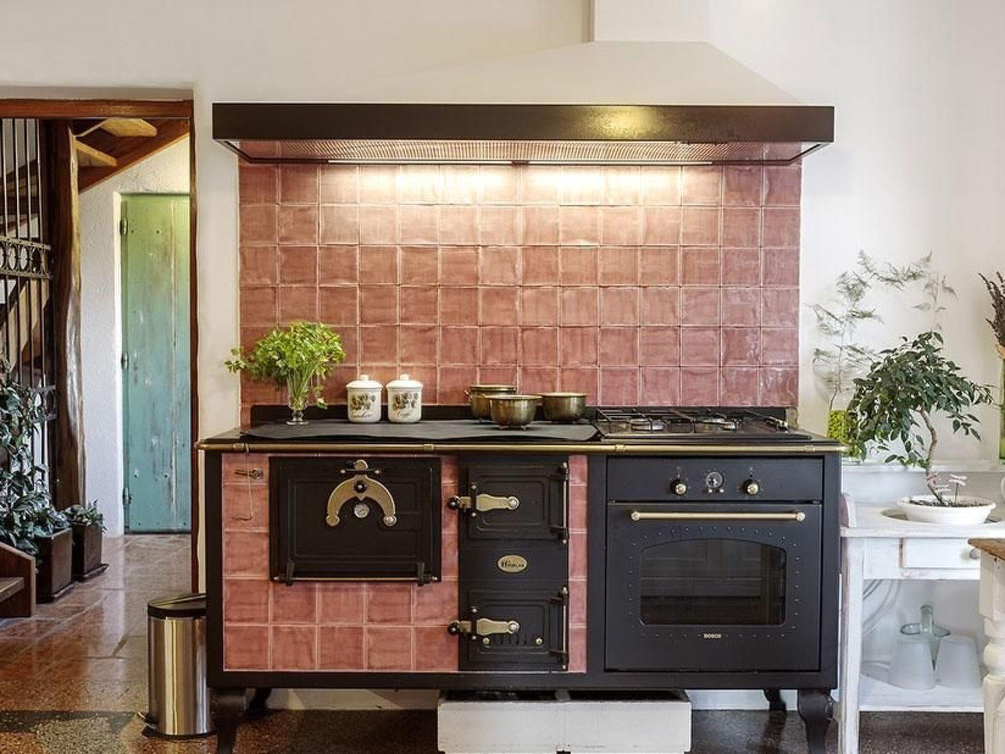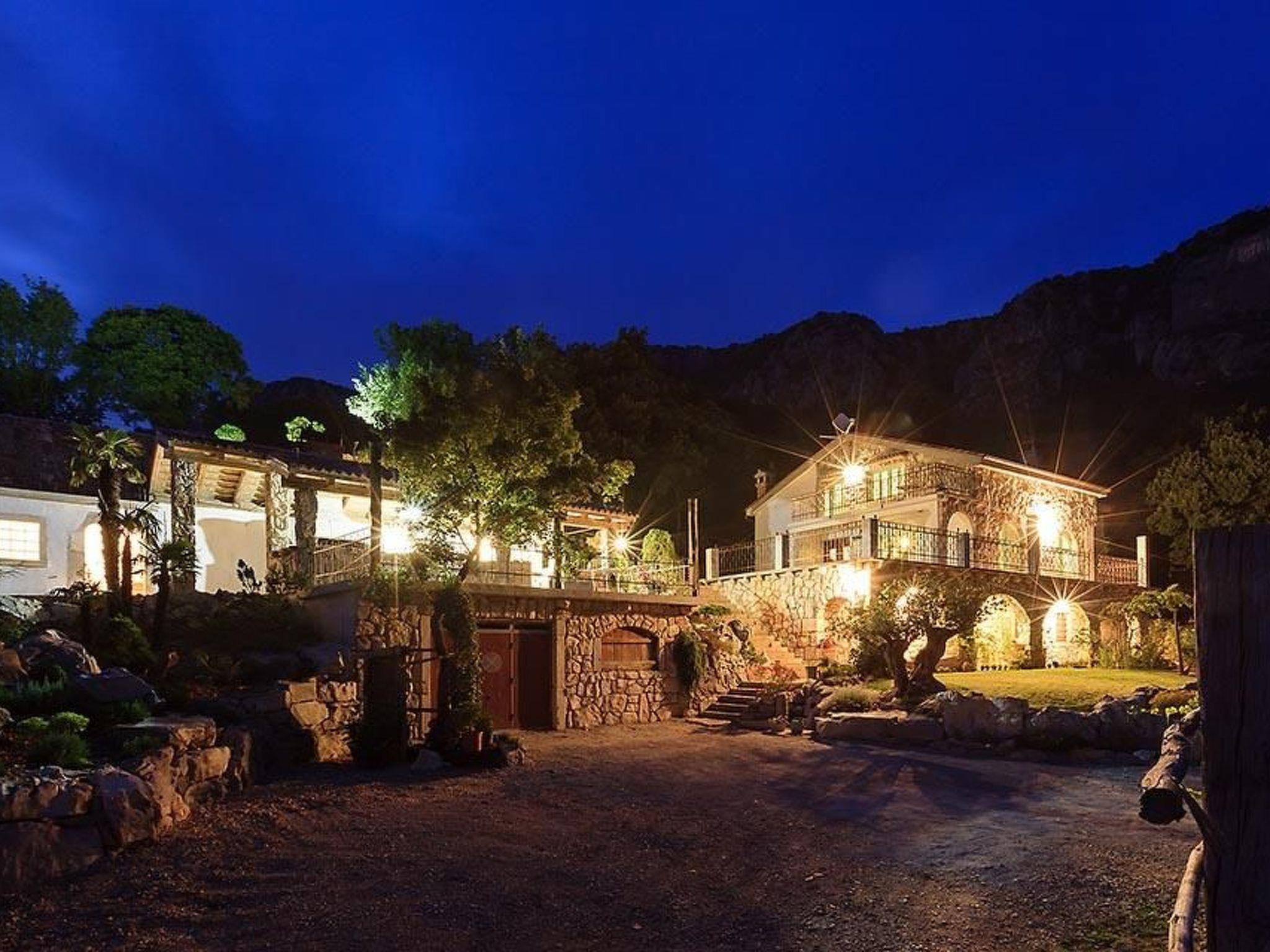 The extensive outdoor area offers spaces to relax and a unique view of the mountains and the sea. There is a big, roofed grill area with an outdoor kitchen and a wood-burning stove, where you can prepare meat and fish dishes. Twelve to fourteen people can sit at the big table, for grilling and enjoying a sociable drink on summer nights. Of course there is also a pool, where guests of all ages can have fun and cool off on hot days. There are plenty of parking spaces on site.