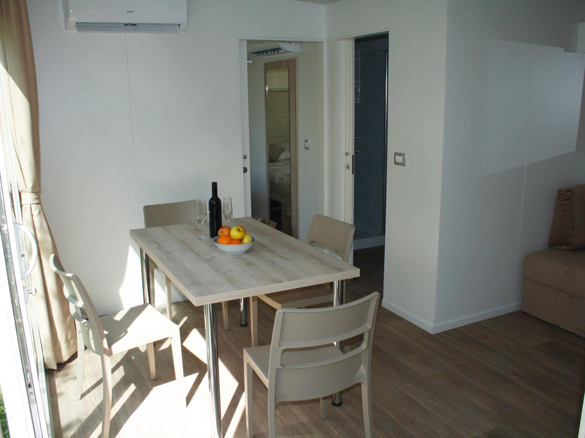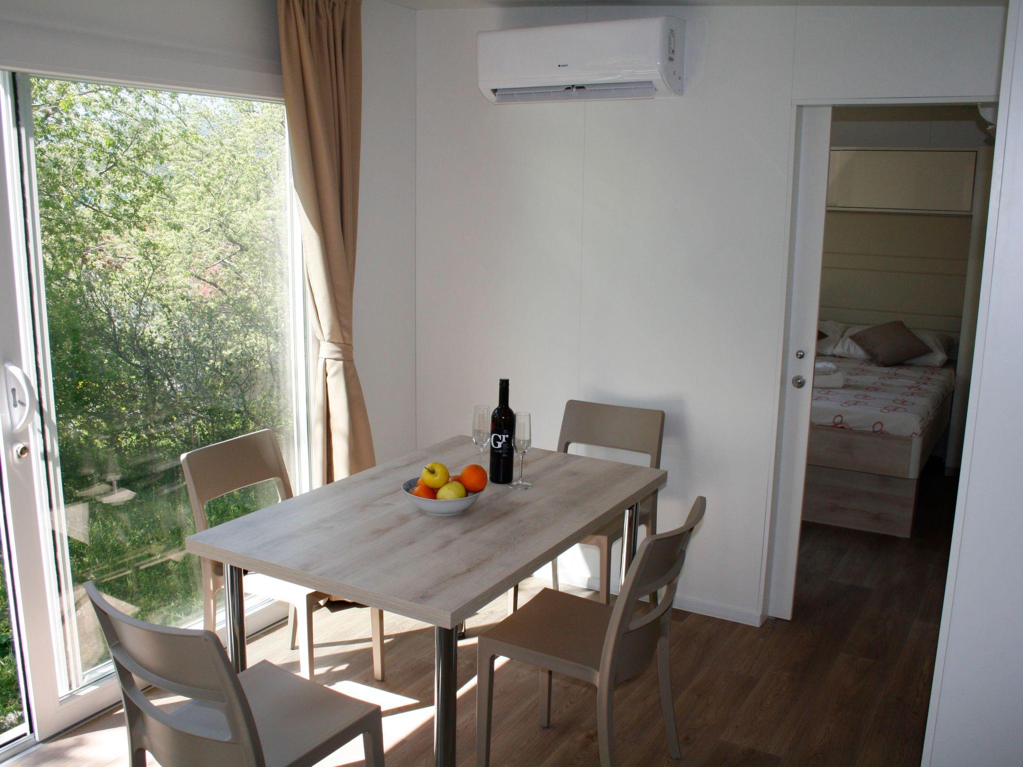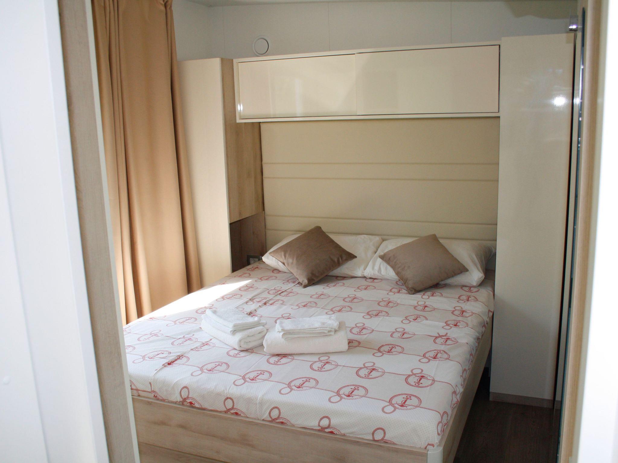Typ QUEEN CAMPAGNA 4+2 Premium zone Surface 38,80 m²; Manufacture year: 2017 Number of bedrooms: 2 (1 with double bed, 1 with 2 single beds) Kitchen/Living room (additional bed on corner furniture ) Bathroom/ Toilets : 2; Air conditioning; Wooden terrace Additional equipment: table + chairs on terrace, coffee machine, electric kettle, TV, microwave