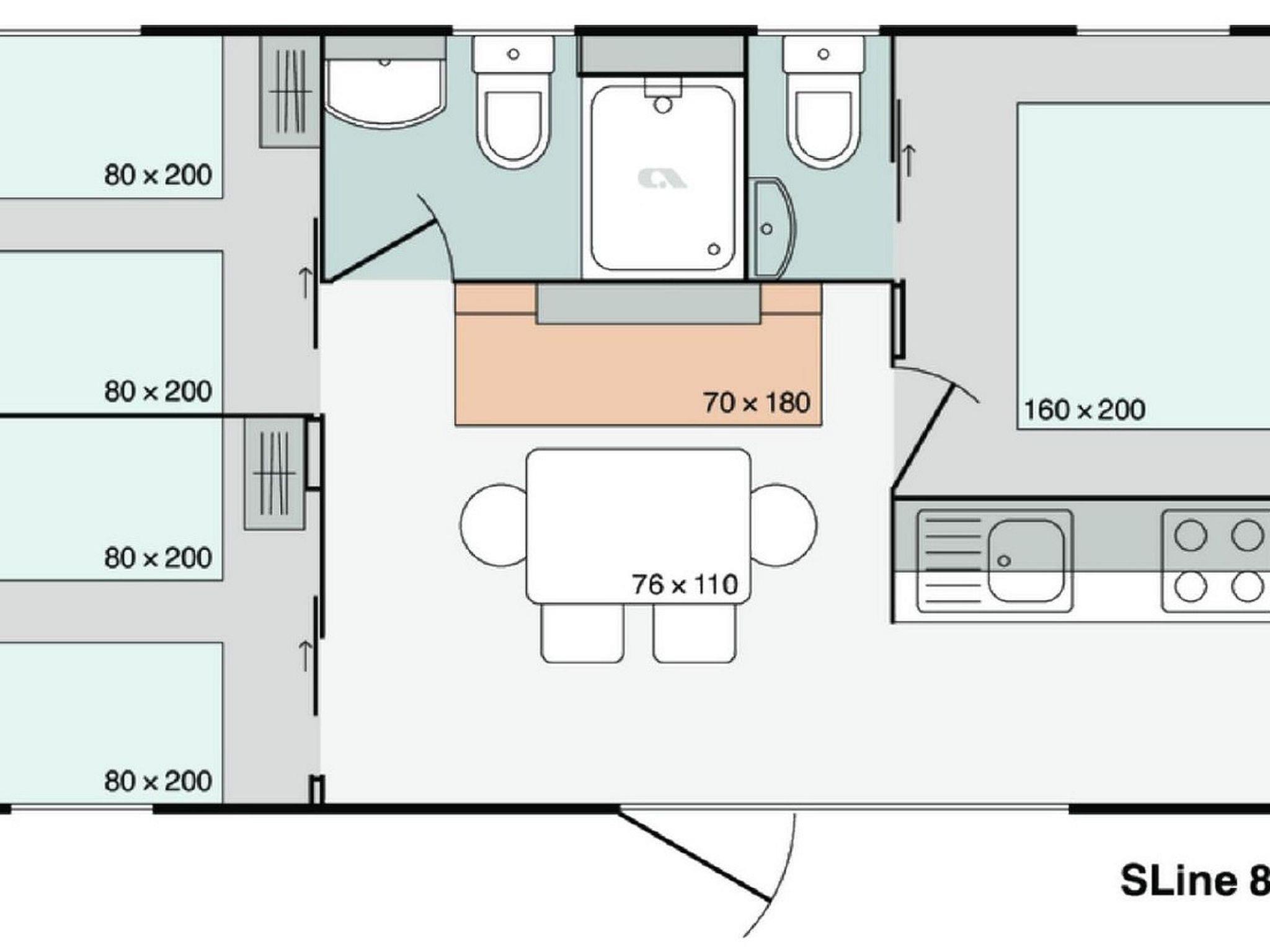 New mobile home for up to 7 people with a wooden terrace The comfortable mobile homes are fully-equipped. They measure 32m² and can accommodate up to 7 people (of which at least one is a child). There are 3 bedrooms, one with a double bed (160x 200m) and two with two single beds (80x 200m). Additional bed (70x 190m) in living room. Kitchen is equipped with cutlery and cooking utensils, fridge with freezer, hob with 4 burners, microwave oven, electric kettle, filter coffee machine. Guests have at disposal 1 bathroom (shower cabin, WC and sink) + an additional toilet. All units have air conditioning and TV.
