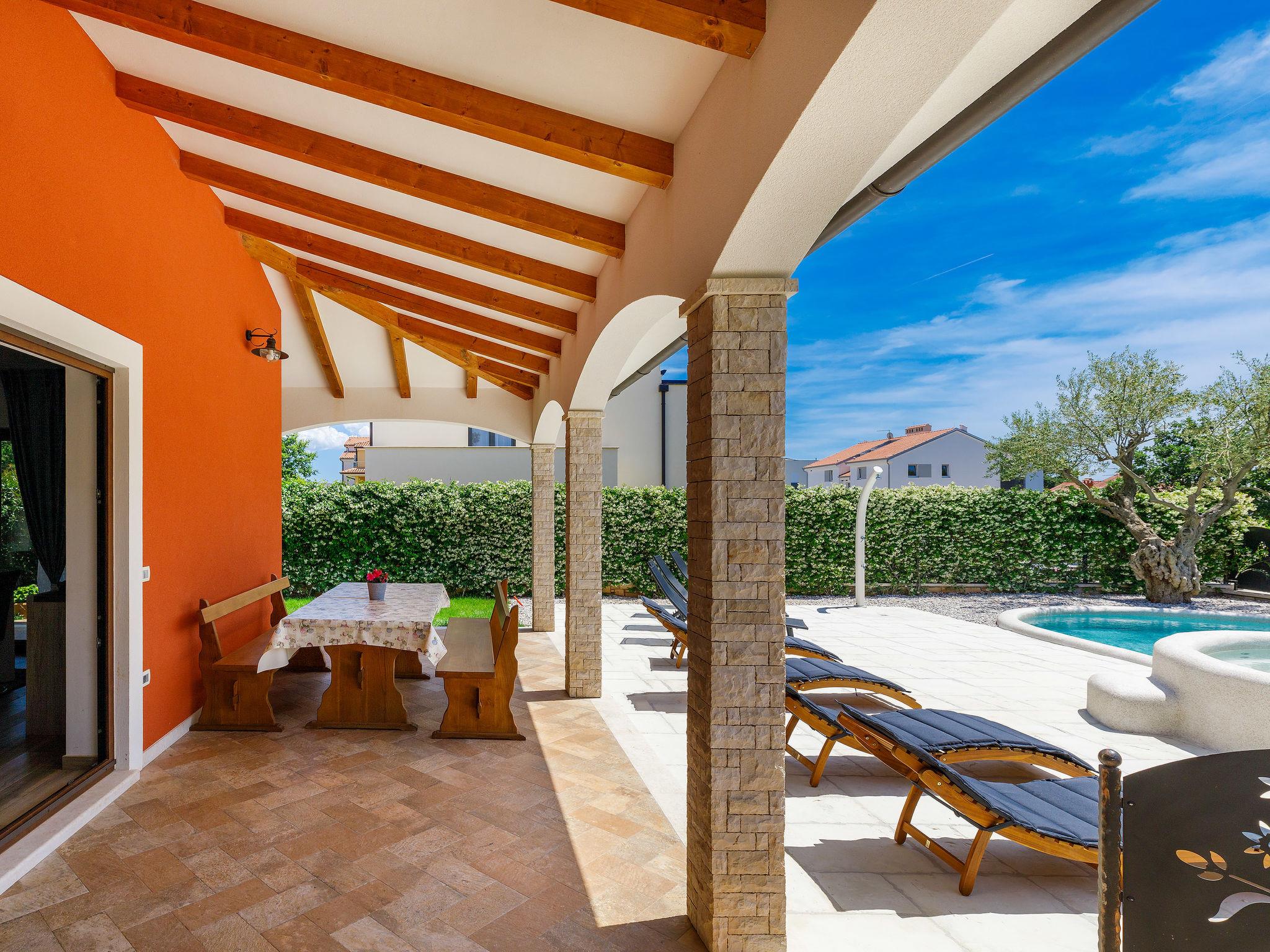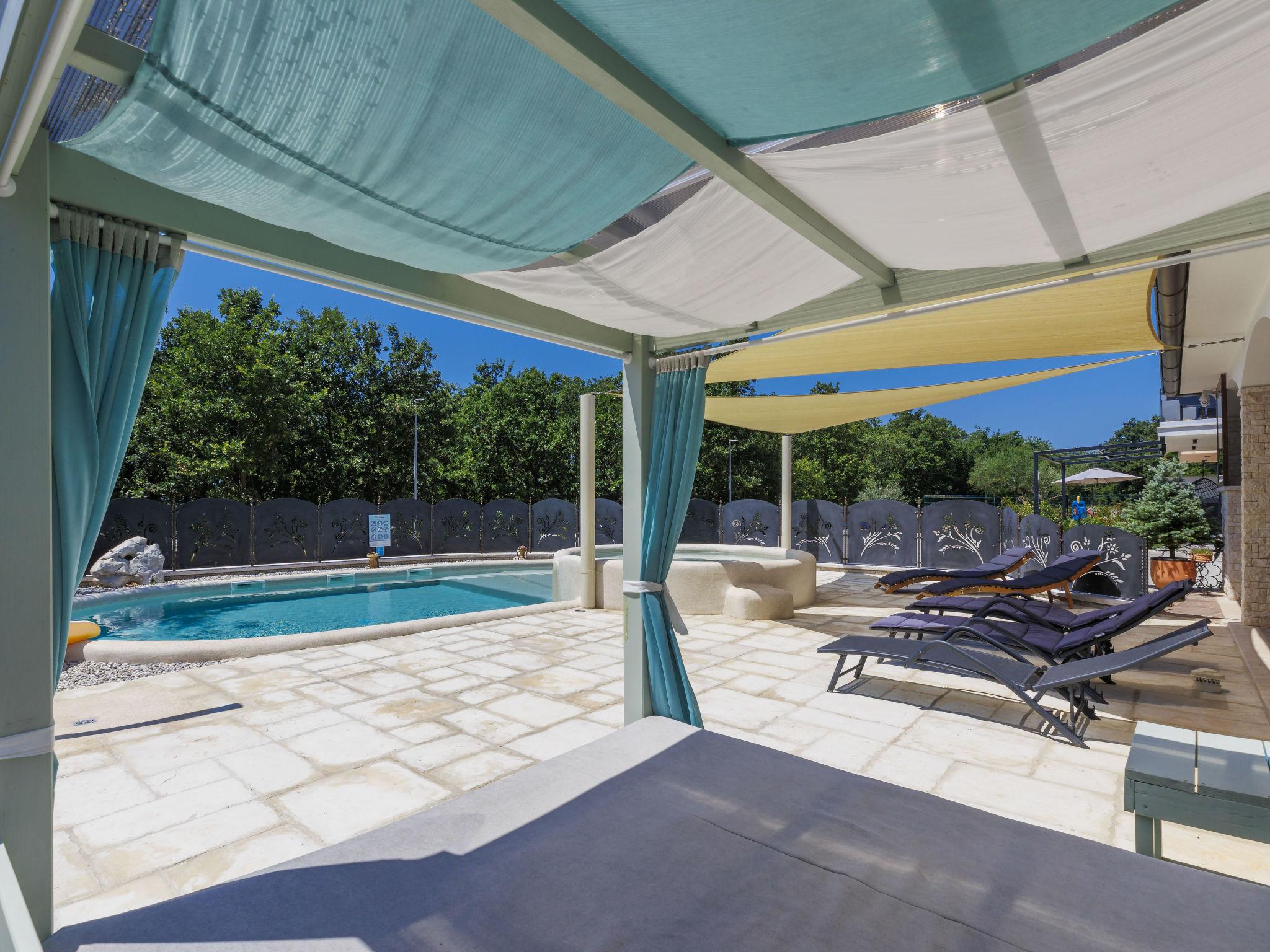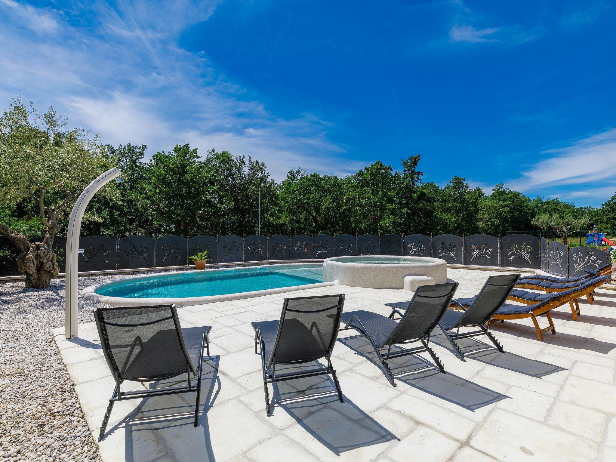 Beautiful single-family house "Villa Amaii", 2 storeys. In the hamlet Karigador 7 km from the centre of Novigrad, in a sunny position, 200 m from the sea, 300 m from the beach. Private: property 700 m2, garden with lawn, swimming pool kidney shaped, heated (40 m2, depth 15 - 140 cm, seasonal availability: 01.Jan. - 31.Dec.) with internal staircase. Outdoor shower, barbecue. In the house: internet access, washing machine. Parking (for 3 cars) at the house on the premises. Supermarket 400 m, restaurant 200 m, bus stop 550 m, pebble beach, rocky beach 300 m. Walking paths from the house 100 m, cycle lane 150 m. Please note: suitable for families. The owner does not accept any youth groups. Neighbourhood highly sensitive to noise. Quietness and good behaviour expected. Swimming pool with hydromassage. Swimming pool heated (extra). It is necessary to announce 7 days in advance if the pool heating is required. Video surveillance of the driveway and parking.