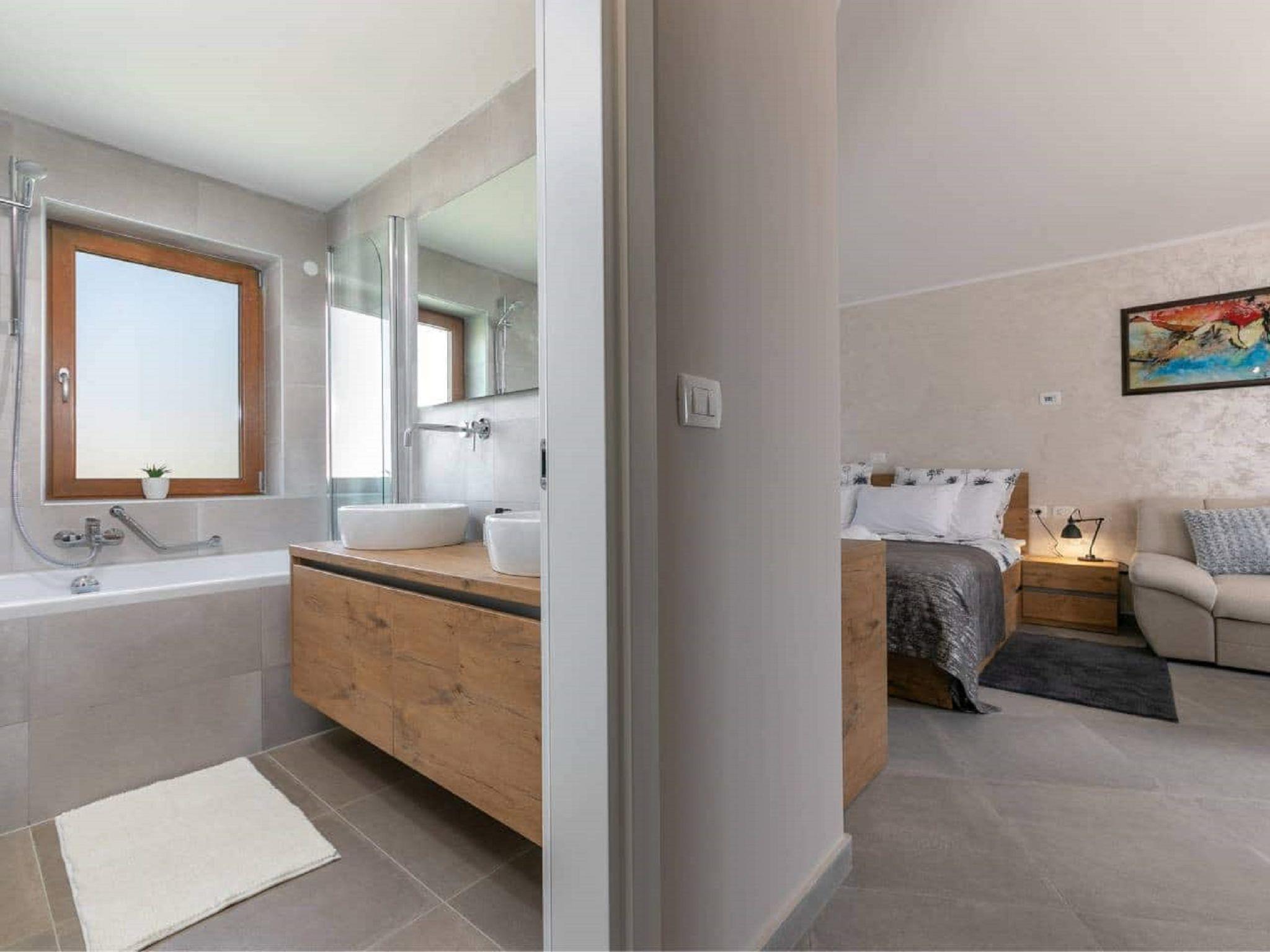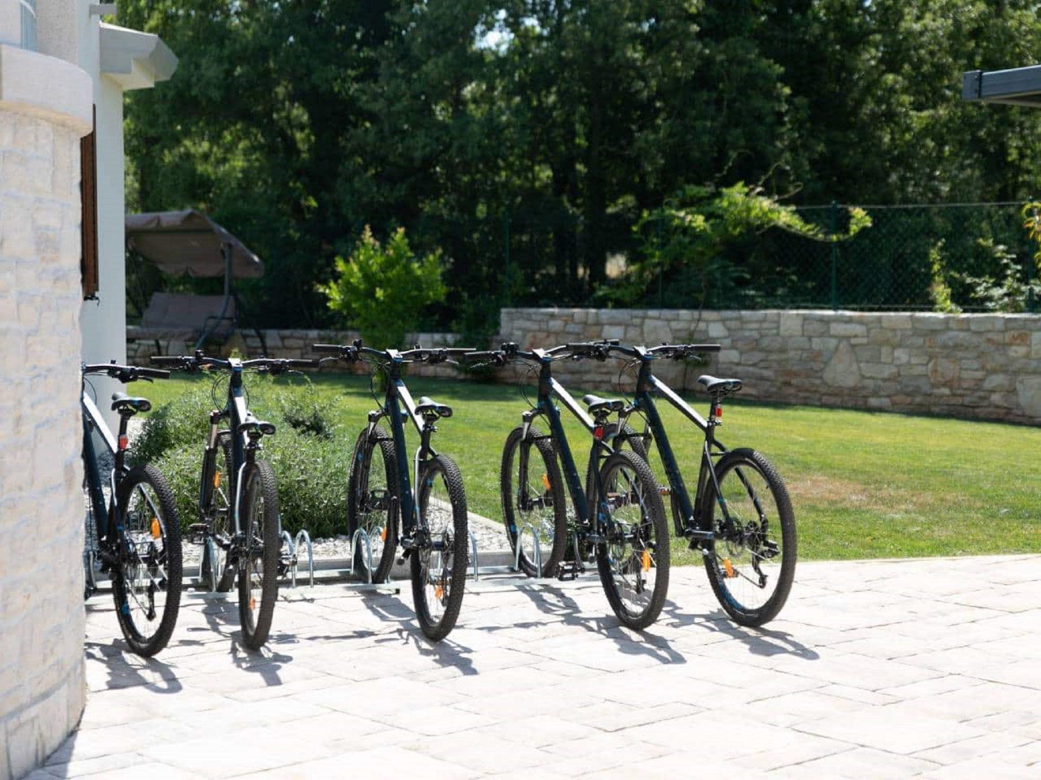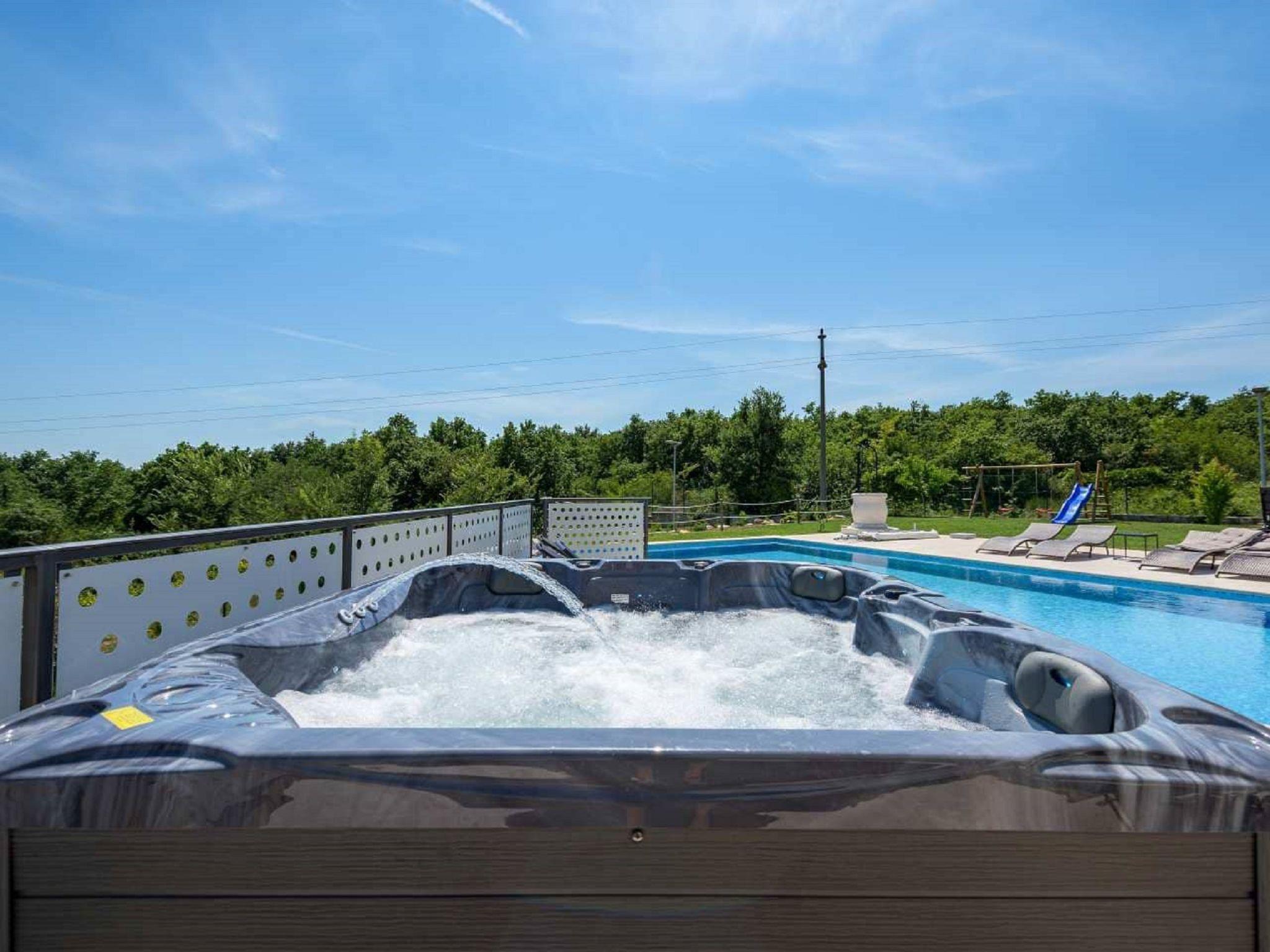 Modern, beautiful villa "San Lorenzo", 4 storeys. 500 m from the centre of Nova Vas, 3 km from the centre of Brtonigla, 8 km from the centre of Novigrad, in a sunny position, 8 km from the sea. Private: property 2'500 m2 (fenced), garden with lawn and wildlife garden, pond, swimming pool, indoor pool angular (4 x 5 m, depth 100 cm, seasonal availability: 01.Mar. - 20.Jun. and 20.Aug. - 01.Nov.) with internal staircase. Outdoor shower, hot tub, table tennis, terrace (50 m2), garden furniture, barbecue (slide, swing). In the house: internet access, sauna, fitness room, trampoline, washing machine. Available: bicycles (10). Room cleaning daily on request (extra). Cook on request (extra). Roofed, parking (for 5 cars) at the house on the premises. Shop 500 m, restaurant 600 m, bus stop 2.9 km, pebble beach 8 km. Golf course (18 hole) 25 km. Nearby attractions: Aquapark 2 km. Massage (extra) on request. Private: swimming pool angular (16 x 6 m, depth 130-150 cm, 01.03.-01.11.) with internal staircase. Available wine cellar (extra). The housekeeper comes between 8:00 and 9:00 a.m. to maintain the pond. Video surveillance of the driveway and parking.