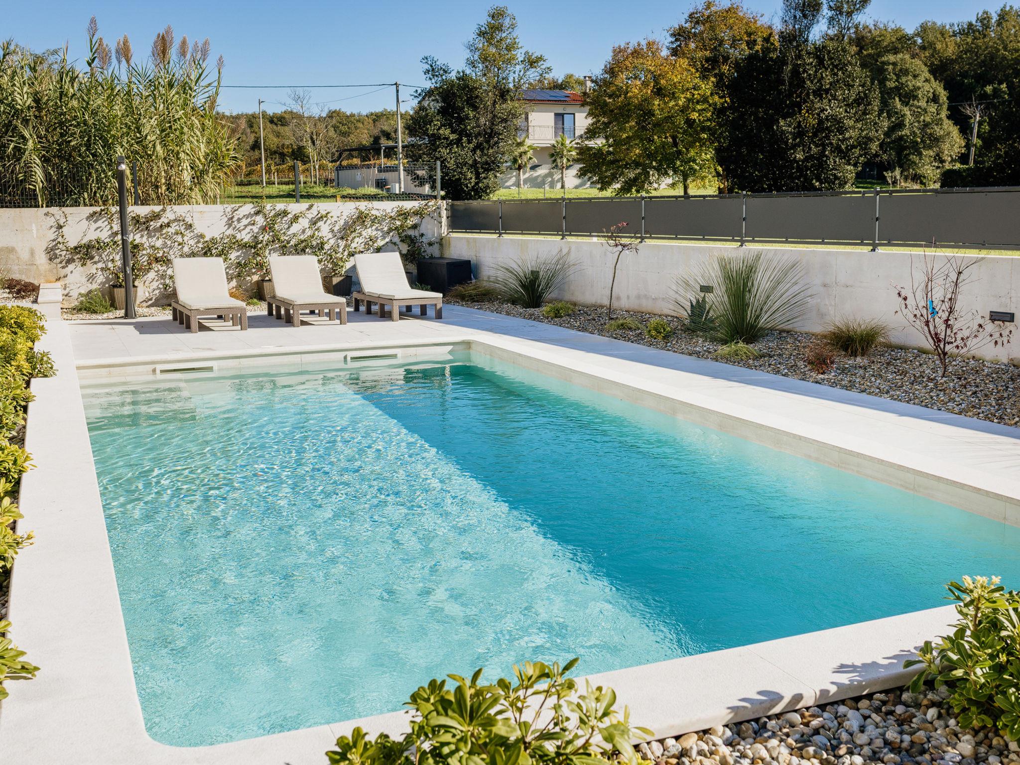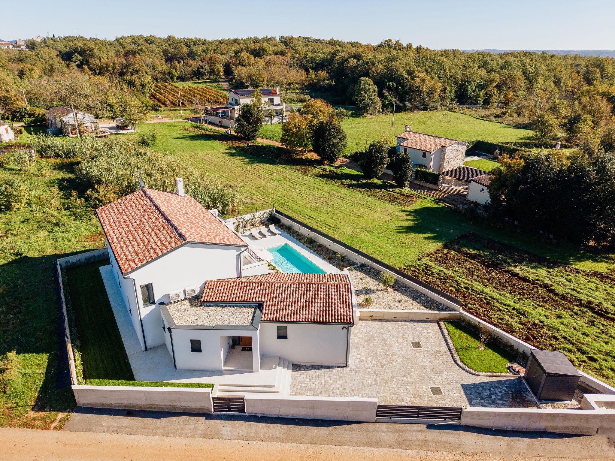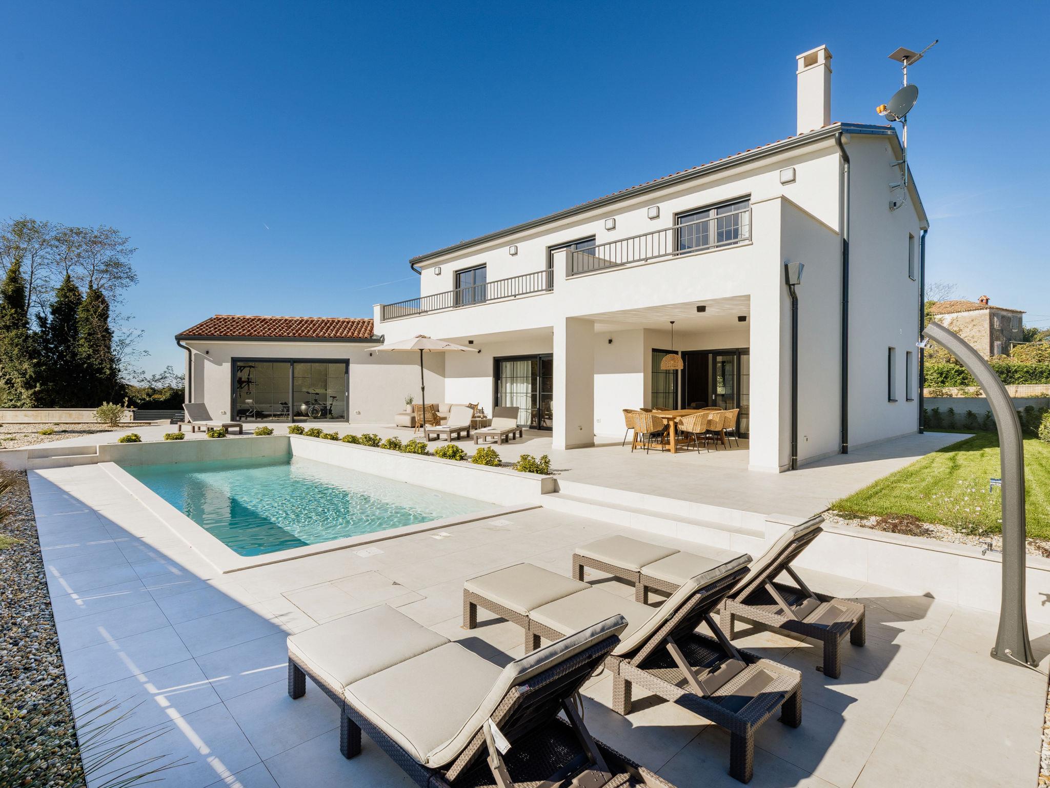 Beautiful, luxurious villa "Nina", 2 storeys, built in 2025. In the hamlet Pavici 1 km from the centre of Nova Vas, 3 km from the centre of Brtonigla, 7 km from the centre of Novigrad, in a quiet, sunny position, 8 km from the sea, 8 km from the beach. Private: property 500 m2 (fenced), garden with lawn, swimming pool angular (9 x 4 m, depth 145 cm, seasonal availability: 15.May. - 15.Sep.) with internal staircase. Outdoor shower, garden furniture, barbecue. In the house: internet access, washing machine. Parking (for 3 cars) at the house on the premises. Shop 1 km, supermarket 8 km, restaurant 1 km, bus stop 3.6 km, pebble beach 8 km, rocky beach 8 km. Walking paths from the house 500 m, cycle lane 550 m. Nearby attractions: Aquapark 2 km.