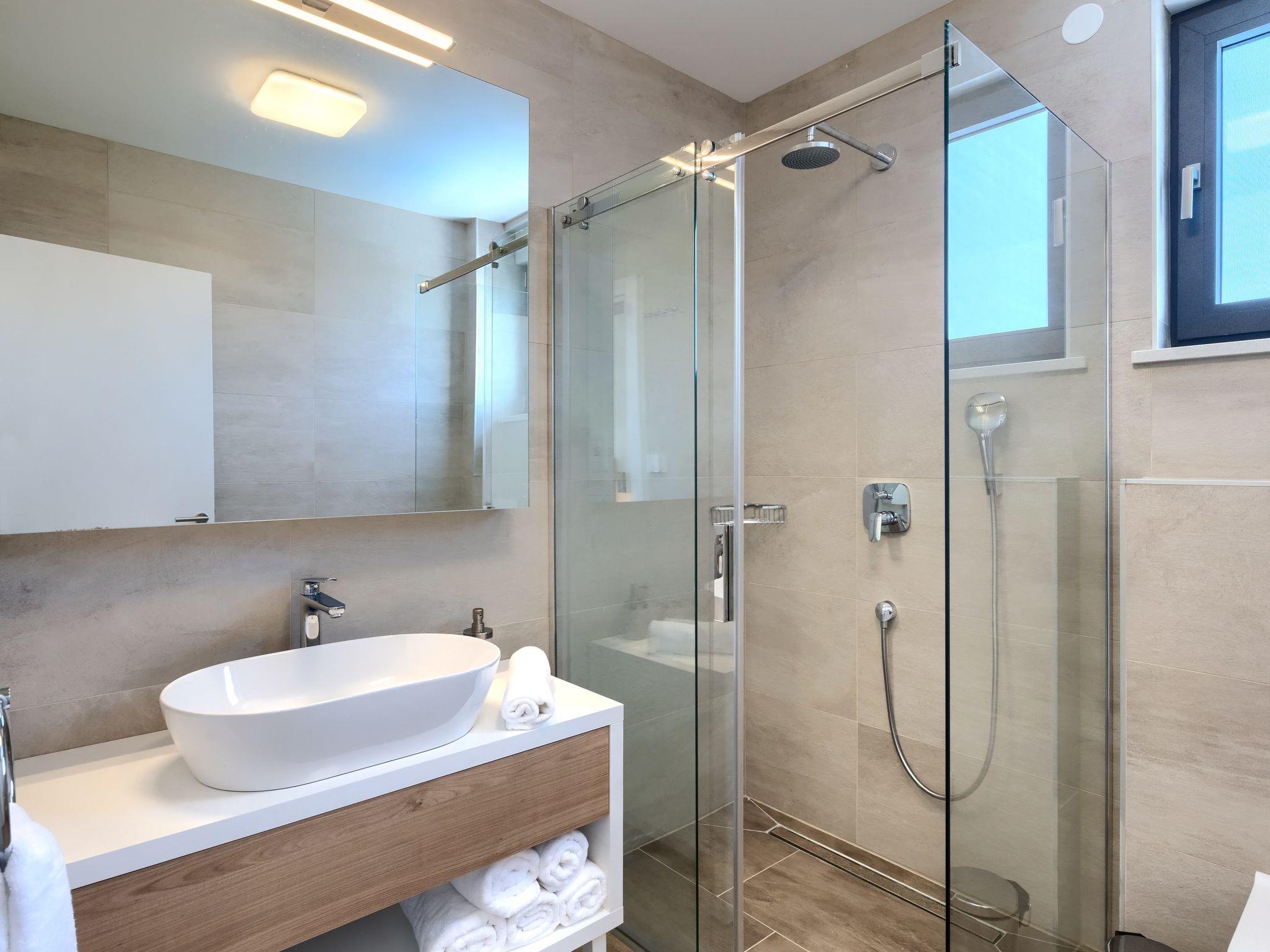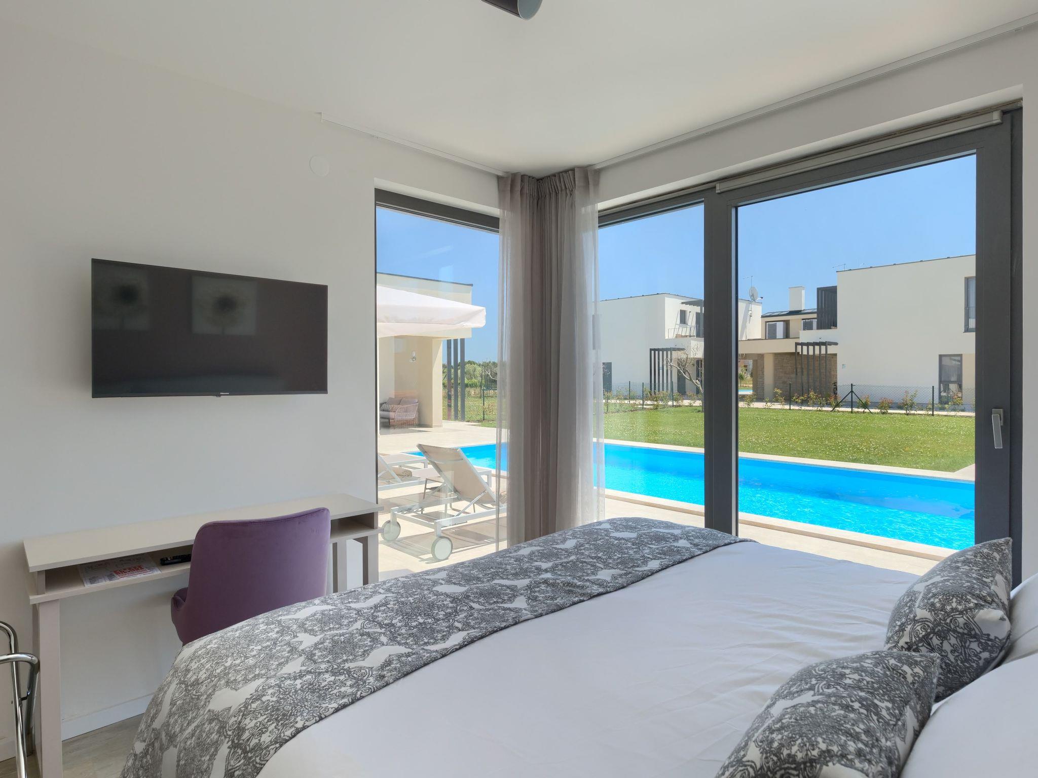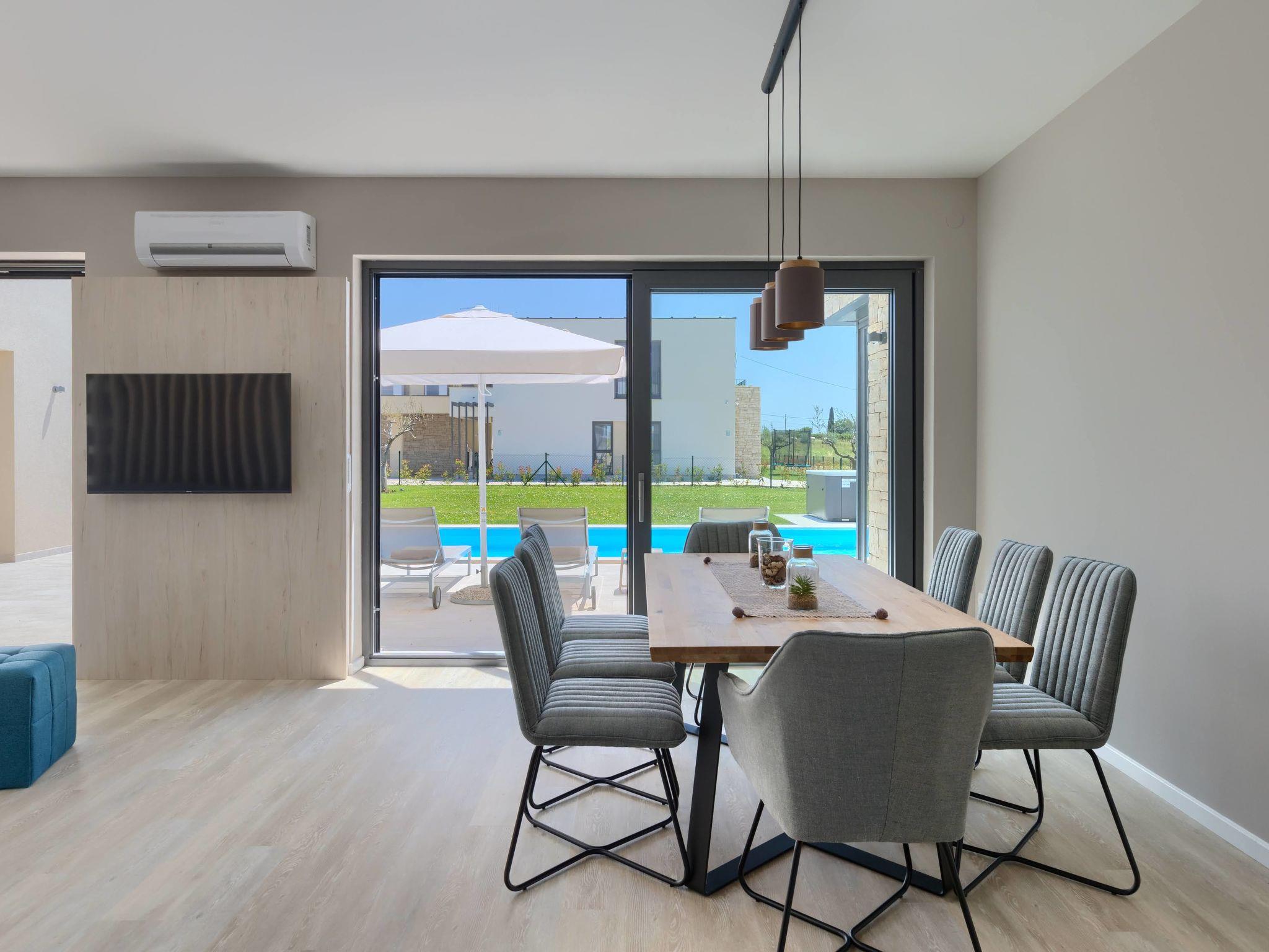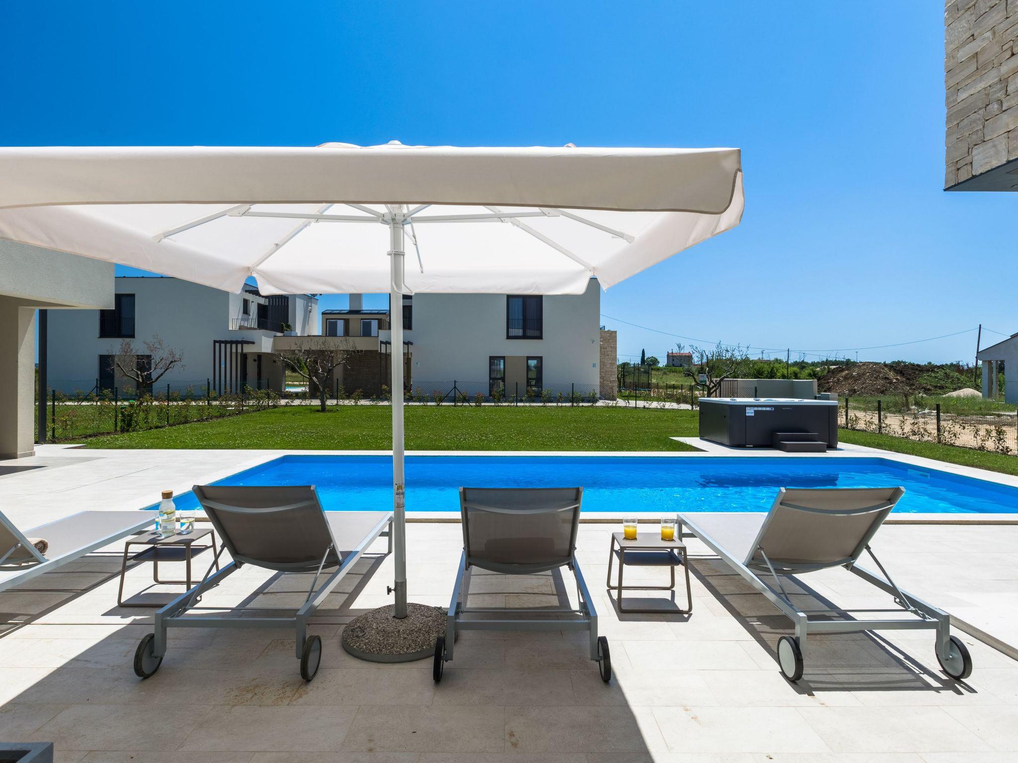 Luxurious villa "Bella", 2 storeys, built in 2021. 1 km from the centre of Nova Vas, 2 km from the centre of Brtonigla, 10 km from the centre of Novigrad, 8.2 km from the sea. Private: property 900 m2 (fenced) with lawn, swimming pool angular, heated (4 x 10 m, depth 135 cm, seasonal availability: 10.Apr. - 01.Nov.) with internal staircase. Outdoor shower, hot tub, badminton, terrace (10 m2), garden furniture, barbecue house. In the house: internet access, trampoline, washing machine, bicycles available. Available: bicycles (2), children's bicycles (1). Motor access (500 m via unmade road). Parking (for 3 cars) at the house on the premises. Shop 1.5 km, restaurant 650 m, bus stop 4 km, pebble beach 8.2 km. Walking paths from the house, cycle lane 100 m. Nearby attractions: Aquapark 2 km. Groups of teenagers on request only. Please note: airfield 20 km from the property. Swimming pool heated (extra). Video surveillance of the driveway and parking.