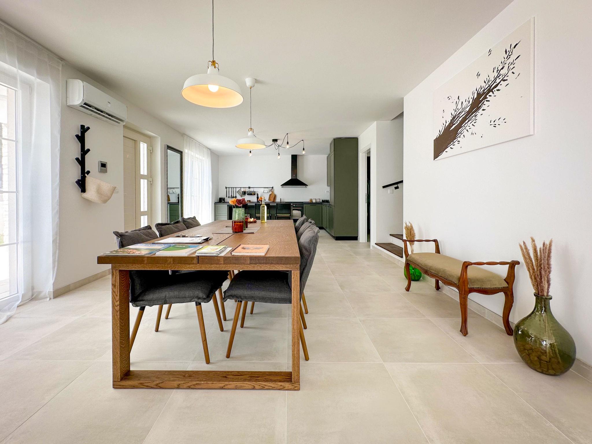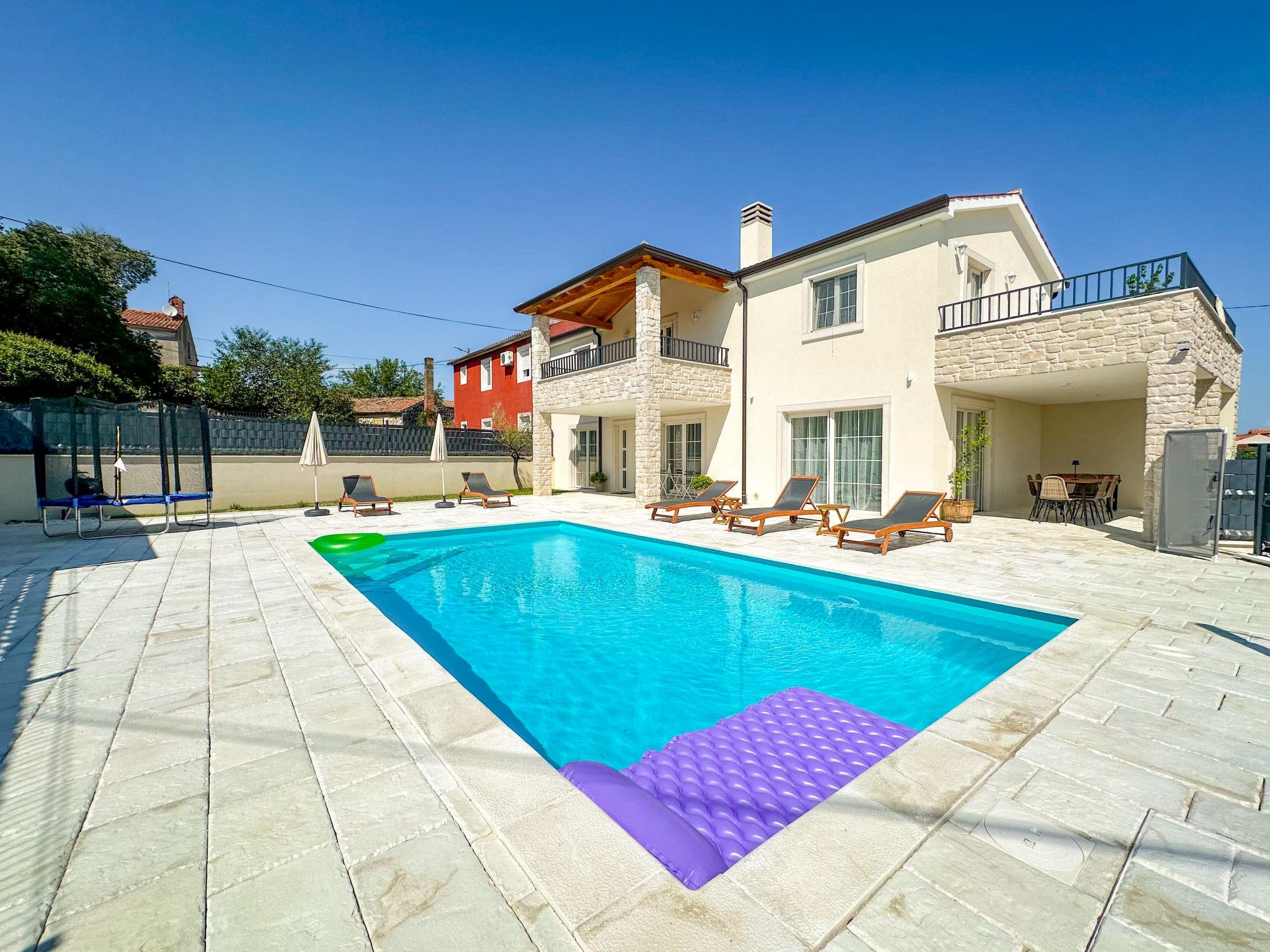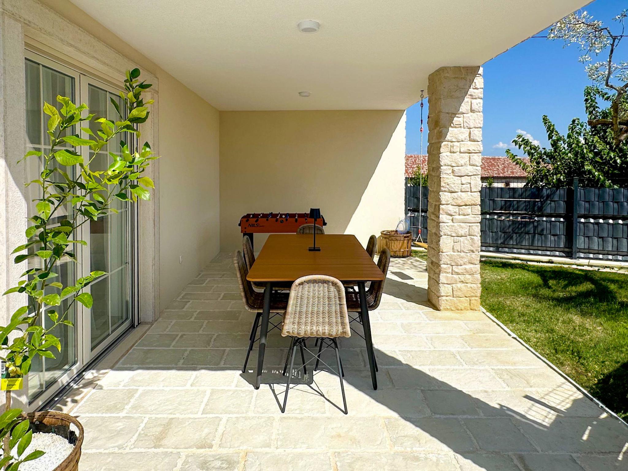 Beautiful terraced house "Villa Gaudeo", 2 storeys, renovated in 2024. In the hamlet Nova Vas 2.5 km from the centre of Brtonigla, 8 km from the centre of Novigrad, in a quiet, sunny position, 8 km from the sea. Private: property 500 m2 (fenced), swimming pool (8 x 4 m, depth 150 cm, seasonal availability: 01.May. - 30.Sep.) with internal staircase. Outdoor shower, garden furniture, barbecue (swing), pool maintenance by the owner/gardener. In the house: internet access, table football, trampoline. Parking (for 2 cars) at the house on the premises. Shop 200 m, supermarket 8 km, restaurant 200 m, bus stop 8 km, railway station 35 km, pebble beach 8 km, rocky beach 8 km. Golf course (18 hole) 24 km, walking paths from the house 50 m, cycle lane 100 m. Nearby attractions: aquapark 3 km. The owner does not accept any groups. The owner does not accept any youth groups. Neighbourhood highly sensitive to noise. Quietness and good behaviour expected.