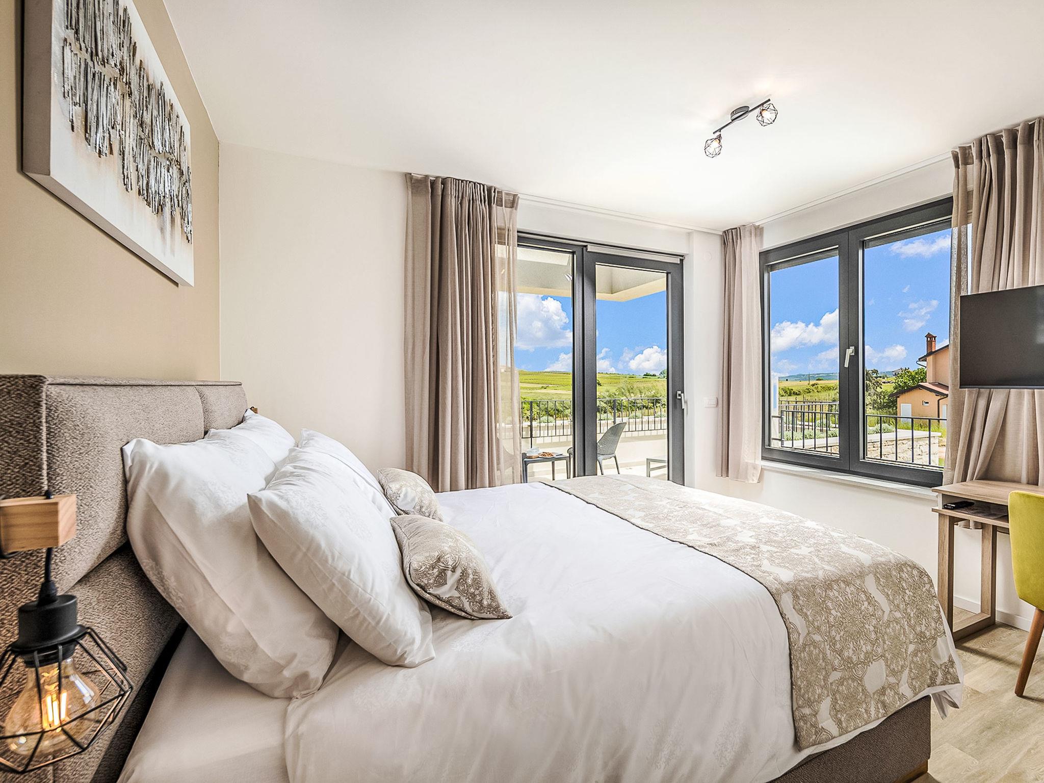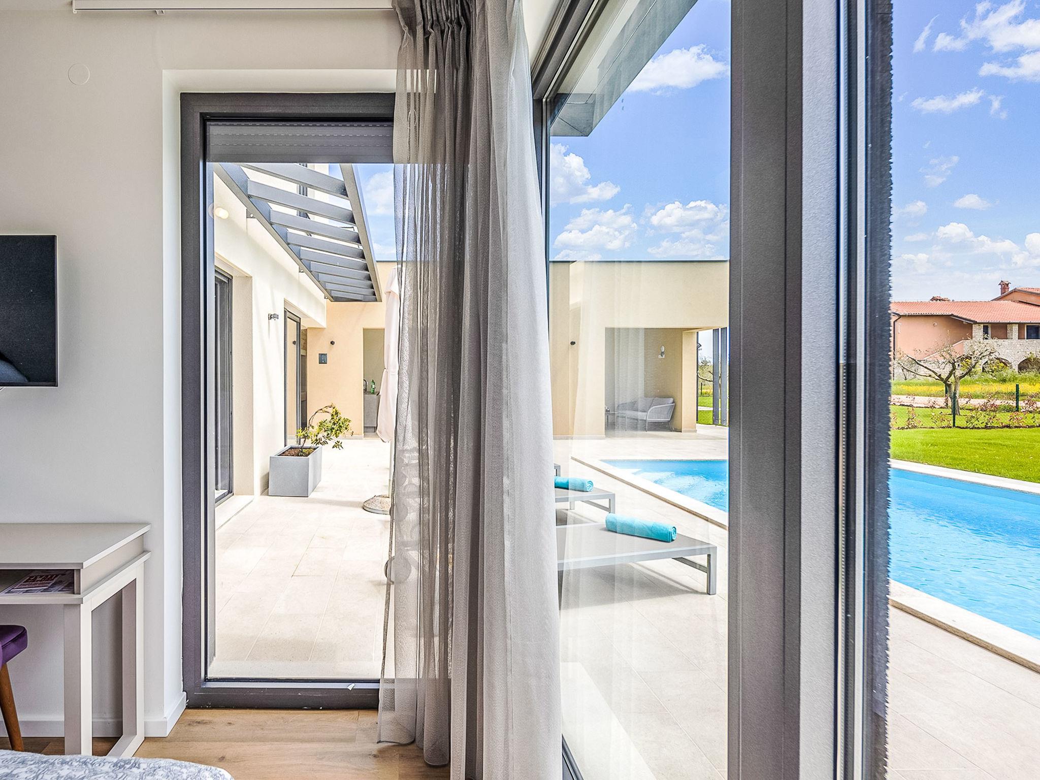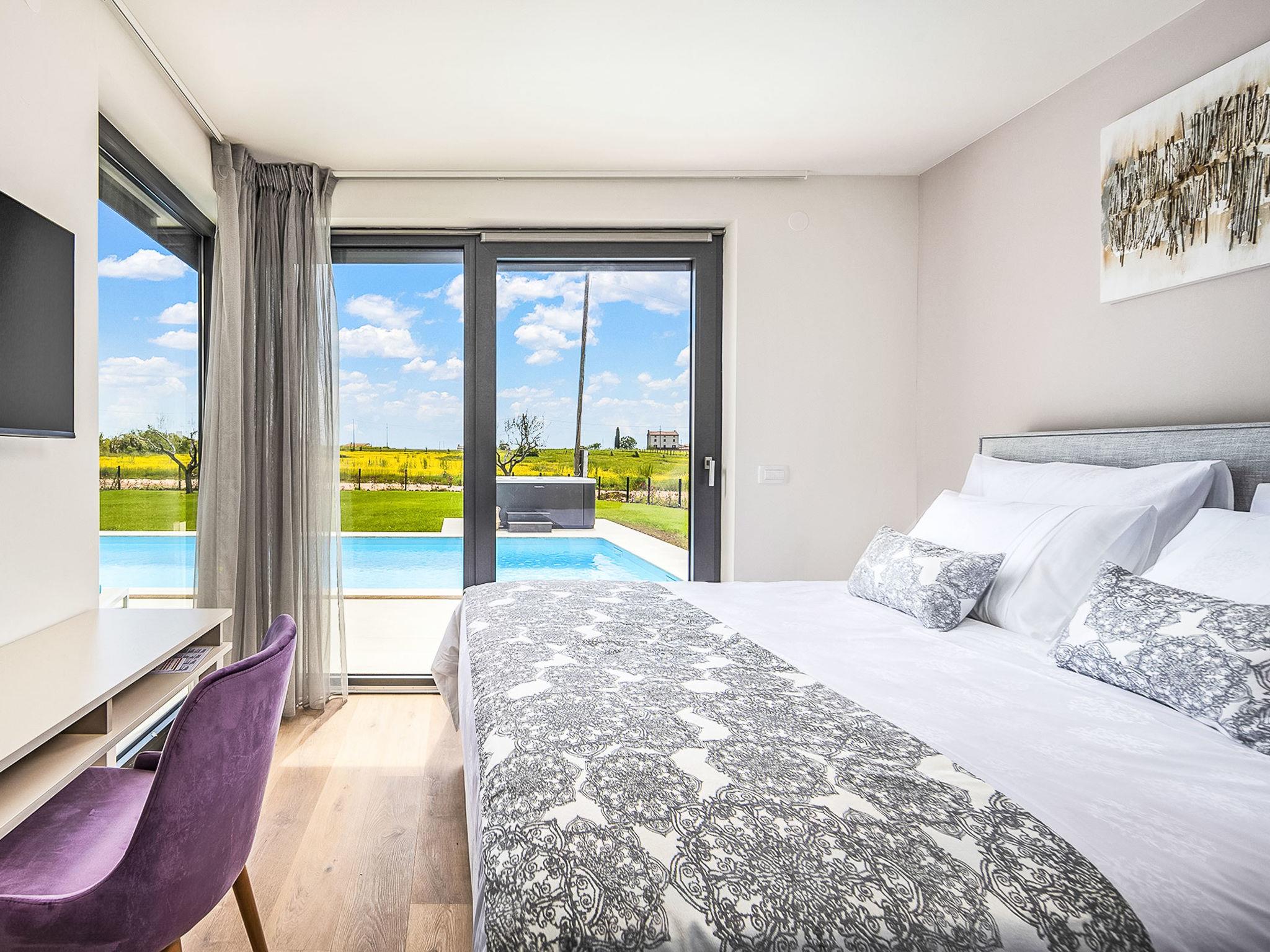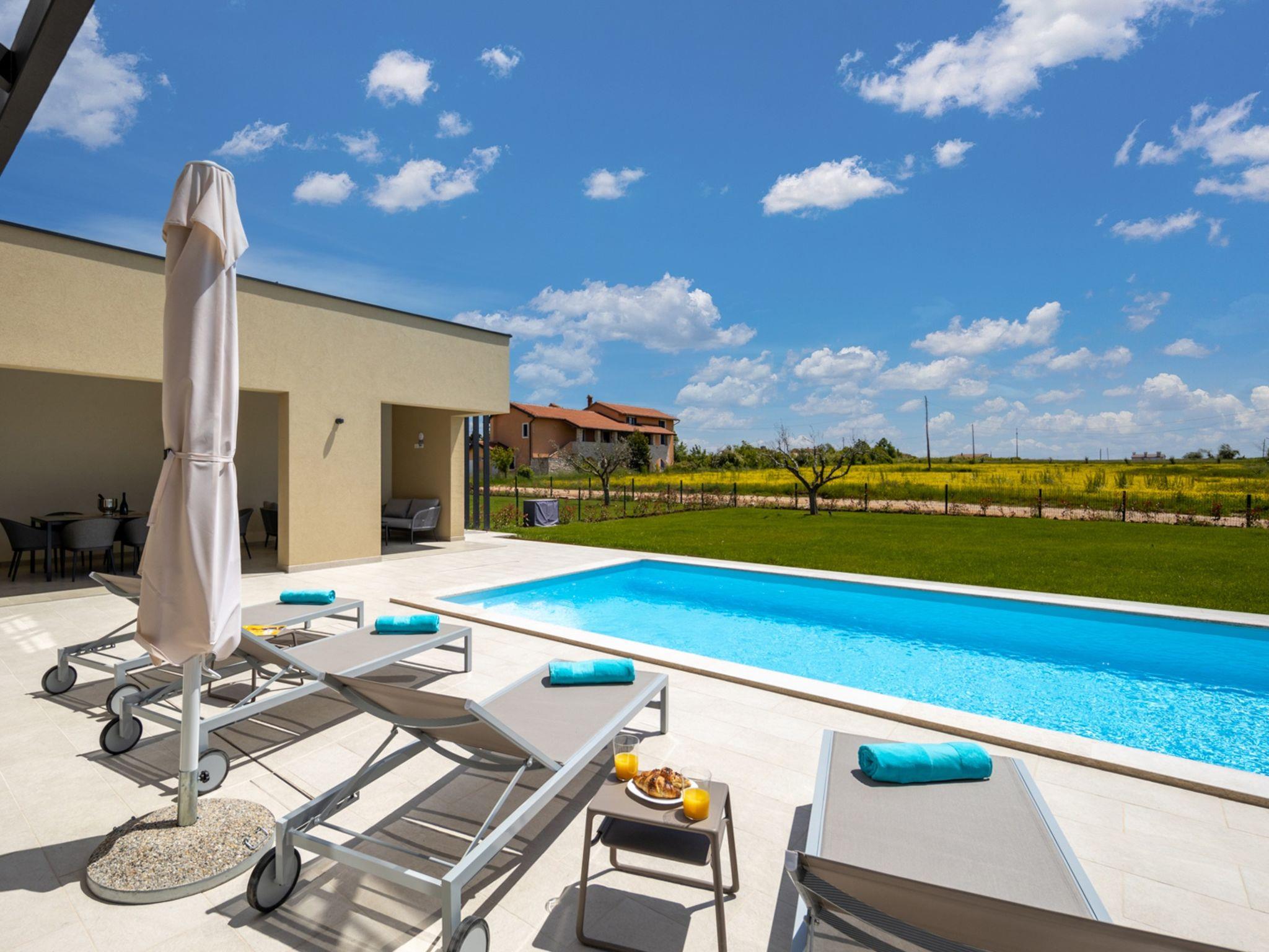 Luxurious villa "Stella & Alba", 2 storeys, built in 2021. 1 km from the centre of Nova Vas, 2 km from the centre of Brtonigla, 10 km from the centre of Novigrad, 8.2 km from the sea. Private: property 1'800 m2 (fenced) with lawn, 2 swimming pools angular, heated (4 x 10 m, depth 135 cm, seasonal availability: 10.Apr. - 01.Nov.) with internal staircase. Outdoor shower, hot tub, badminton, terrace (10 m2), garden furniture, barbecue house. In the house: internet access, trampoline, washing machine, bicycles available. Available: bicycles (4), children's bicycles (2). Motor access (500 m via unmade road). Parking (for 6 cars) at the house on the premises. Shop 1.5 km, restaurant 650 m, bus stop 4 km, pebble beach 8.2 km. Walking paths from the house, cycle lane 100 m. Nearby attractions: Aquapark 2 km. Groups of teenagers on request only. Please note: airfield 20 km from the property. Swimming pool heated (extra). Video surveillance of the driveway and parking. The unit consists of 2 houses rented as one unit.