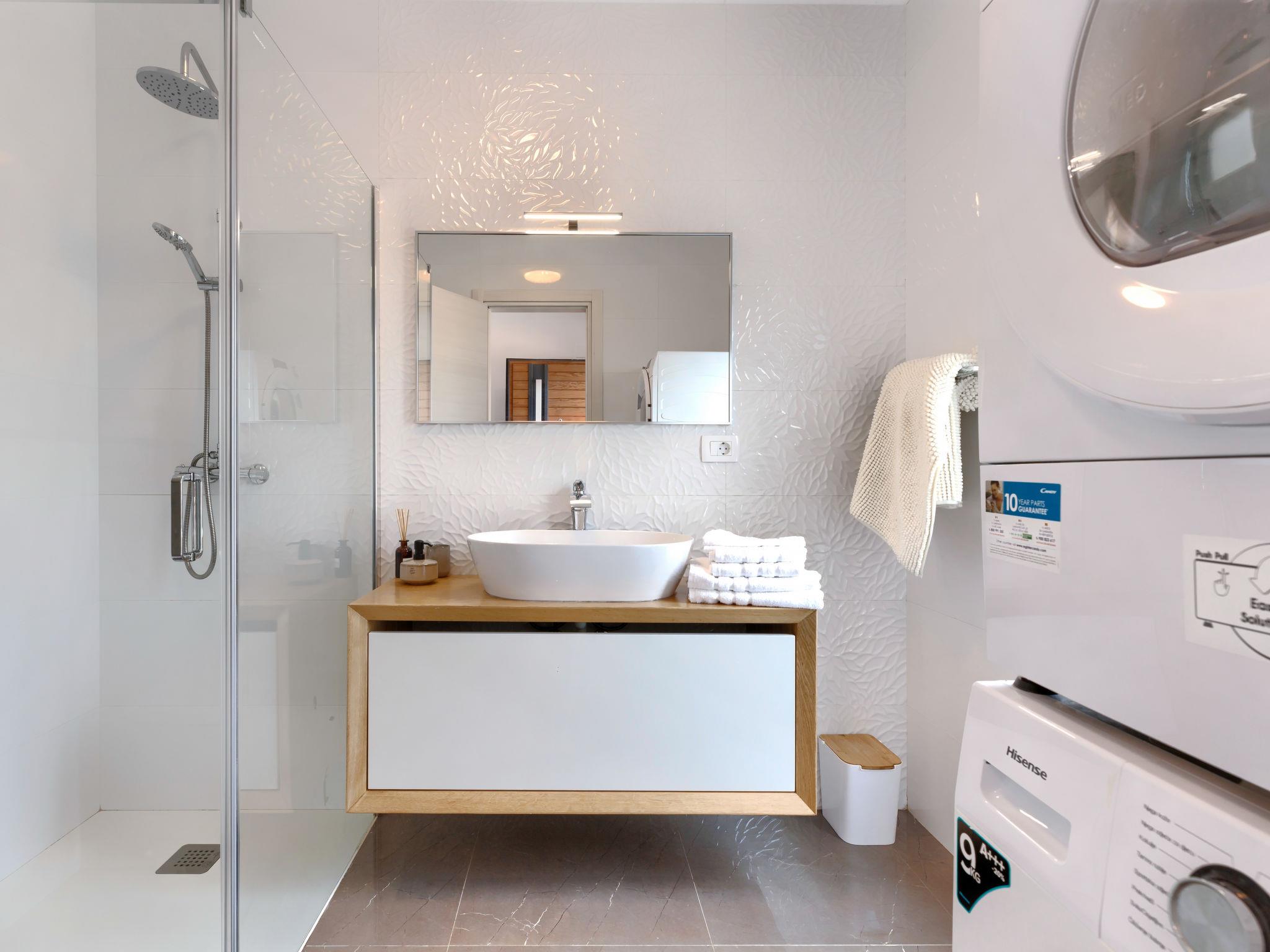 9-room house 270 m2 on 2 levels. Beautiful and tasteful furnishings: living/dining room with satellite TV (flat screen), air conditioning. Exit to the terrace, to the swimming pool. 1 room with 1 french bed (180 cm, length 200 cm), satellite TV (flat screen), air conditioning. Living/dining room with kitchen corner and satellite TV (flat screen). Exit to the terrace. 1 room with 1 french bed (180 cm, length 200 cm). Open kitchen (4 hot plates, oven, dishwasher, kettle, freezer, electric coffee machine). 2 showers/WC. No heating option. Upper floor: 1 room with 1 french bed (180 cm, length 200 cm), bath/WC and satellite TV (flat screen), air conditioning. 1 room with 2 beds (90 cm, length 200 cm), shower/WC and satellite TV (flat screen), air conditioning. Exit to the terrace. 1 room with 1 french bed (180 cm, length 200 cm). 2 rooms, each room with 1 bed (140 cm, length 200 cm). Bath/WC. Heating (extra). Terrace 20 m2, terrace 8 m2. Terrace furniture, deck chairs. Distant view of the sea. Facilities: safe, hair dryer. Internet (WiFi, free).