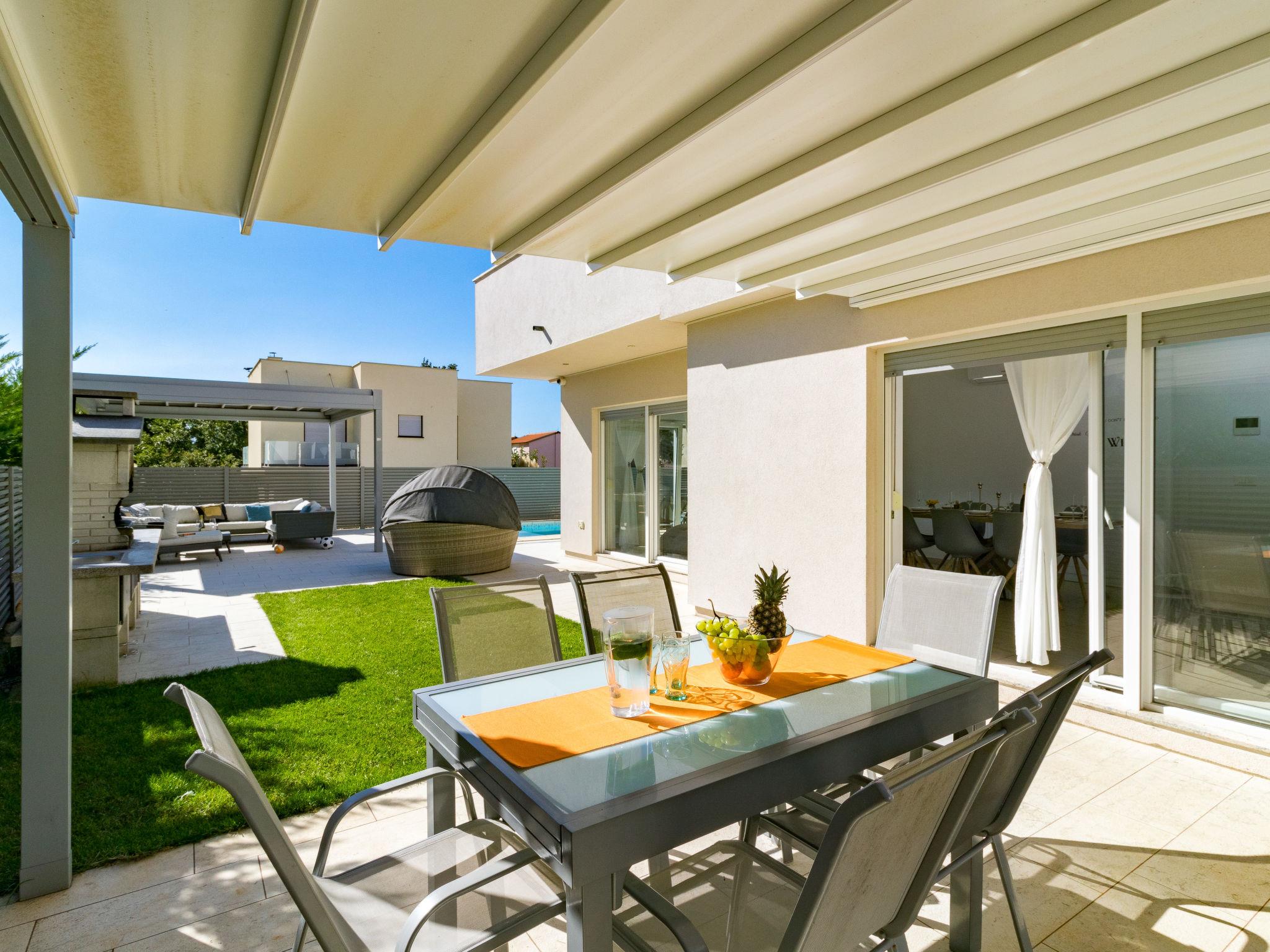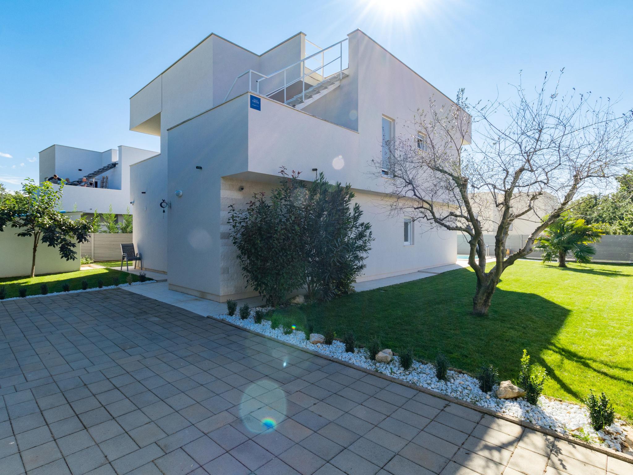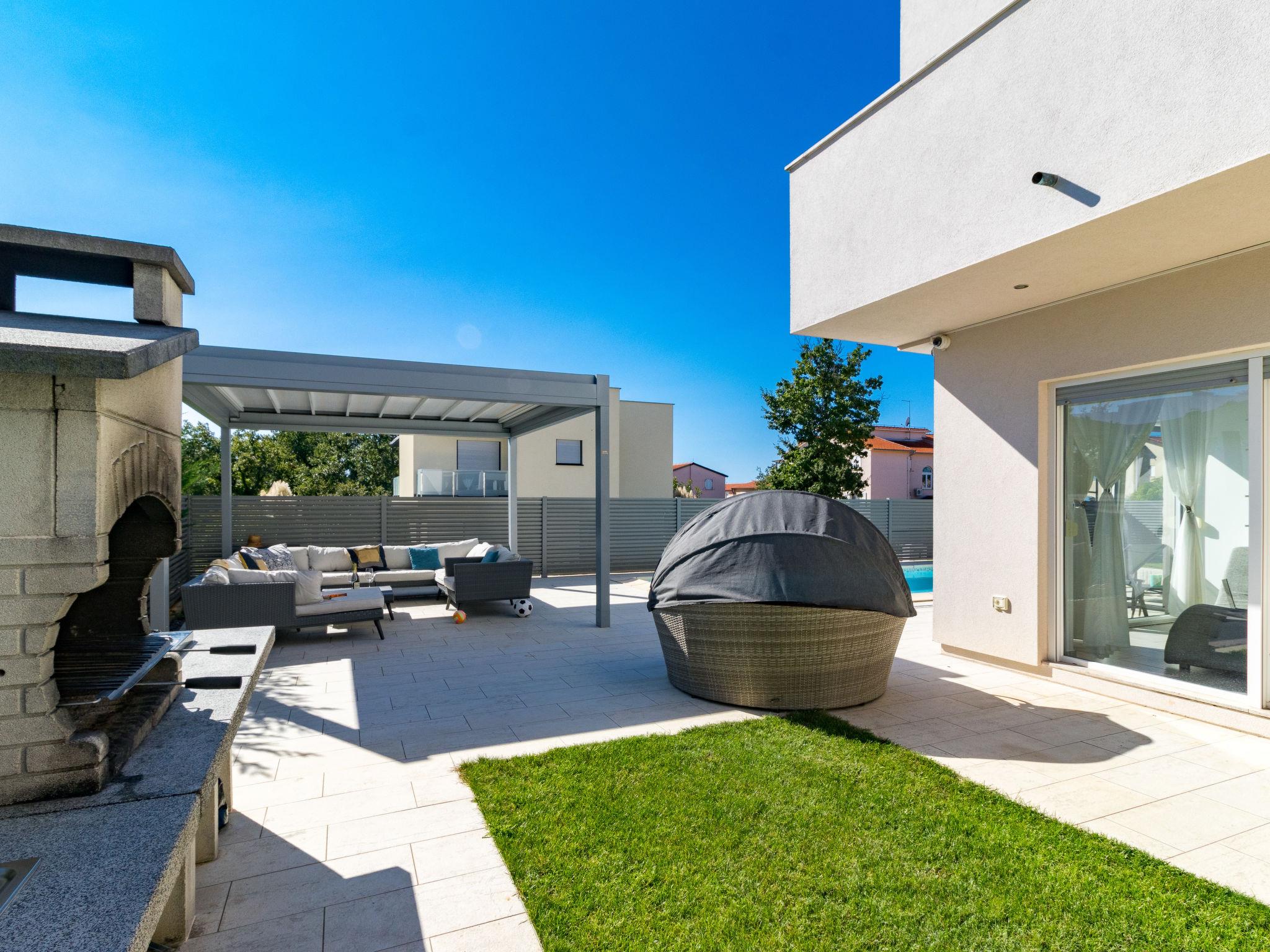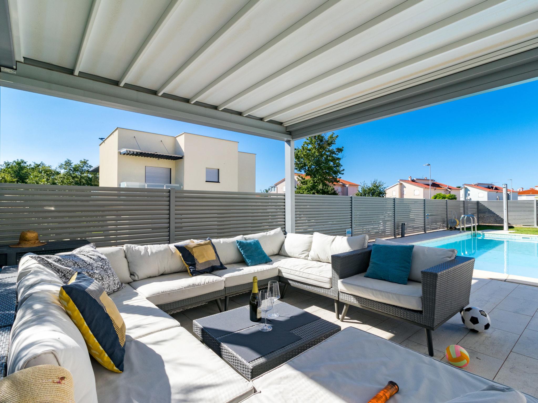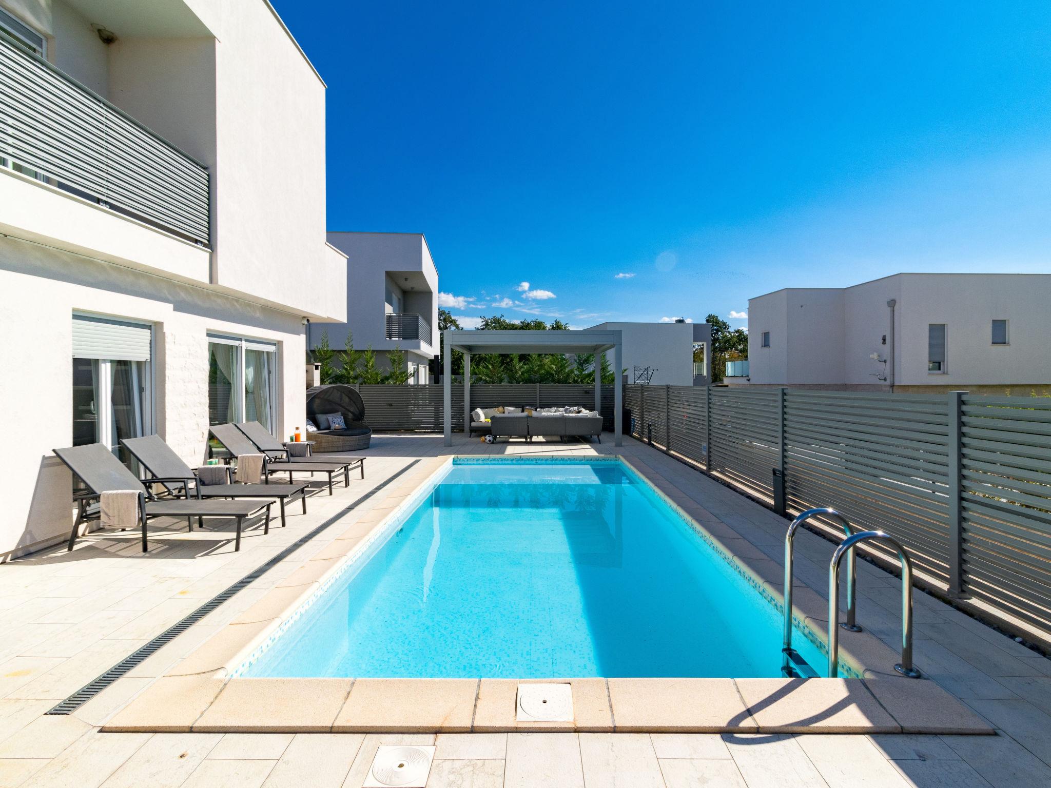 Modern single-family house "Villa Virtus", 2 storeys, built in 2016. 4 km from the centre of Novigrad, 8 km from the centre of Umag, 24 km from the centre of Porec, in the residential district, from the sea, 200 m from the beach. Private: property 500 m2 (fenced), swimming pool angular, heated (8 x 4 m, depth 145 cm, seasonal availability: 27.Mar. - 05.Nov.). Outdoor shower, hot tub, terrace, garden furniture. In the house: internet access, roof terrace, burglar alarm system, washing machine. Parking (for 2 cars) at the house on the premises. Shop 200 m, supermarket 4 km, bus stop 290 m, rocky beach 200 m. Marina 8 km.