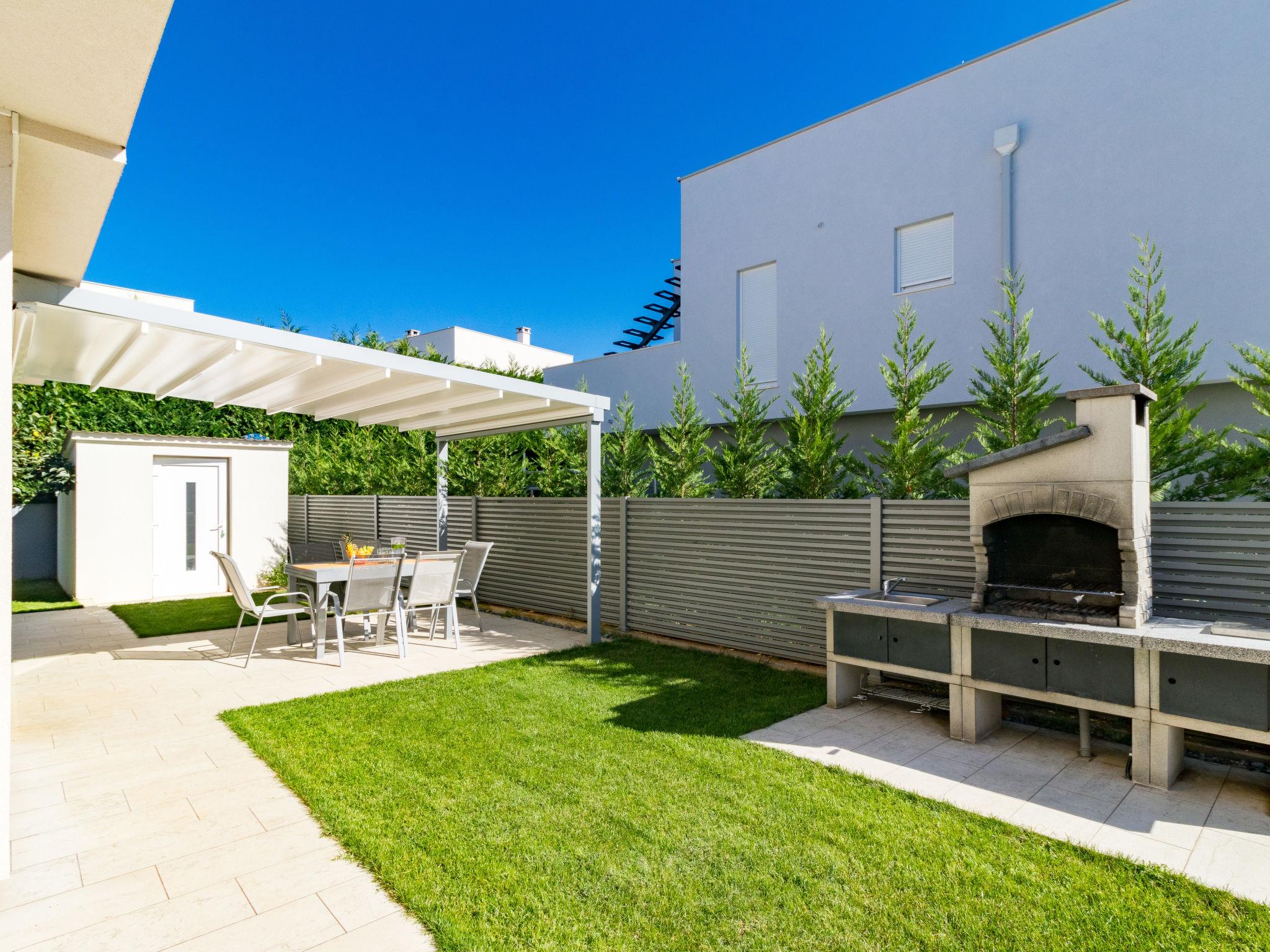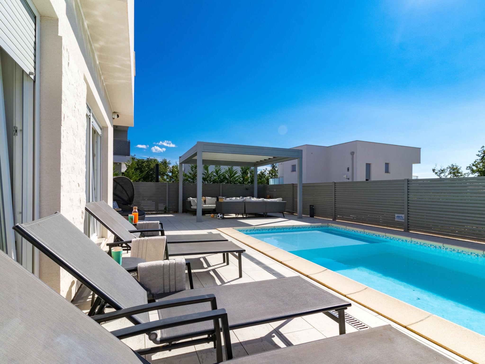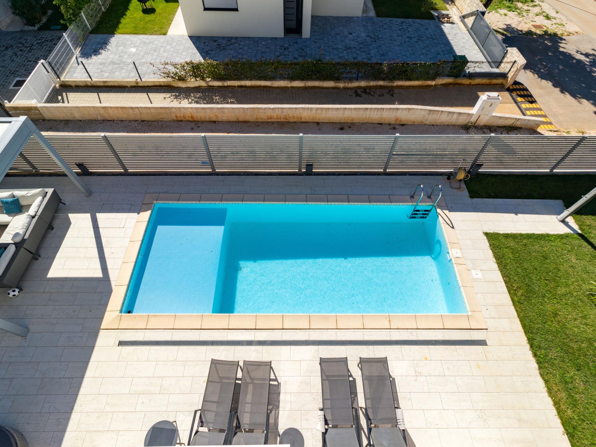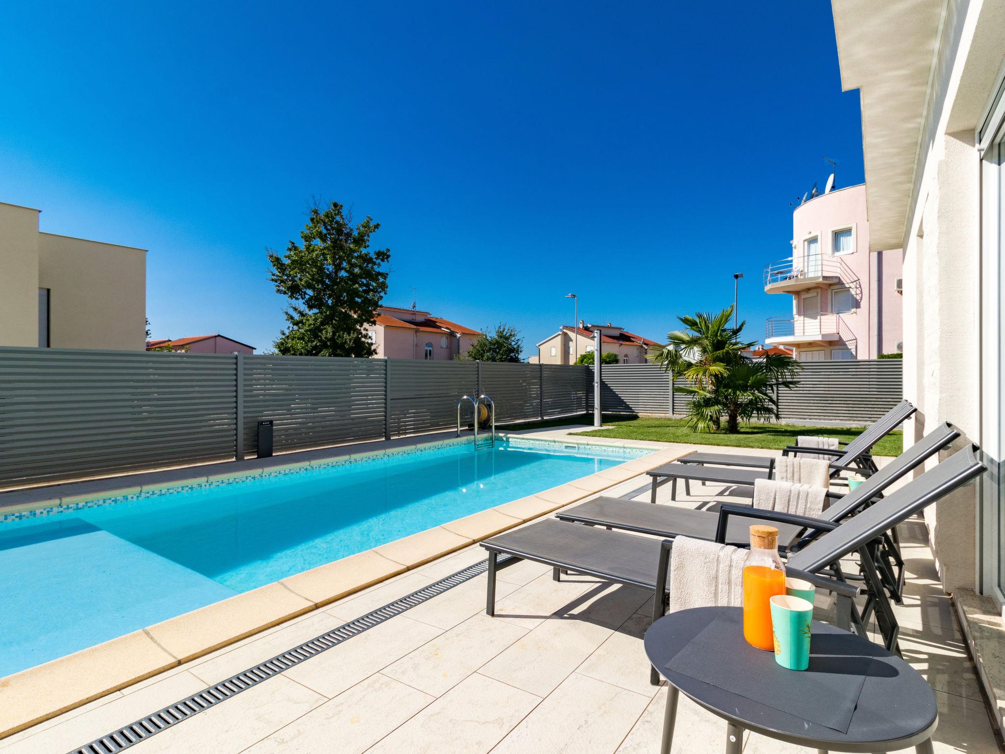 Modern single-family house "Villa Virtus", 2 storeys, built in 2016. 4 km from the centre of Novigrad, 8 km from the centre of Umag, 24 km from the centre of Porec, in the residential district, from the sea, 200 m from the beach. Private: property 500 m2 (fenced), swimming pool angular, heated (8 x 4 m, depth 145 cm, seasonal availability: 27.Mar. - 05.Nov.). Outdoor shower, hot tub, terrace, garden furniture. In the house: internet access, roof terrace, burglar alarm system, washing machine. Parking (for 2 cars) at the house on the premises. Shop 200 m, supermarket 4 km, bus stop 290 m, rocky beach 200 m. Marina 8 km.
