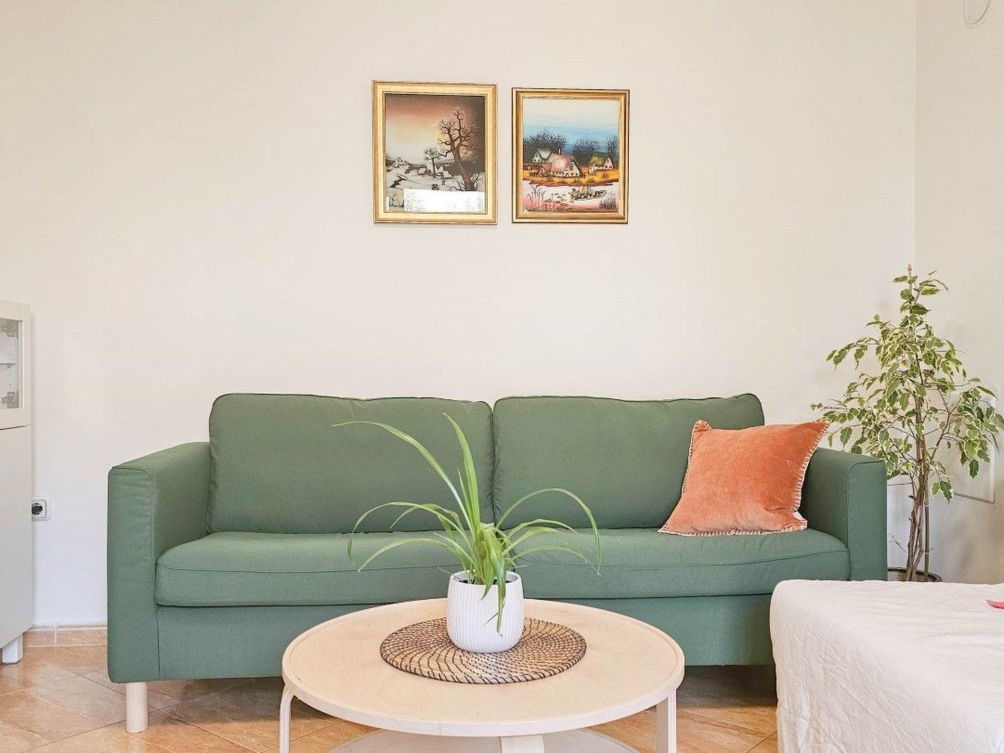 Inside, the apartment is equipped with all the essentials to make your stay as comfortable as possible. The living space features a practical setup, including a kitchen that comes with an electric stove, refrigerator, dishwasher, microwave, and coffee maker, catering to all your culinary needs. The living room houses a snug sofa bed alongside the bedroom's double bed, providing ample sleeping arrangements for all guests. The inclusion of air conditioning in parts of the apartment ensures a pleasant atmosphere during warmer days.