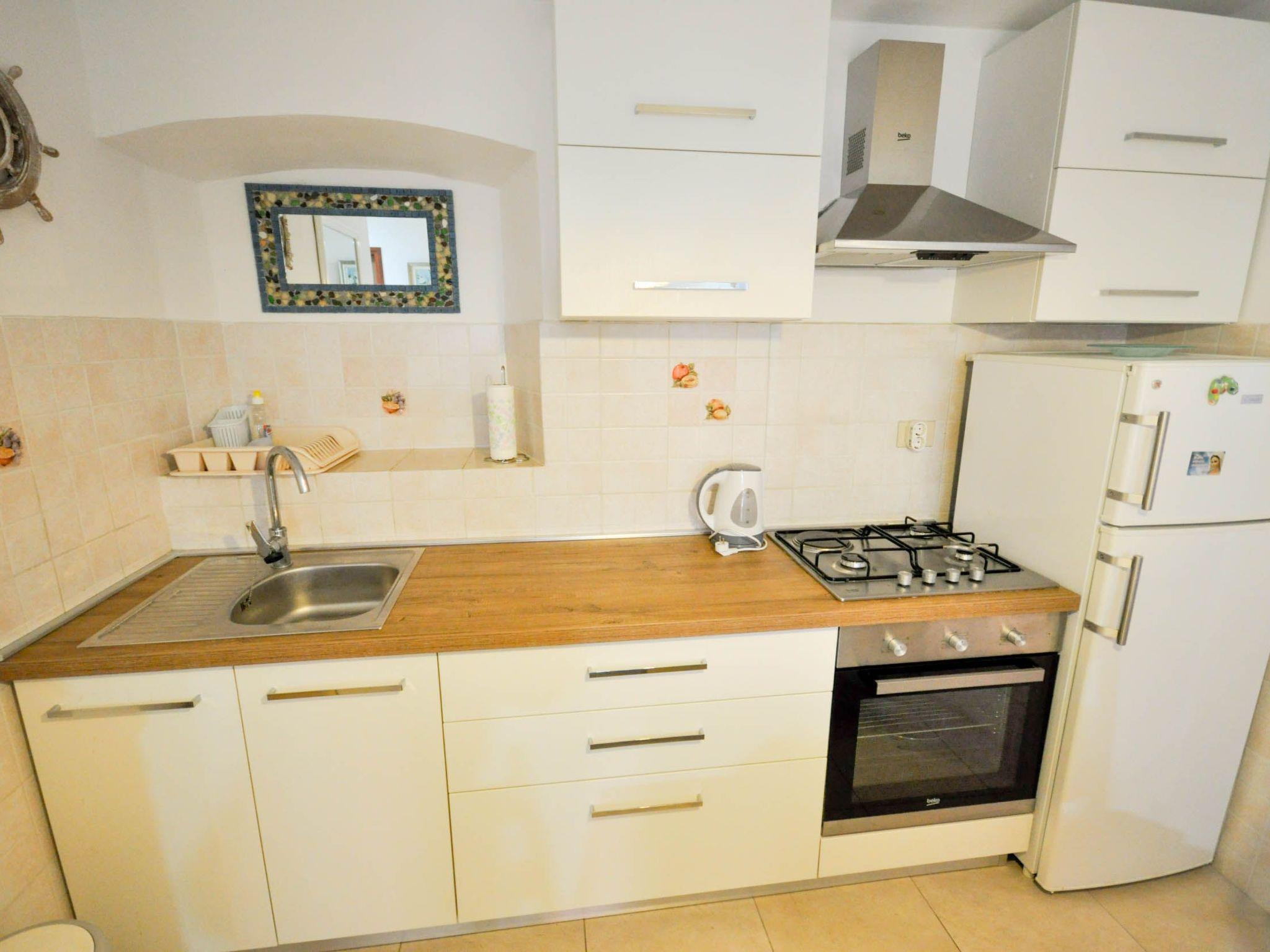 Inside, the apartment boasts a harmonious blend of space and comfort, ensuring your stay is nothing short of delightful. The two welcoming bedrooms are furnished with double beds, offering a serene retreat after a day of exploration and sun-soaked adventures. Seamlessly extending from a well-equipped kitchen is the living room, featuring a sofa bed that caters to additional guests or provides a cozy nook for relaxation. A gas cooker and coffee machine are at your disposal, catering to your culinary needs and morning ritual with ease.