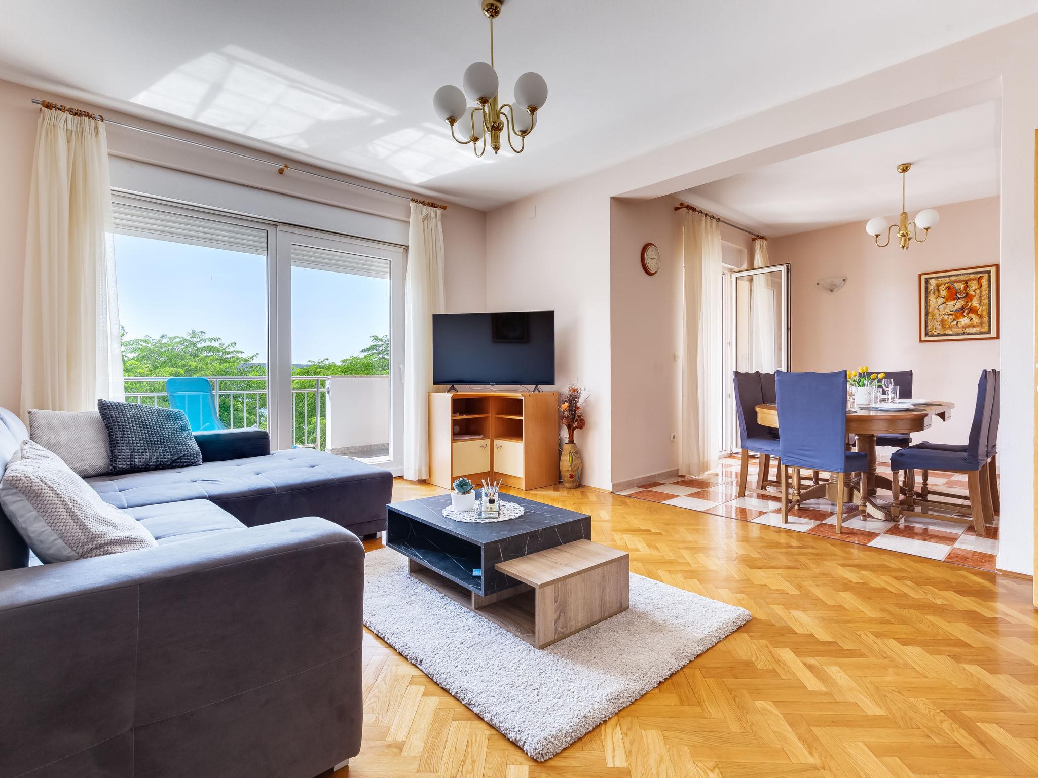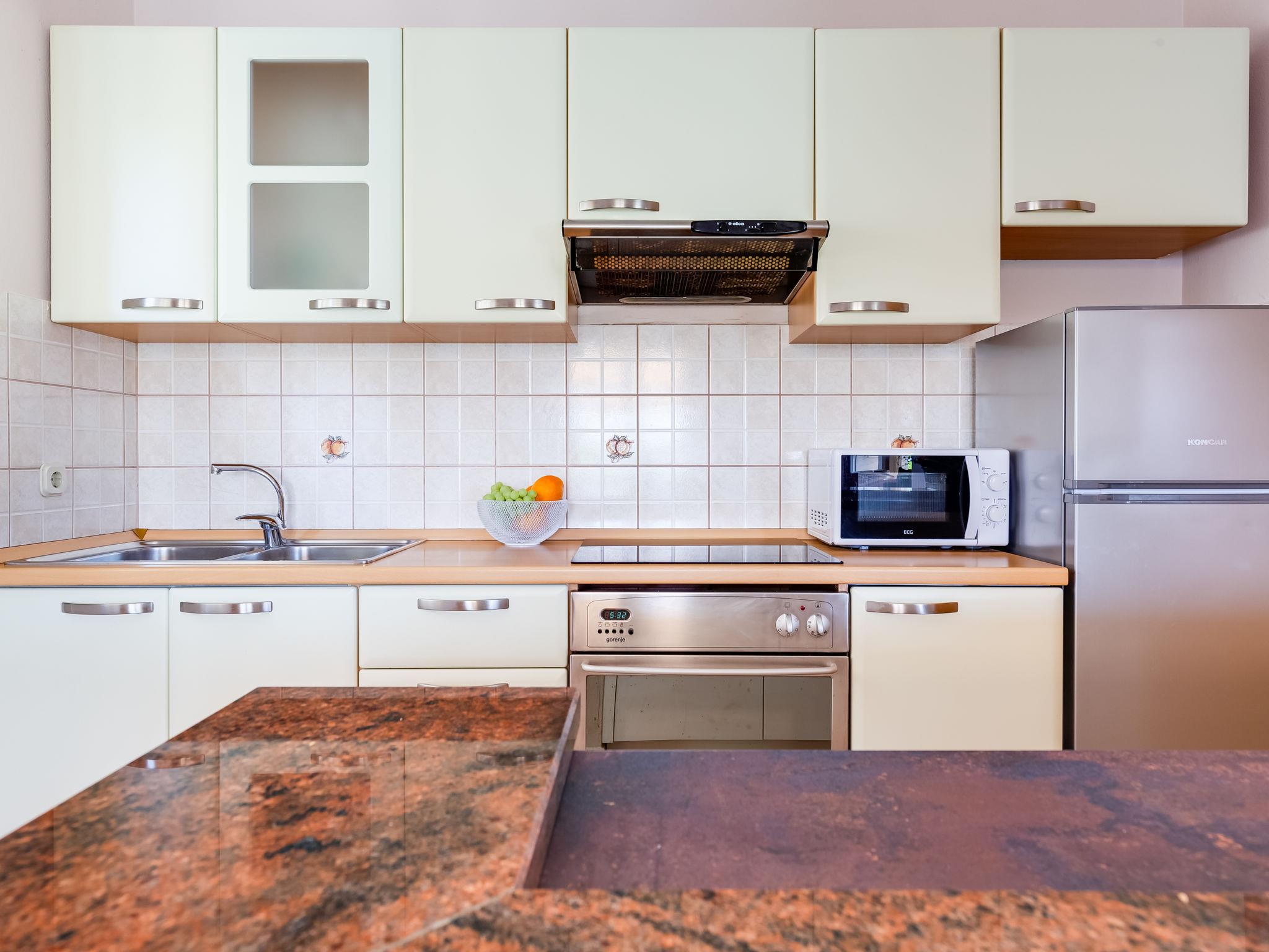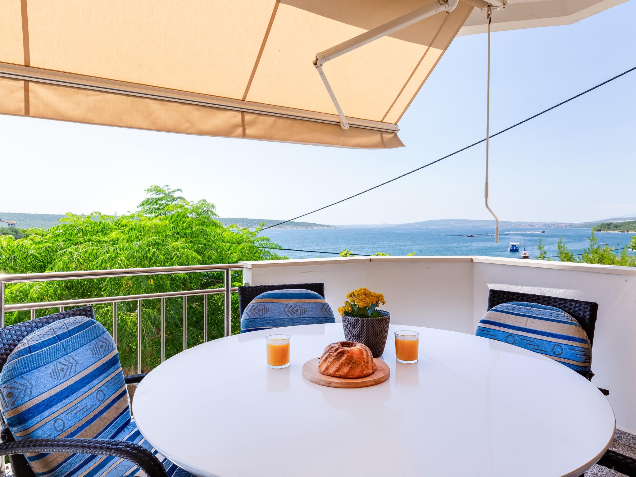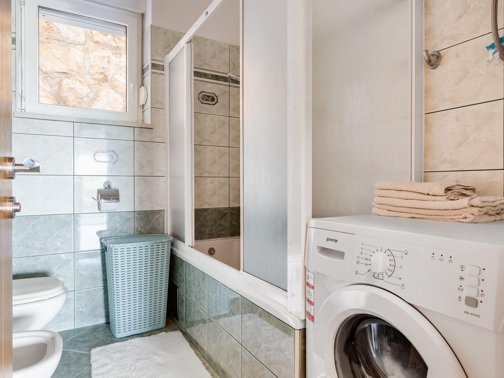 "Daria 1", 3-room apartment 90 m2 on 1st floor. Living/dining room with 1 sofabed, satellite TV and air conditioning. Exit to the terrace. 1 room with 1 double bed and shower/WC. Exit to the terrace. 1 room with 2 beds. Open kitchen (oven, dishwasher, 4 ceramic glass hob hotplates, freezer). Bath/bidet/WC. No heating option. Terrace 20 m2, roofed, south facing position terrace 4 m2. Terrace furniture. Marvellous view of the sea. Facilities: washing machine. Internet (WiFi, free).