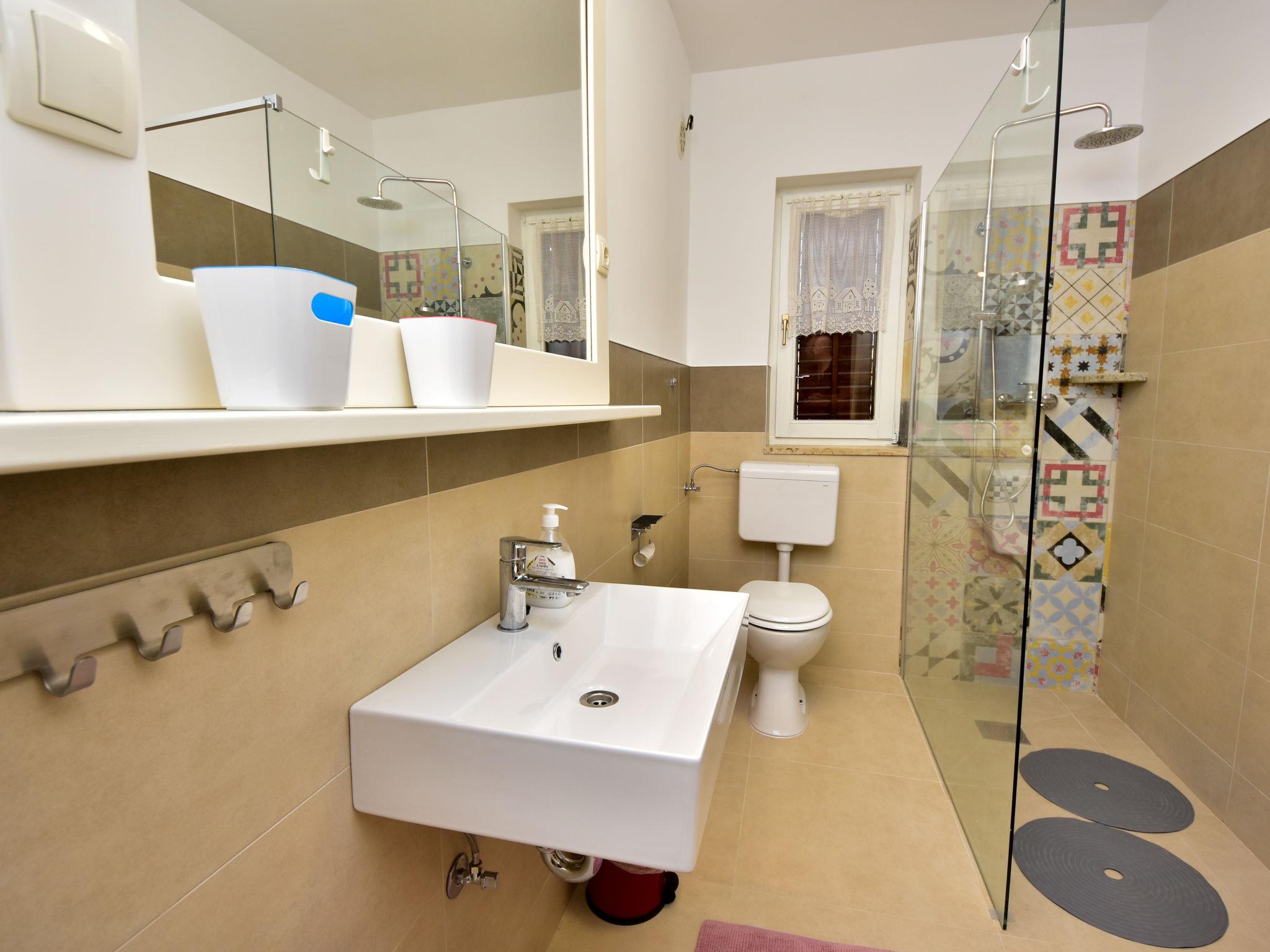 RIBNICA 15 km from Novigrad: 2-family house "Kate", 2 storeys. 8 km from the centre of Obrovac, in a quiet, sunny, elevated position, 250 m from the sea, 250 m from the beach, in the countryside. Private: property 600 m2 (fenced) with lawn 150 m2, orchard. Outdoor shower, garden furniture, barbecue, children's playground (swing). In the house: internet access. Parking at the house on the premises. Shop 500 m, restaurant 2 km, bar 250 m, bus stop 24.9 km, pebble beach 250 m.