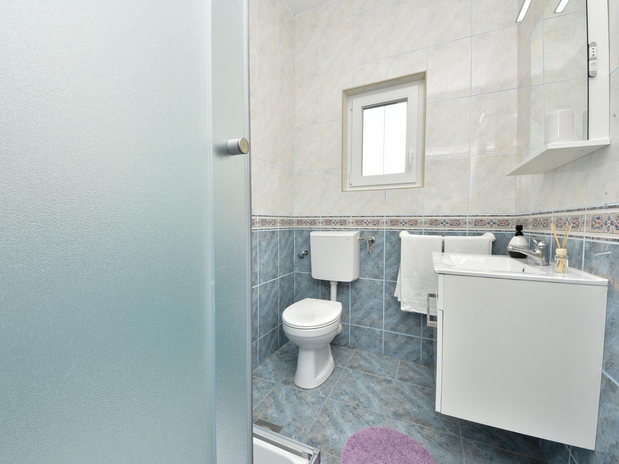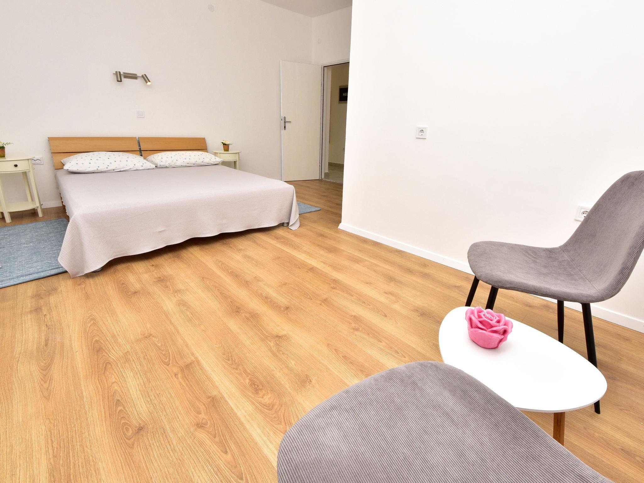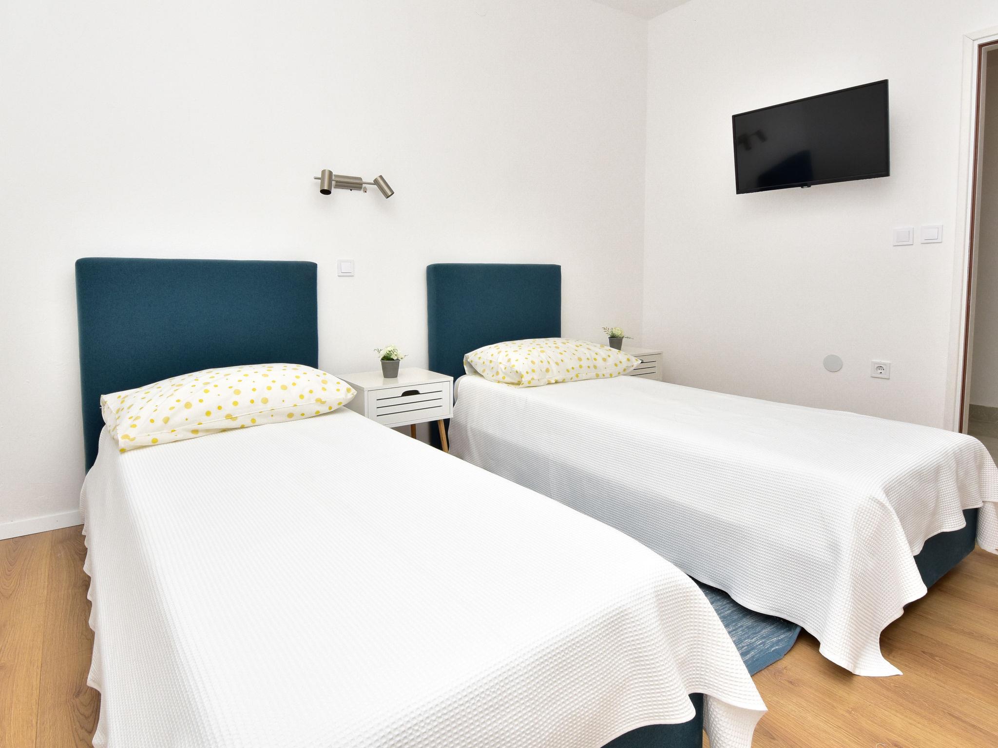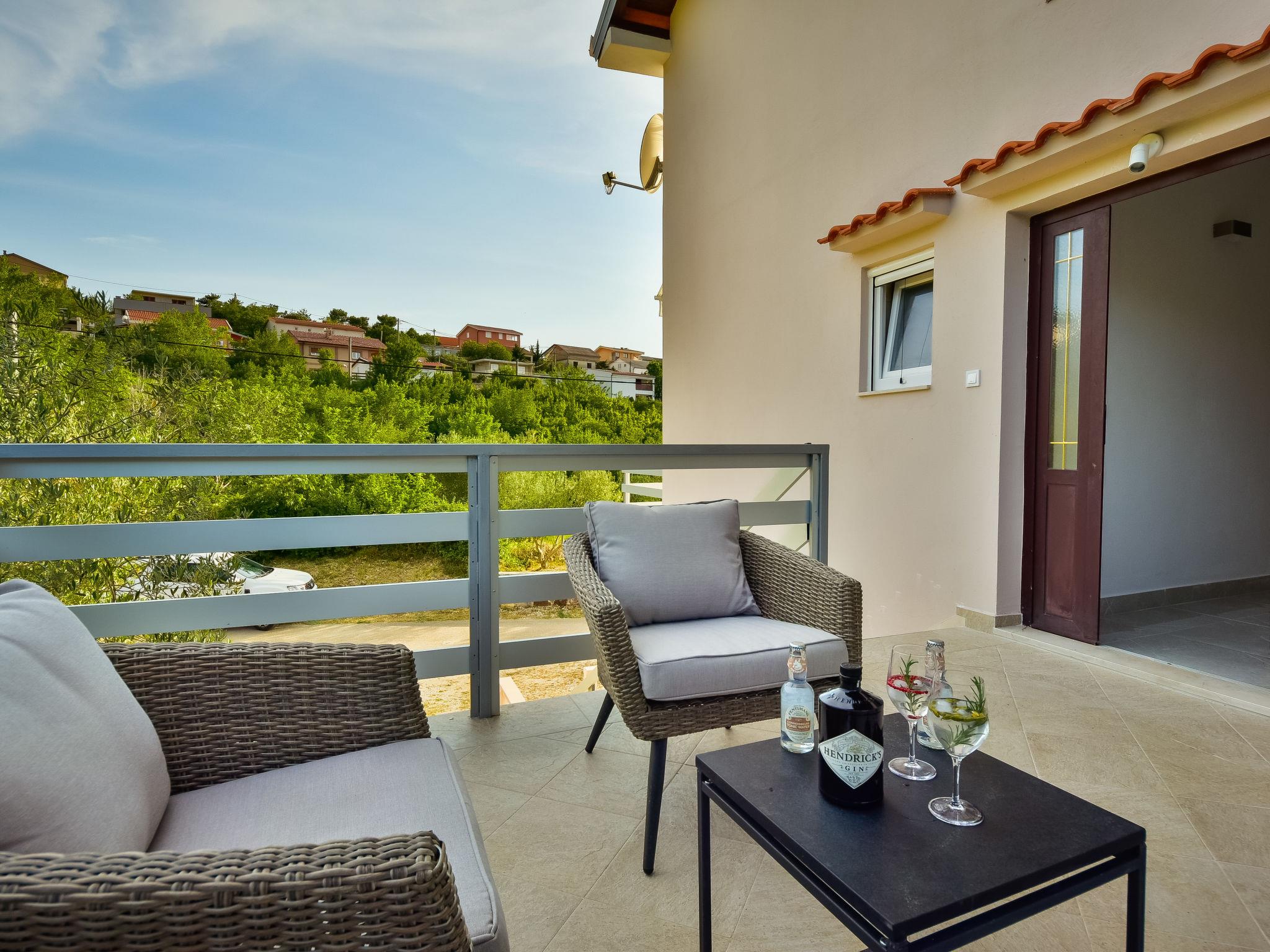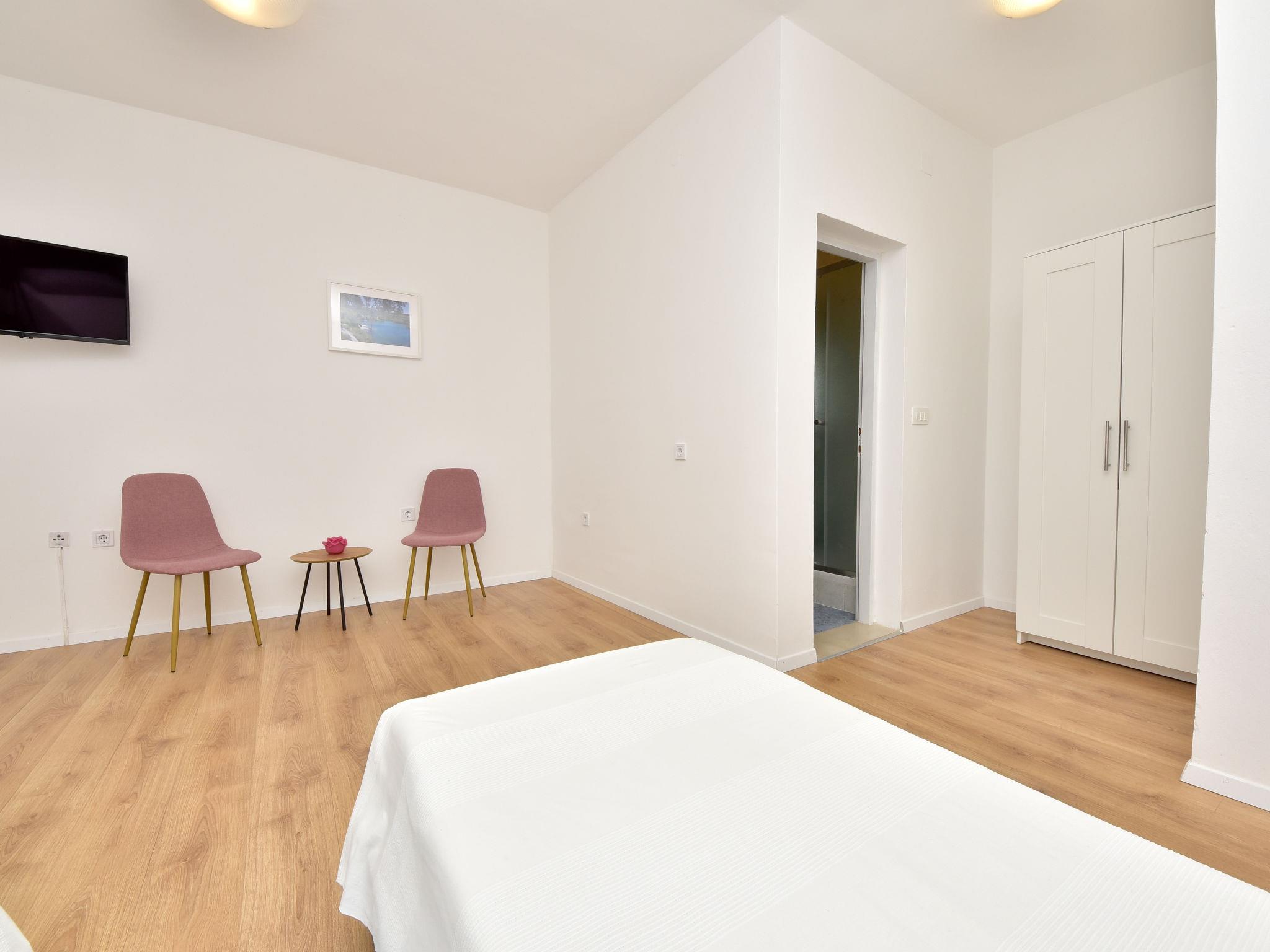 6-room house 150 m2 on 2 levels. Simple furnishings: living/dining room 35 m2 with satellite TV and air conditioning. Exit to the terrace. 1 room with 1 french bed (160 cm, length 200 cm). Open kitchen (4 hot plates, oven, dishwasher, microwave, freezer). Shower/WC. No heating option. Upper floor: entrance hall with air conditioning. 1 room with 2 beds (80 cm, length 190 cm), shower/WC and satellite TV. Exit to the balcony. 1 room with 1 sofabed (120 cm, length 200 cm), 1 french bed (160 cm, length 200 cm), shower/WC. Exit to the balcony. 1 room with 2 beds (80 cm, length 200 cm), shower/WC and satellite TV. Exit to the balcony. 1 room with 1 sofabed (120 cm, length 200 cm), 1 double bed (2 x 80 cm, length 200 cm), shower/WC and satellite TV. Exit to the balcony. Balcony 12 m2, balcony 12 m2, large terrace 30 m2 partly roofed terrace 15 m2. Terrace furniture. View of the sea. Facilities: children's high chair, baby cot. Internet (WiFi, free). Please note: maximum 1 pet/ dog allowed. Fire extinguisher. klasa:UP/i-335-03/20-01/1104 urbroj : 2198/1-19-0