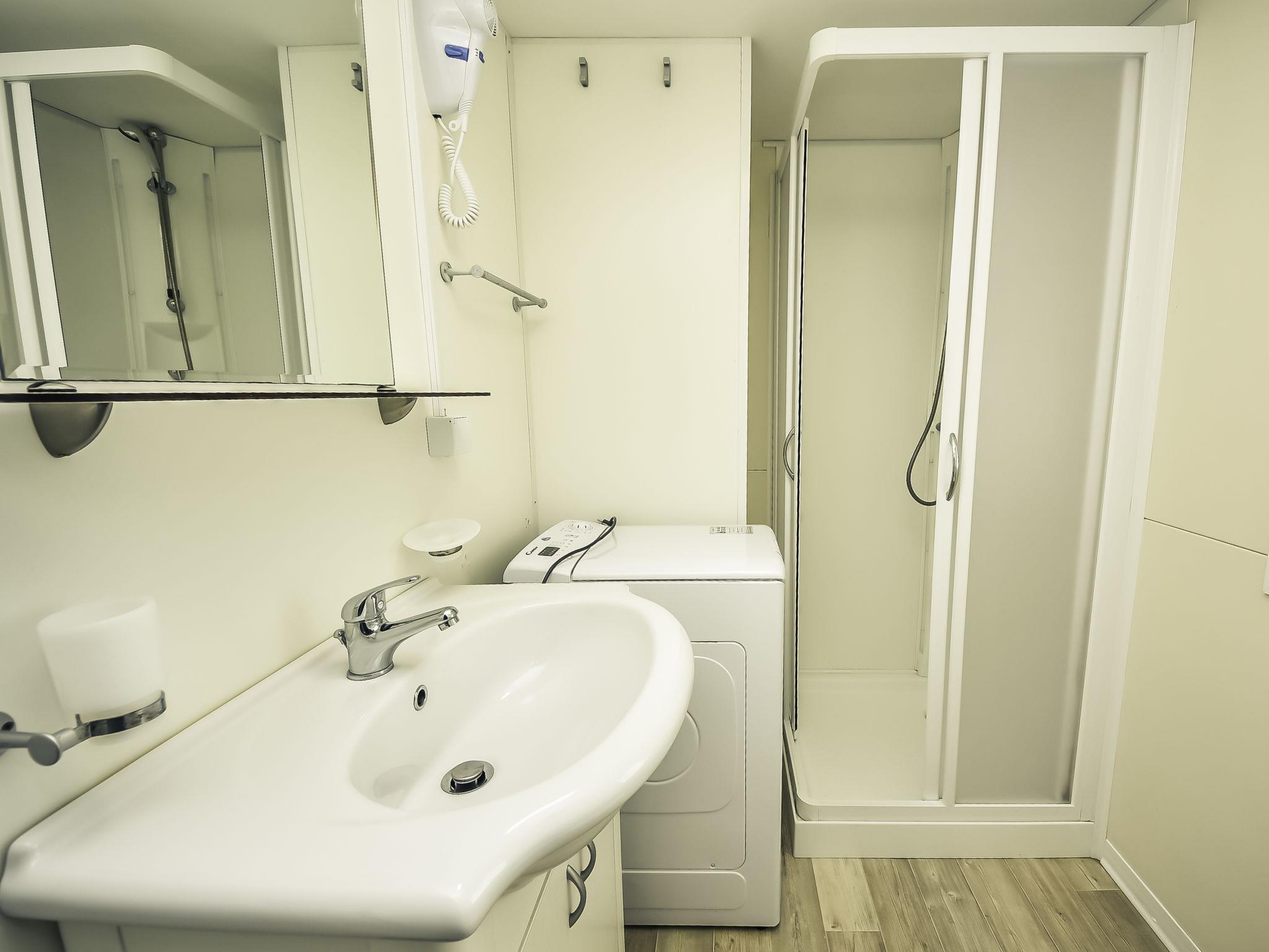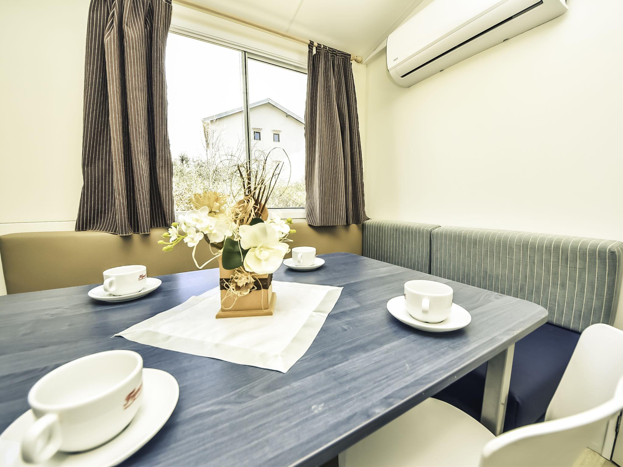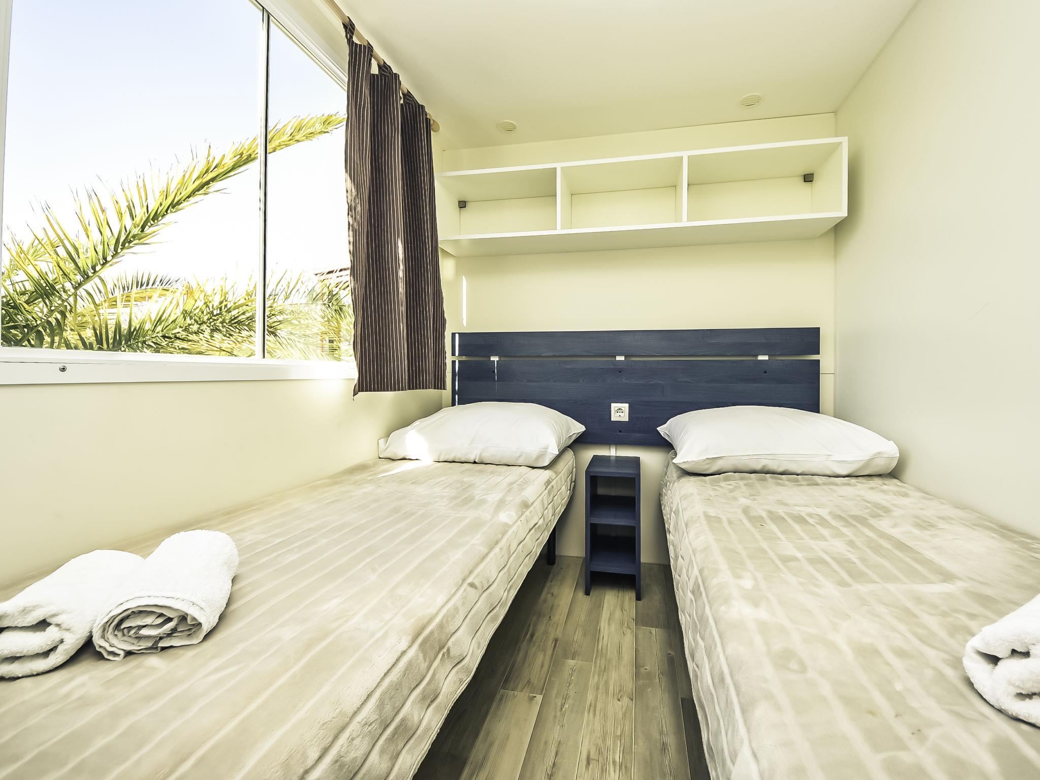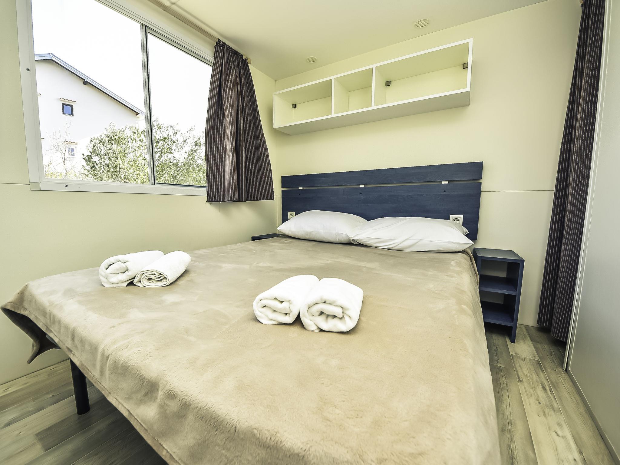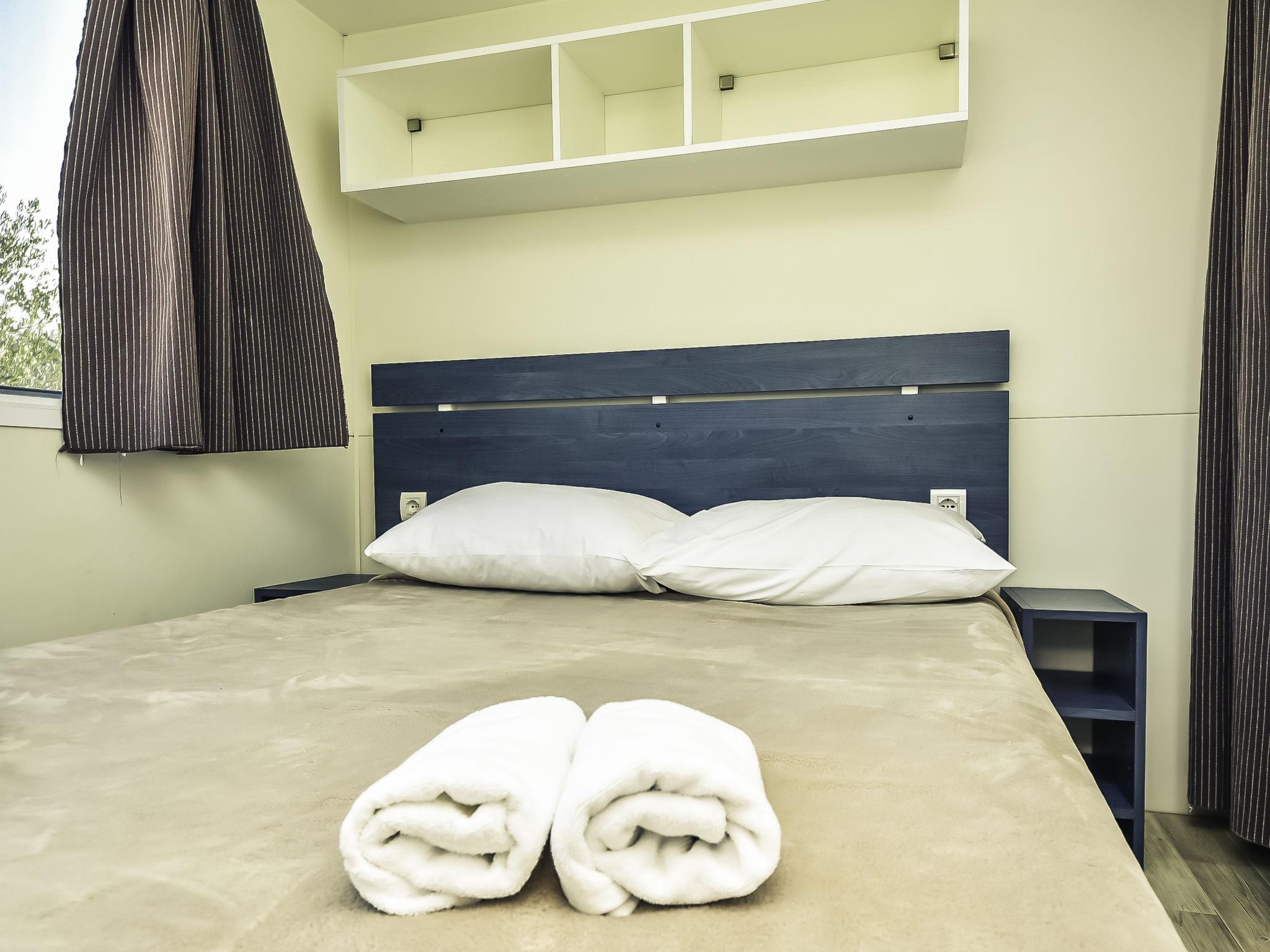 4-room mobile home 32 m2, west facing position. Living/dining room with satellite TV (flat screen), air conditioning. Exit to the terrace. 1 room with 1 french bed (140 cm, length 190 cm). 2 rooms, each room with 2 beds (70 cm, length 190 cm). Open kitchen (4 hot plates, freezer). Shower/WC. No heating option. Terrace 14 m2 partly roofed. Terrace furniture. View of the sea. Facilities: washing machine, hair dryer. Internet (WiFi, free).