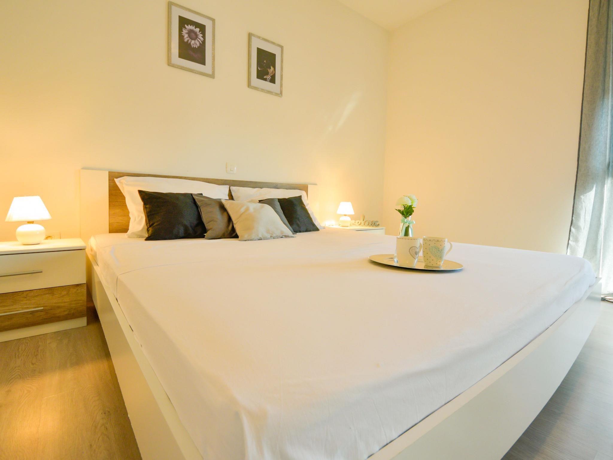 4-room house 120 m2, south-west facing position. Living/dining room 50 m2 with satellite TV (flat screen), air conditioning. Exit to the terrace. 1 room with 1 french bed (180 cm, length 200 cm), 1 folding bed (80 cm, length 190 cm). Exit to the balcony. 1 room with 2 beds (90 cm, length 200 cm), 1 folding bed (80 cm, length 190 cm). Exit to the balcony. 1 room with 1 french bed (180 cm, length 200 cm). Open kitchen (oven, dishwasher, 4 ceramic glass hob hotplates, microwave, freezer, electric coffee machine). Bath/WC, shower/WC. No heating option. 2 balconies 2 m2, terrace 40 m2, roofed. Terrace furniture, deck chairs. View of the swimming pool. Facilities: safe, baby cot, hair dryer. Internet (WiFi, free).