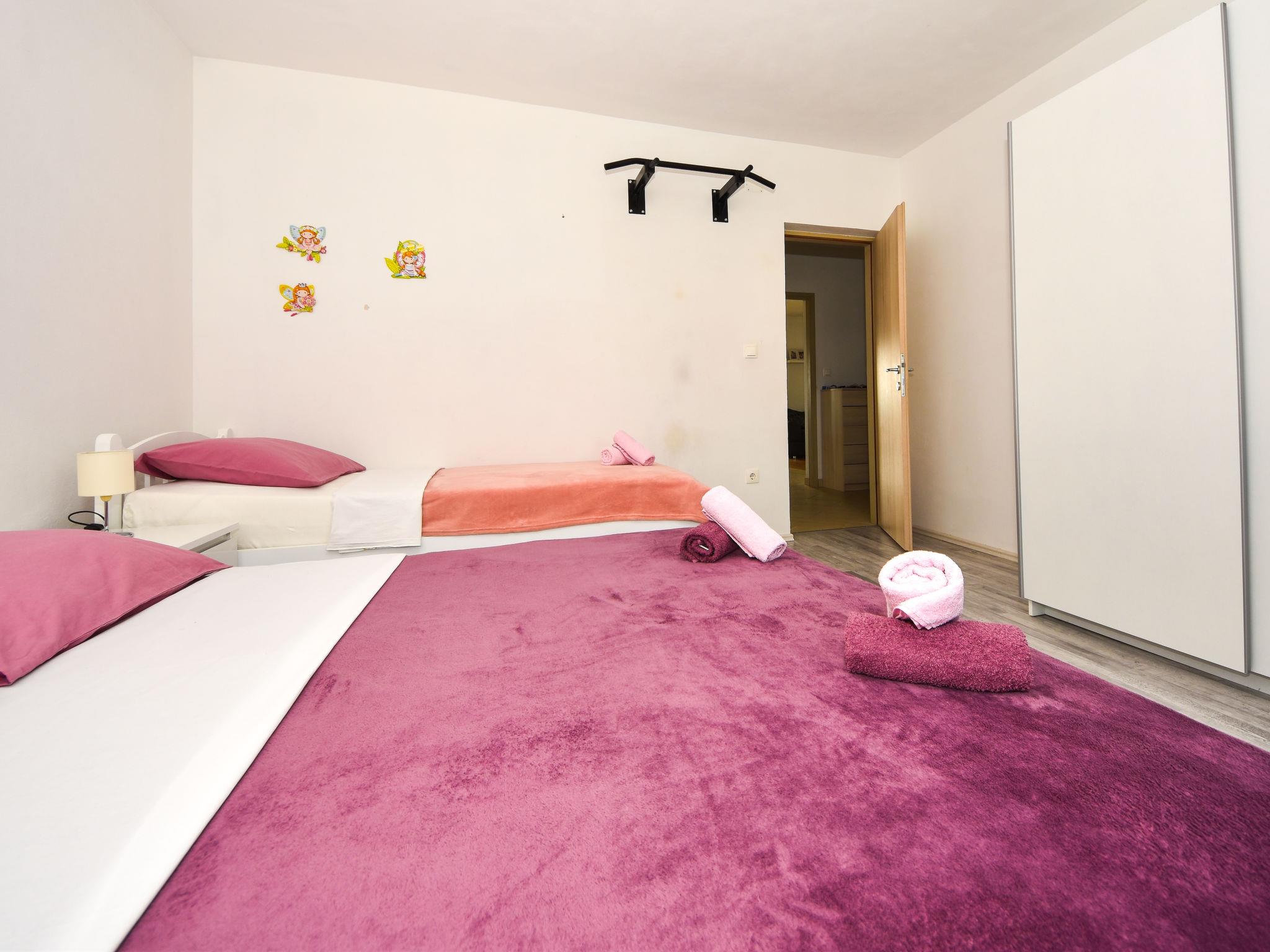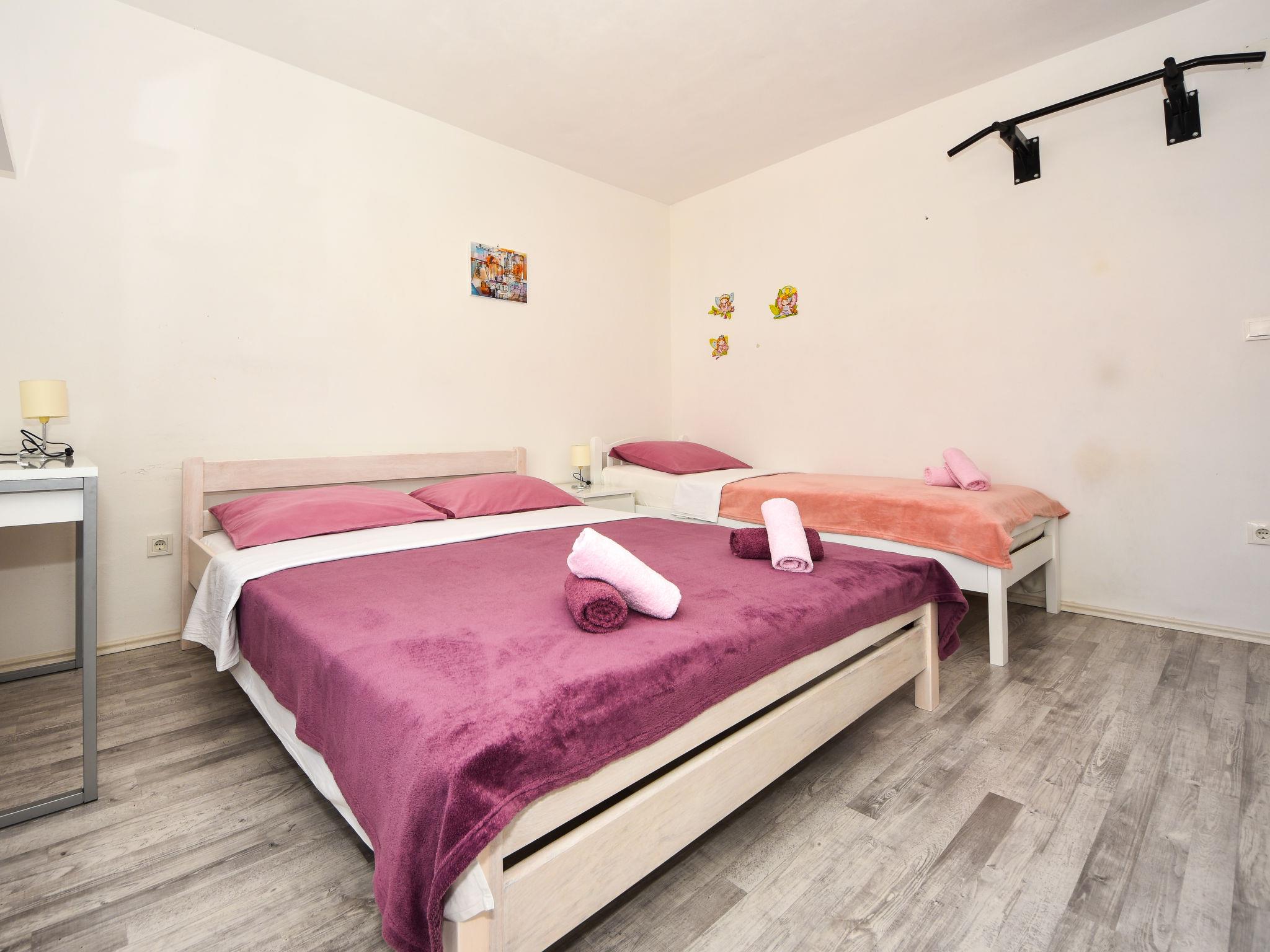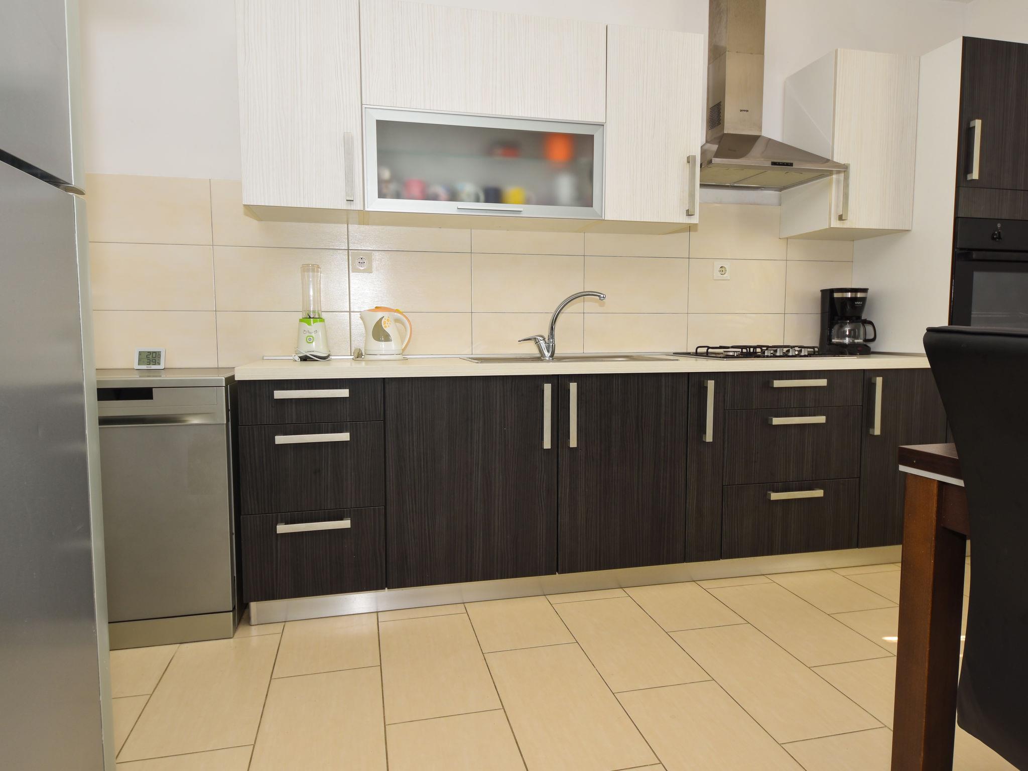 3-room terraced house 90 m2 on 1st floor, north-east facing position. Living/dining room 35 m2 with 1 sofabed (140 cm, length 190 cm), TV (flat screen), air conditioning. Exit to the terrace. 1 room with 1 french bed (160 cm, length 200 cm). 1 room with 1 bed (90 cm, length 200 cm), 1 french bed (160 cm, length 200 cm). Open kitchen (1 hot plate, oven, dishwasher, 3 gas rings, freezer, electric coffee machine). Shower/WC. No heating option. Terrace 40 m2, roofed. Terrace furniture. Distant view of the sea. Facilities: washing machine, hair dryer. Internet (WiFi, free). Please note: private entrance.