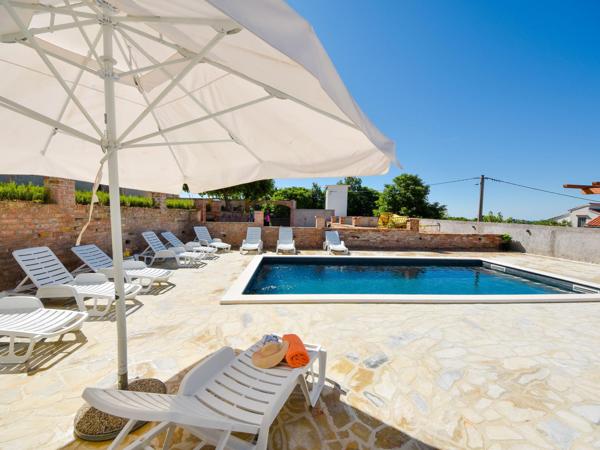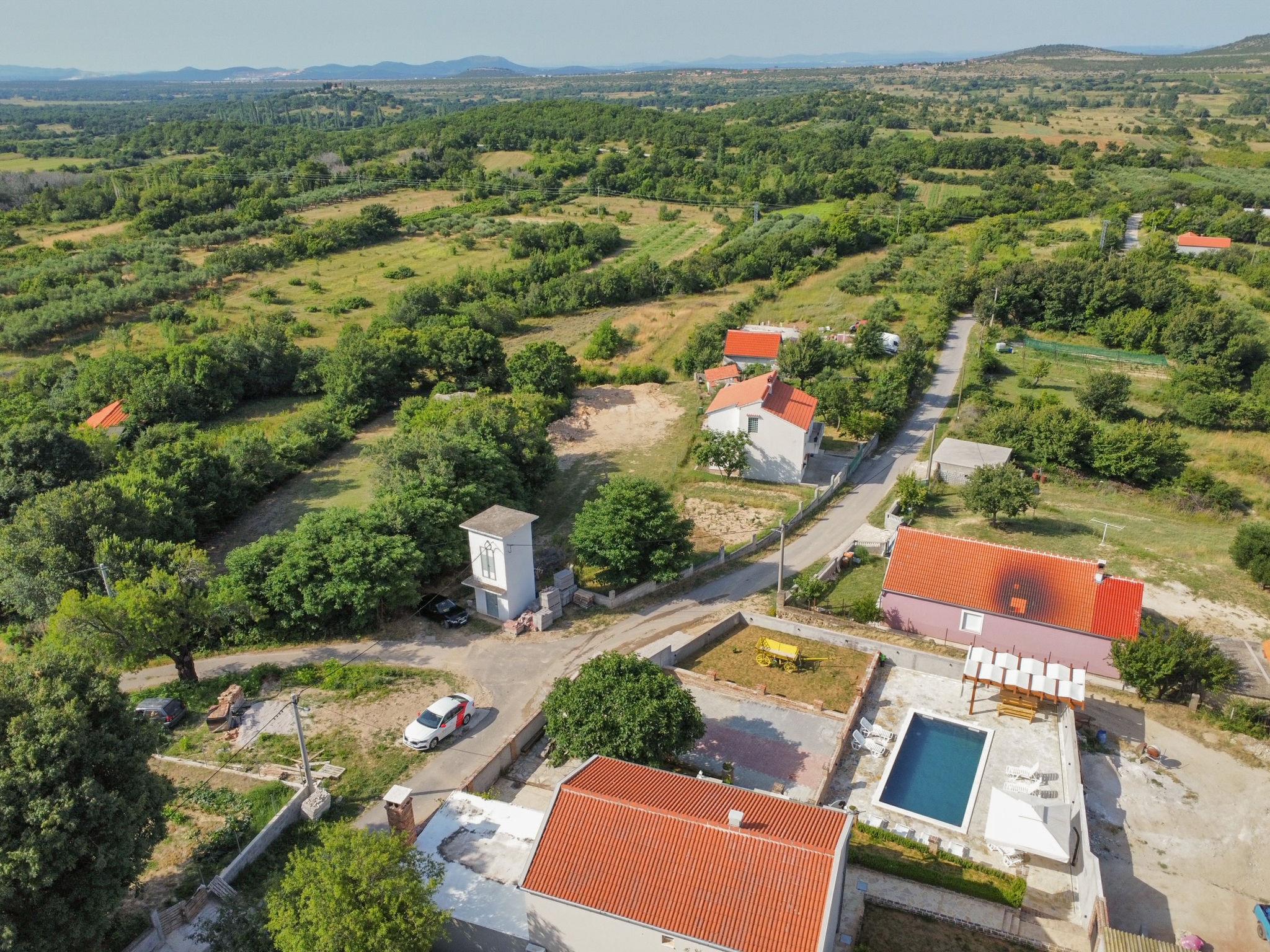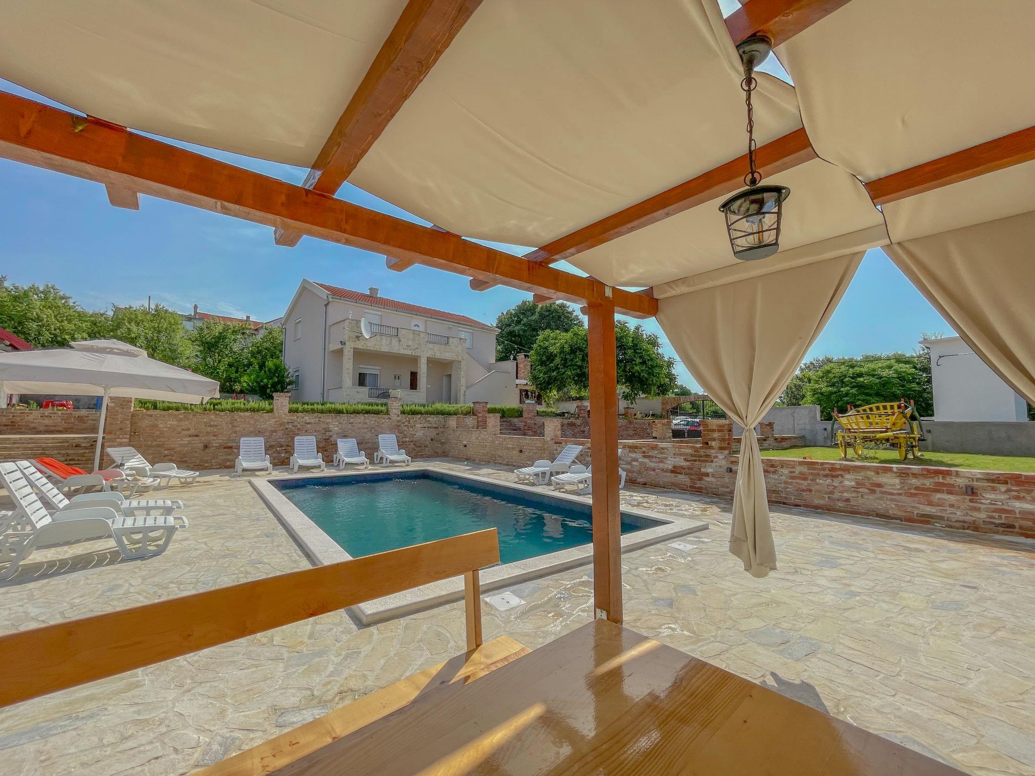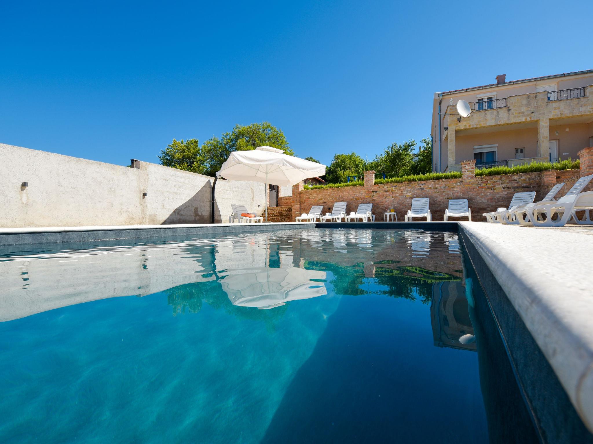 Korlat 13 km from Novigrad: Single-family house "Villa Meri", 2 storeys. 11 km from the centre of Benkovac, 16 km from the sea. Private: property 400 m2 (fenced), swimming pool angular (8 x 4 m, depth 145 cm, seasonal availability: 01.May. - 01.Oct.). Outdoor shower, terrace (20 m2), garden furniture, barbecue. In the house: internet access, washing machine. Parking (for 5 cars) on the premises. Shop 11 km, restaurant 13 km, bus stop 7.4 km, pebble beach 16 km.