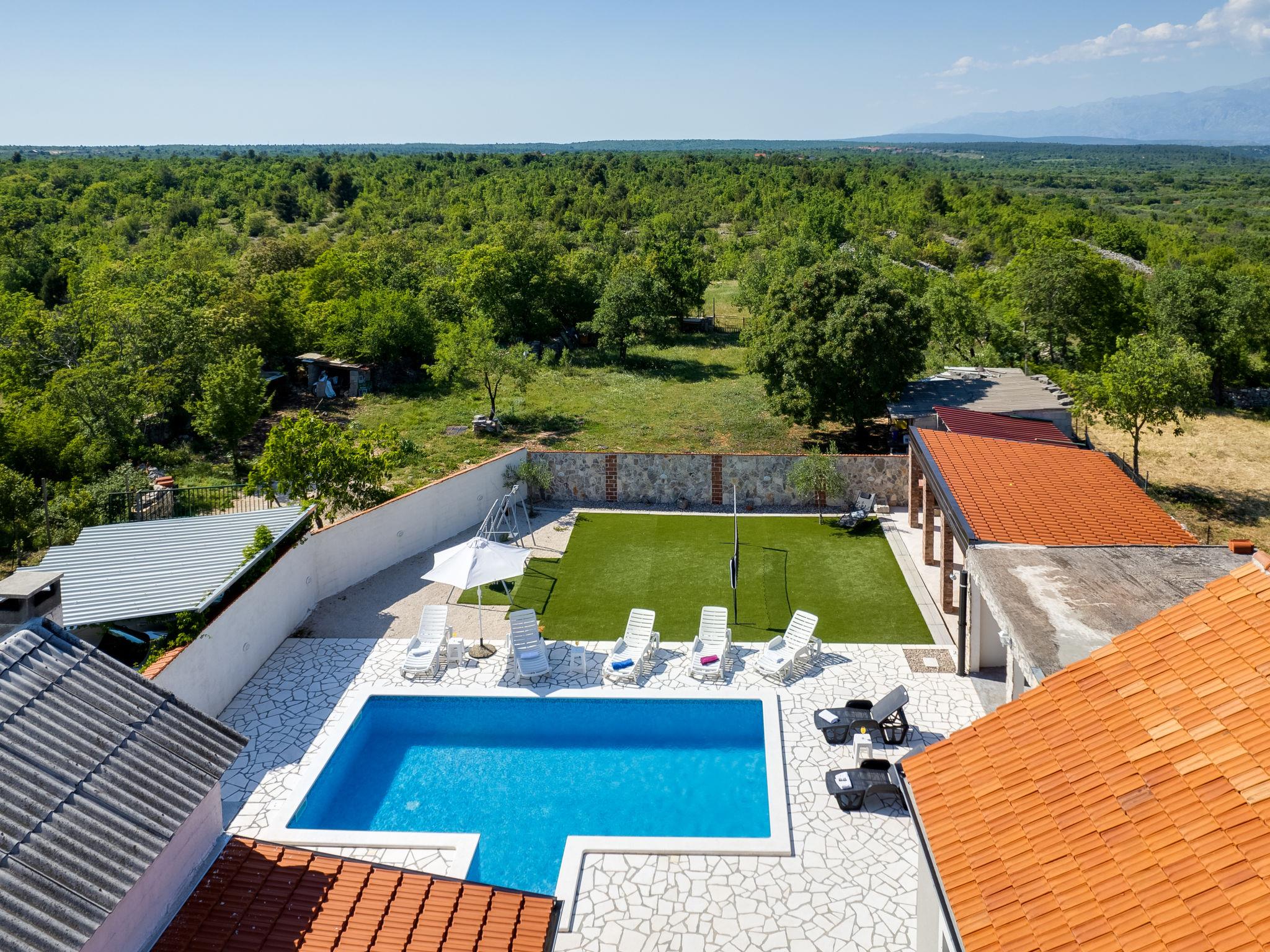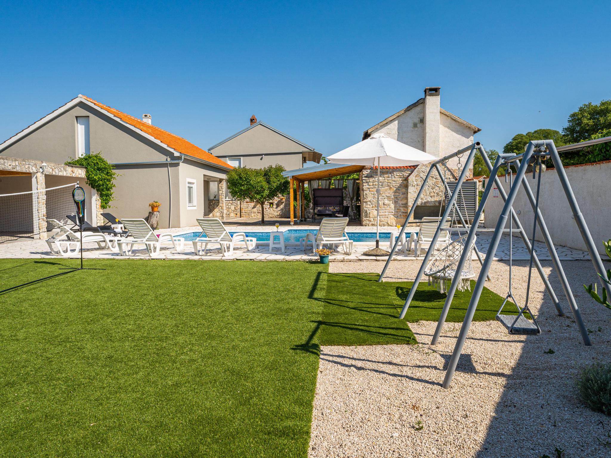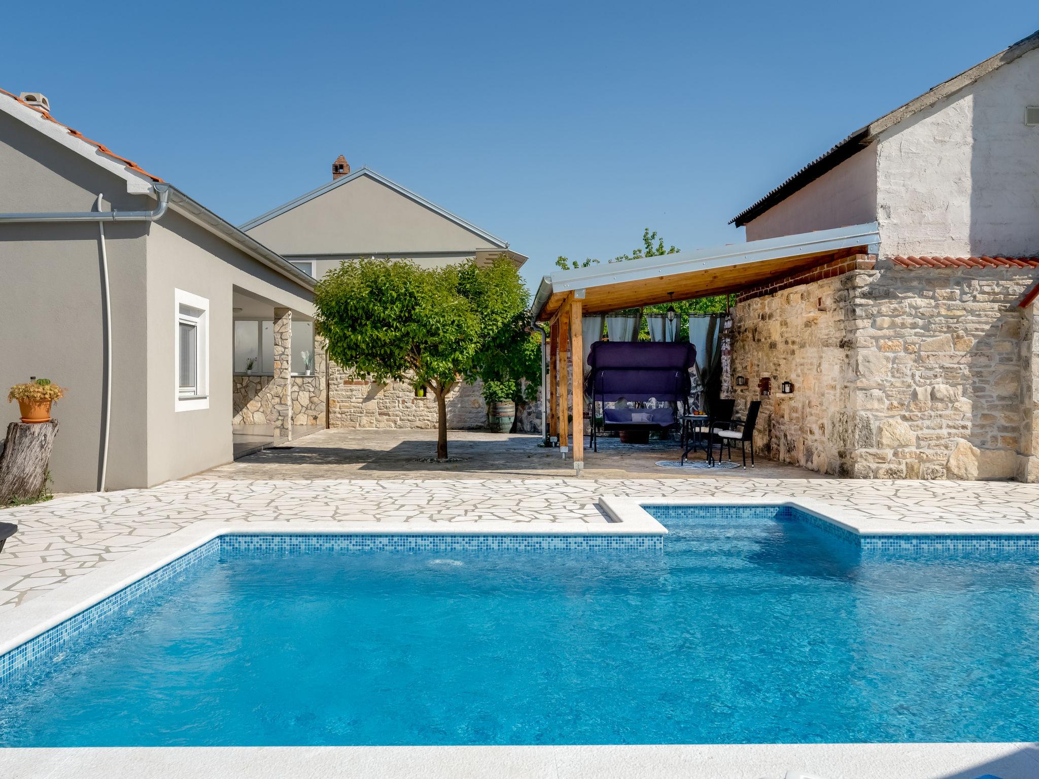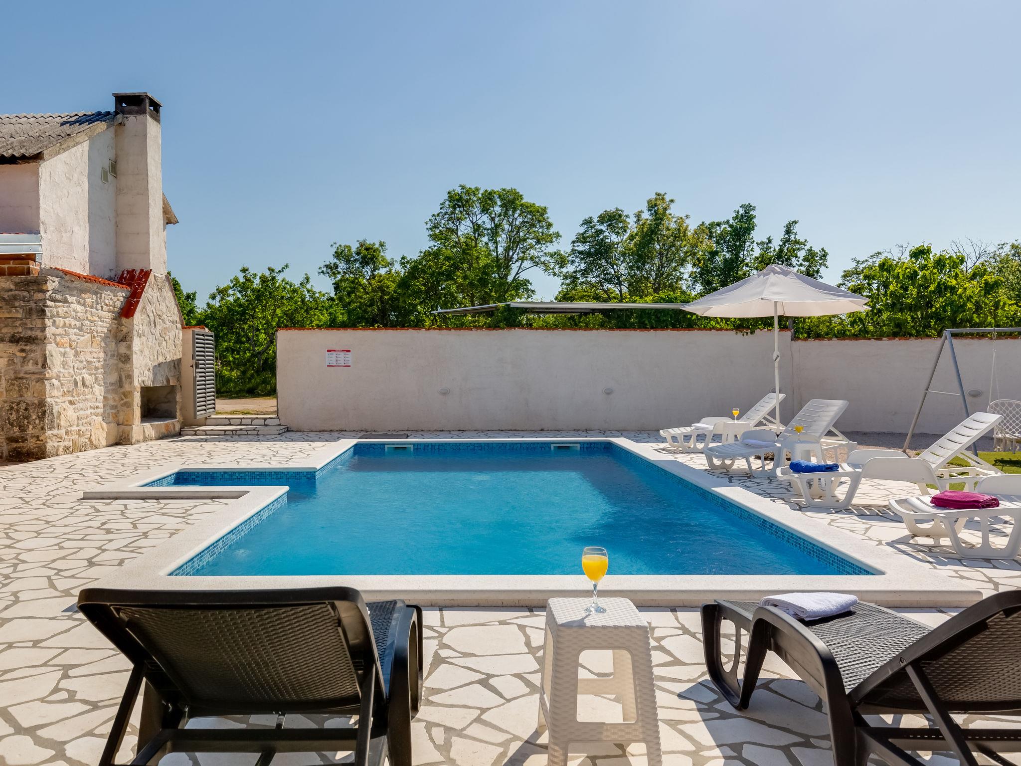 Pridraga 9 km from Novigrad: Single-family house "Branka". 2 km from the centre of Pridraga, in a quiet, sunny position, 3 km from the sea, 3 km from the beach. Private: property 2'000 m2 (fenced), swimming pool angular (8 x 4 m, depth 145 cm, seasonal availability: 01.May. - 01.Oct.) with internal staircase. Table tennis, terrace (15 m2), garden furniture, barbecue. In the house: internet access, washing machine. Parking (for 2 cars) at the house on the premises. Shop 500 m, restaurant 9 km, bus stop 16.6 km, pebble beach 3 km.