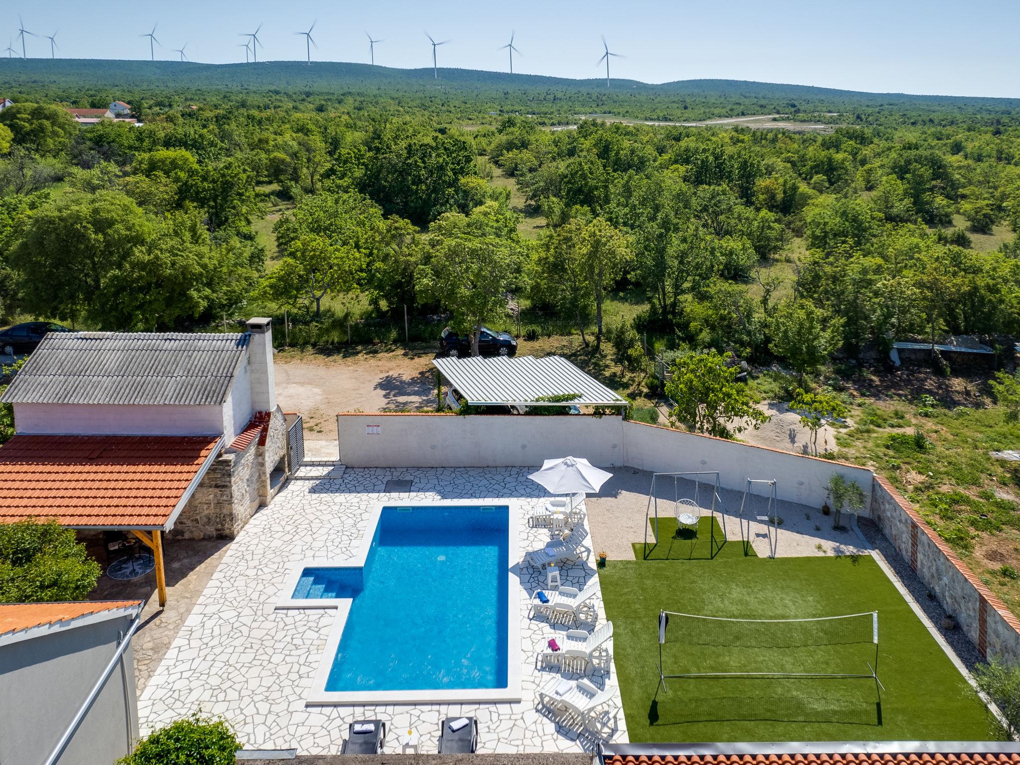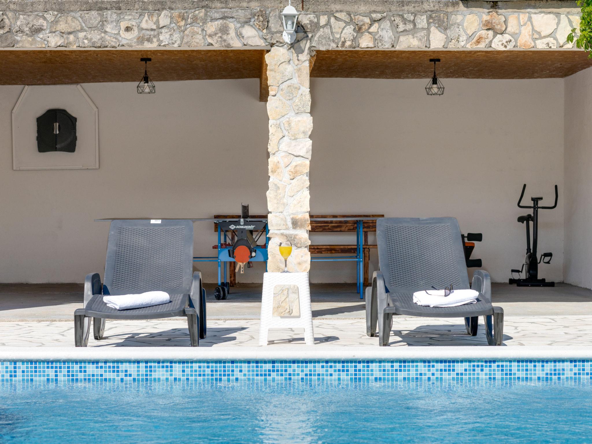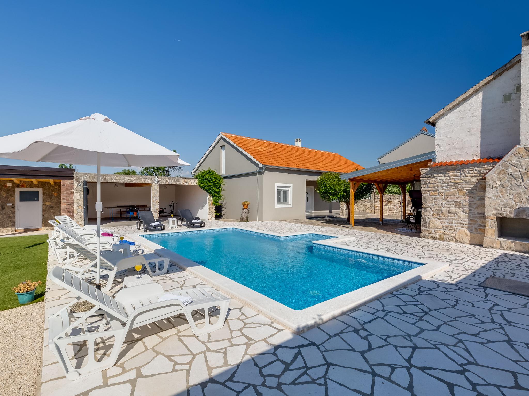 Pridraga 9 km from Novigrad: Single-family house "Branka". 2 km from the centre of Pridraga, in a quiet, sunny position, 3 km from the sea, 3 km from the beach. Private: property 2'000 m2 (fenced), swimming pool angular (8 x 4 m, depth 145 cm, seasonal availability: 01.May. - 01.Oct.) with internal staircase. Table tennis, terrace (15 m2), garden furniture, barbecue. In the house: internet access, washing machine. Parking (for 2 cars) at the house on the premises. Shop 500 m, restaurant 9 km, bus stop 16.6 km, pebble beach 3 km.