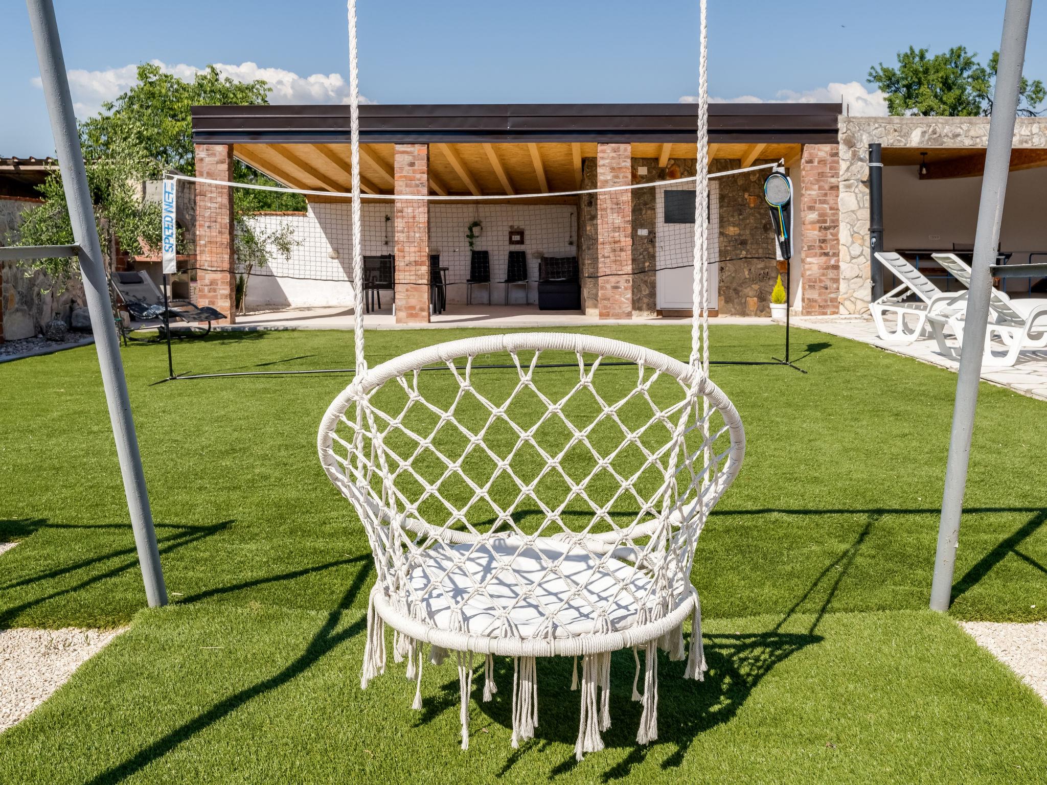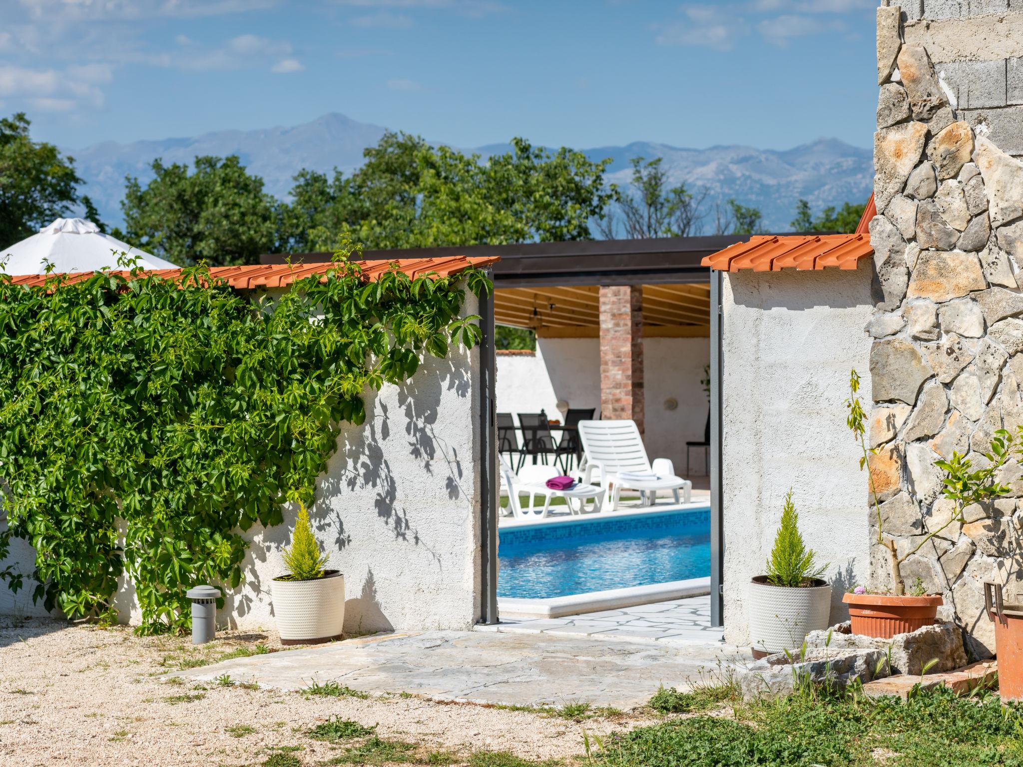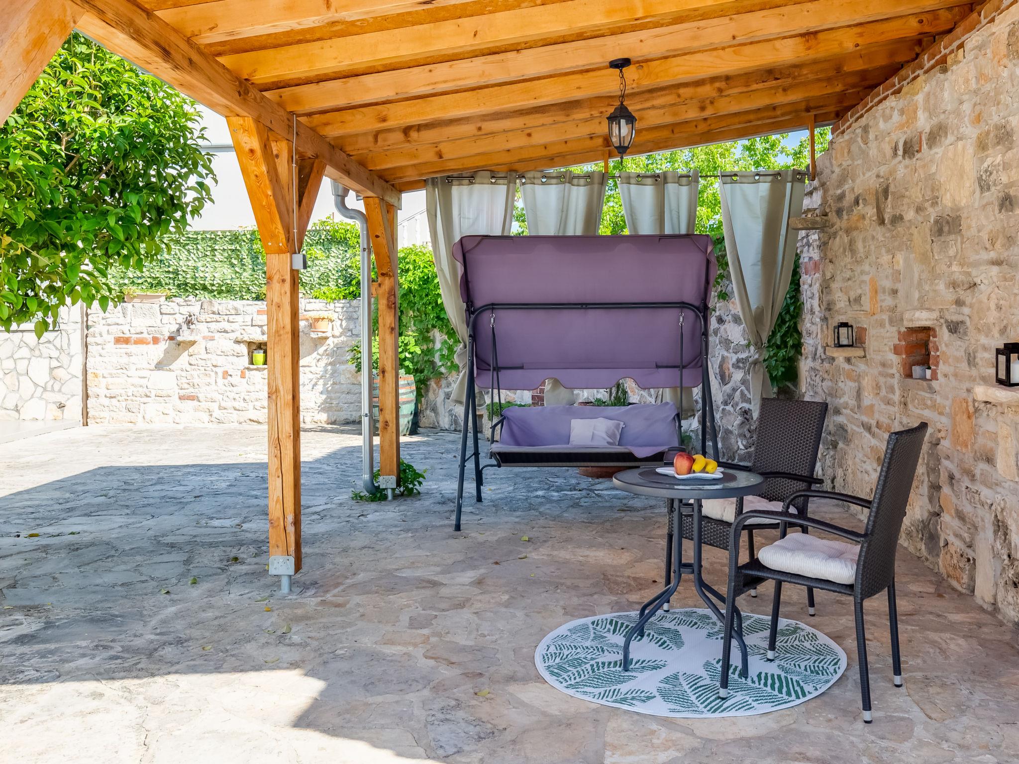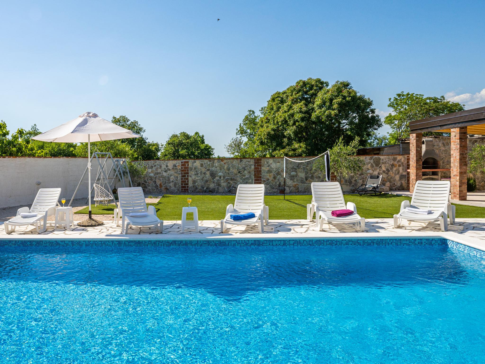 Pridraga 9 km from Novigrad: Single-family house "Branka". 2 km from the centre of Pridraga, in a quiet, sunny position, 3 km from the sea, 3 km from the beach. Private: property 2'000 m2 (fenced), swimming pool angular (8 x 4 m, depth 145 cm, seasonal availability: 01.May. - 01.Oct.) with internal staircase. Table tennis, terrace (15 m2), garden furniture, barbecue. In the house: internet access, washing machine. Parking (for 2 cars) at the house on the premises. Shop 500 m, restaurant 9 km, bus stop 16.6 km, pebble beach 3 km.