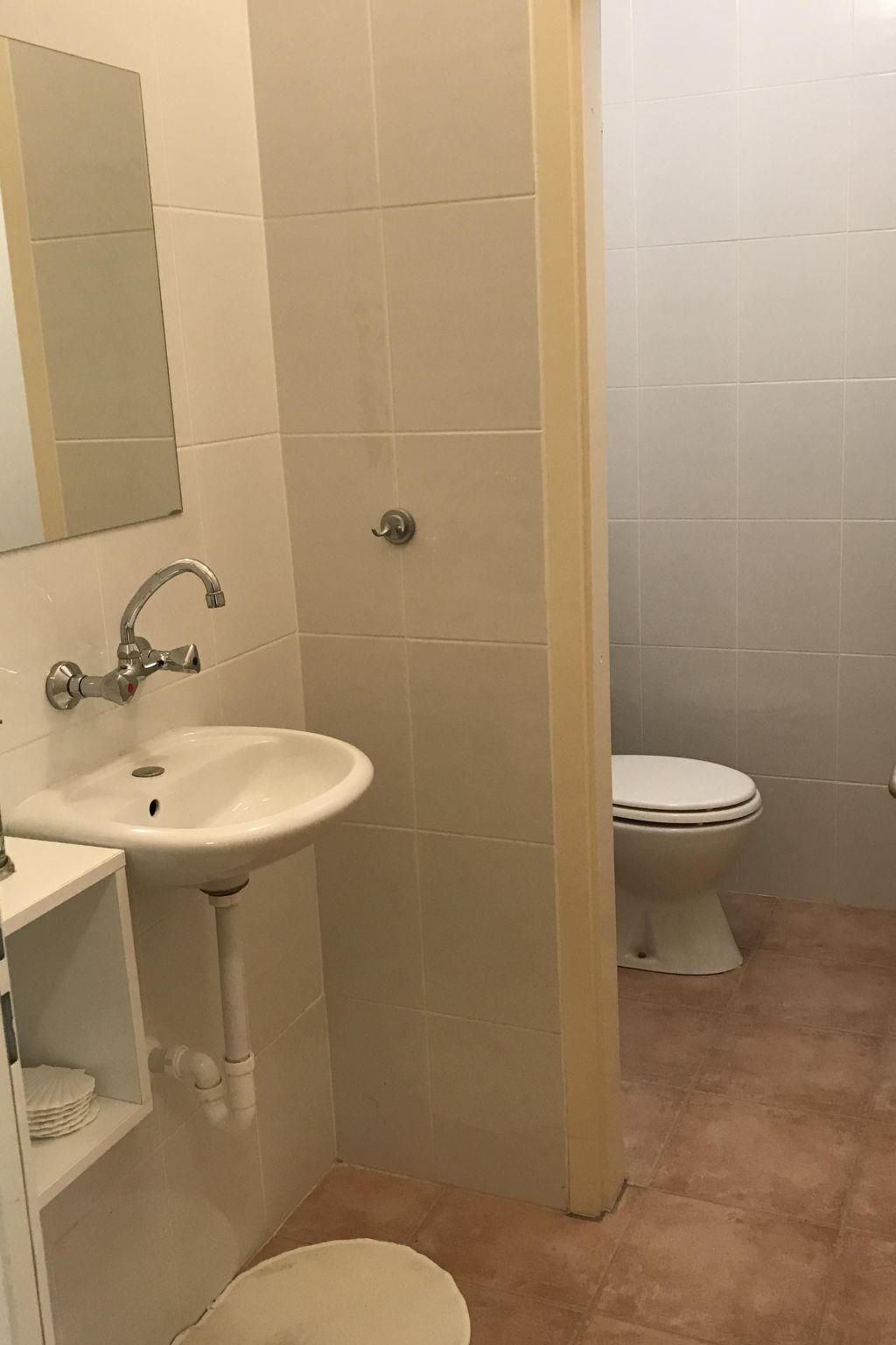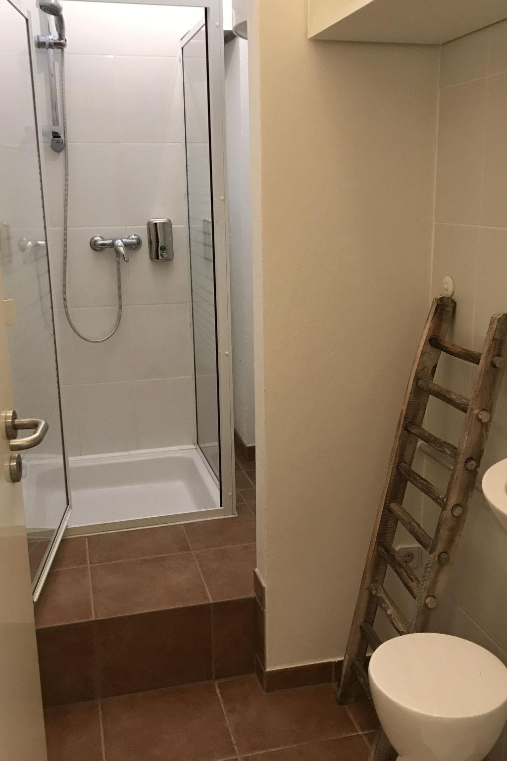 The bathroom consists of 2 separate rooms. One room is equipped with a shower and washbasin and the other room has a separate WC with washbasin.