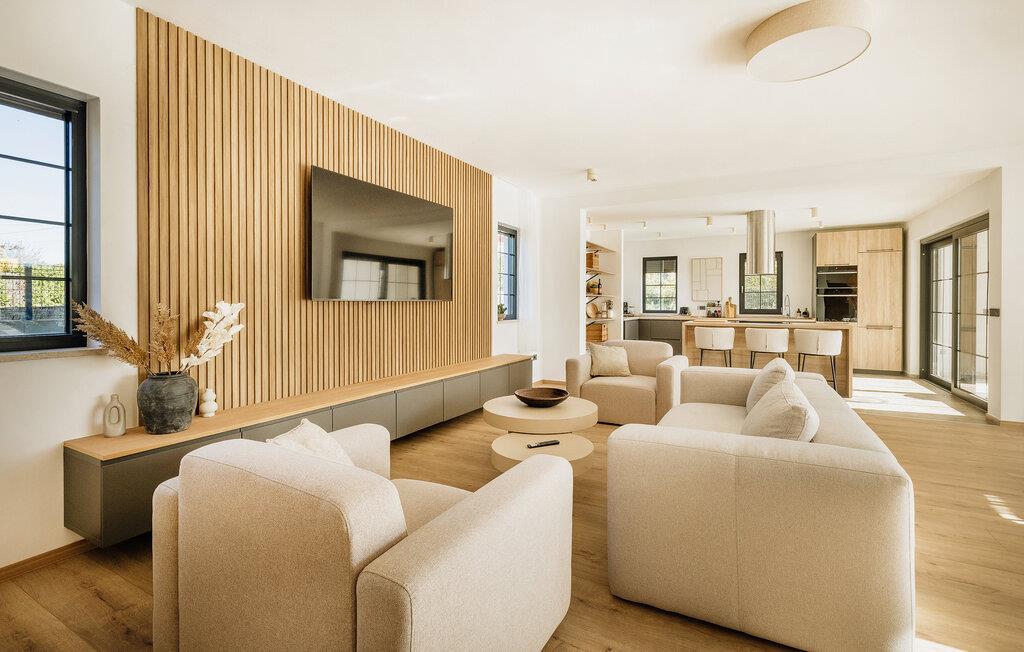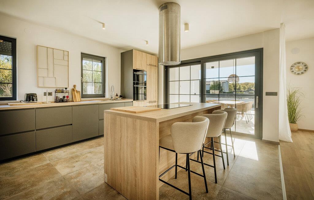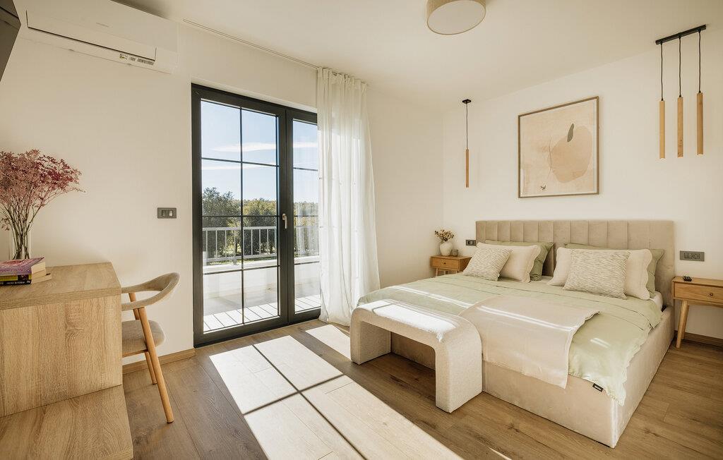 Jeres stilfulde feriehus er noget særligt med sine rummelige opholdsområder, et fitnessrum og en fredelig beliggenhed, men alligevel tæt på de smukkeste dele af Istriens kyst. Fra første sal kan I også nyde en storslået havudsigt. I den lyse opholdsstue skaber bløde farver, store vinduer og møbler af høj kvalitet en særlig atmosfære af velvære. Brug den komfortable sofa og lænestole til afslappende aftener og tilbered jeres måltider i det elegant udstyrede køkken. Træn dagligt i fitnessrummet og planlæg jeres dag efter jeres egne præferencer.