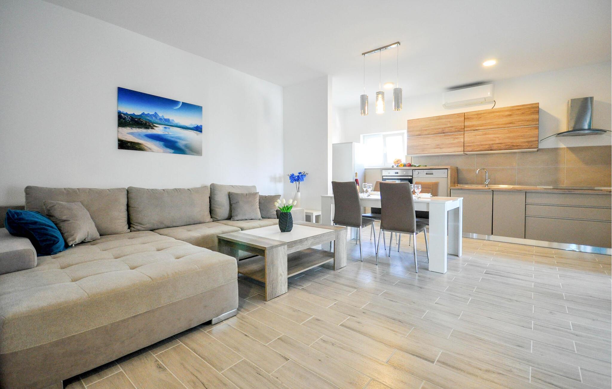 Denne moderne og komfortabelt møblerede lejlighed er den perfekte oase til jeres ferie. Træ i varme farver, en komfortabel sofagruppe og det moderne køkken skaber en atmosfære, hvor I vil føle jer hjemme fra starten. Sæt jer med en god bog, lav mad sammen eller tilbring en filmaften på sofaen – og slap af.