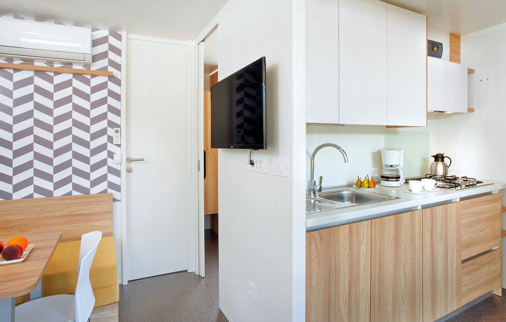 Beliggende i en feriepark direkte på stranden tilbyder dette hus alt, hvad I behøver for en ubekymret ferie. En lys stue med en behagelig sofa lægger op til afslappende timer med at snakke, nyde kaffe eller se fjernsyn. I det veludstyrede køkken kan I tilberede friske måltider og prøve en god kroatisk vin.