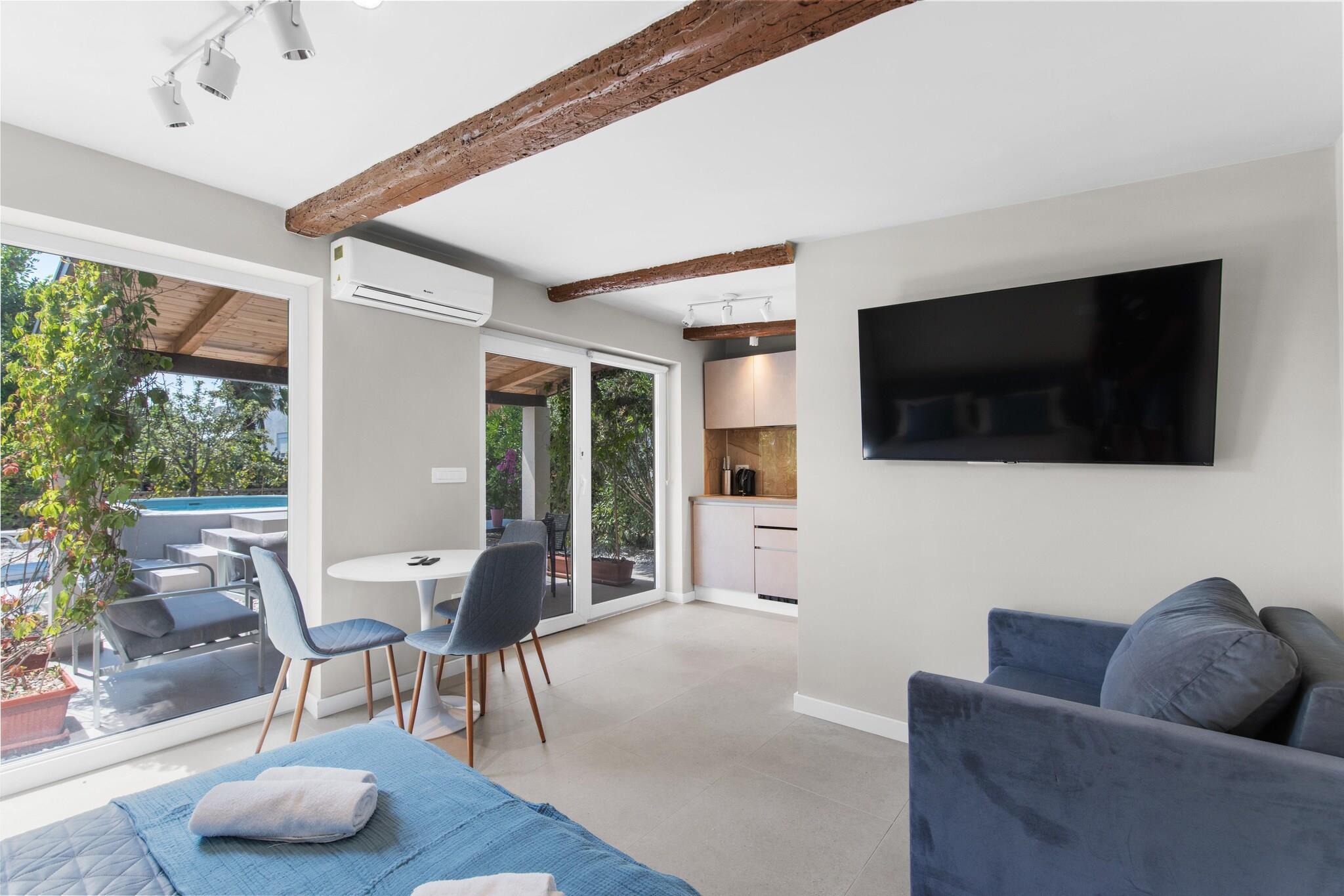 Stueetage: (Køkken(elkedel, brødrister, komfur, kaffemaskine(kaffetragt), combi-mikroovn, opvaskemaskine , køle-fryseskab, , Wine glasses), stue / spisestue(Fjernsyn(parabol), spisebord), soveværelse(enkeltsovesofa, dobbeltseng(180 x 200 cm)), badeværelse(bruser, håndvask, toilet, vaskemaskine, føntørrer), terrasse(privat)) klimaanlæg, have(privat), havemøbler, solstole, grill, parkering, liggestole, Parasol, swimmingpool(privat), strygejern, loungemøbler