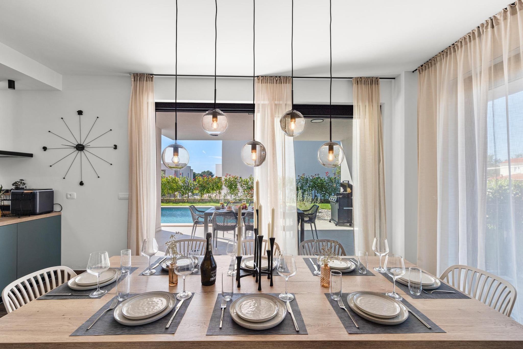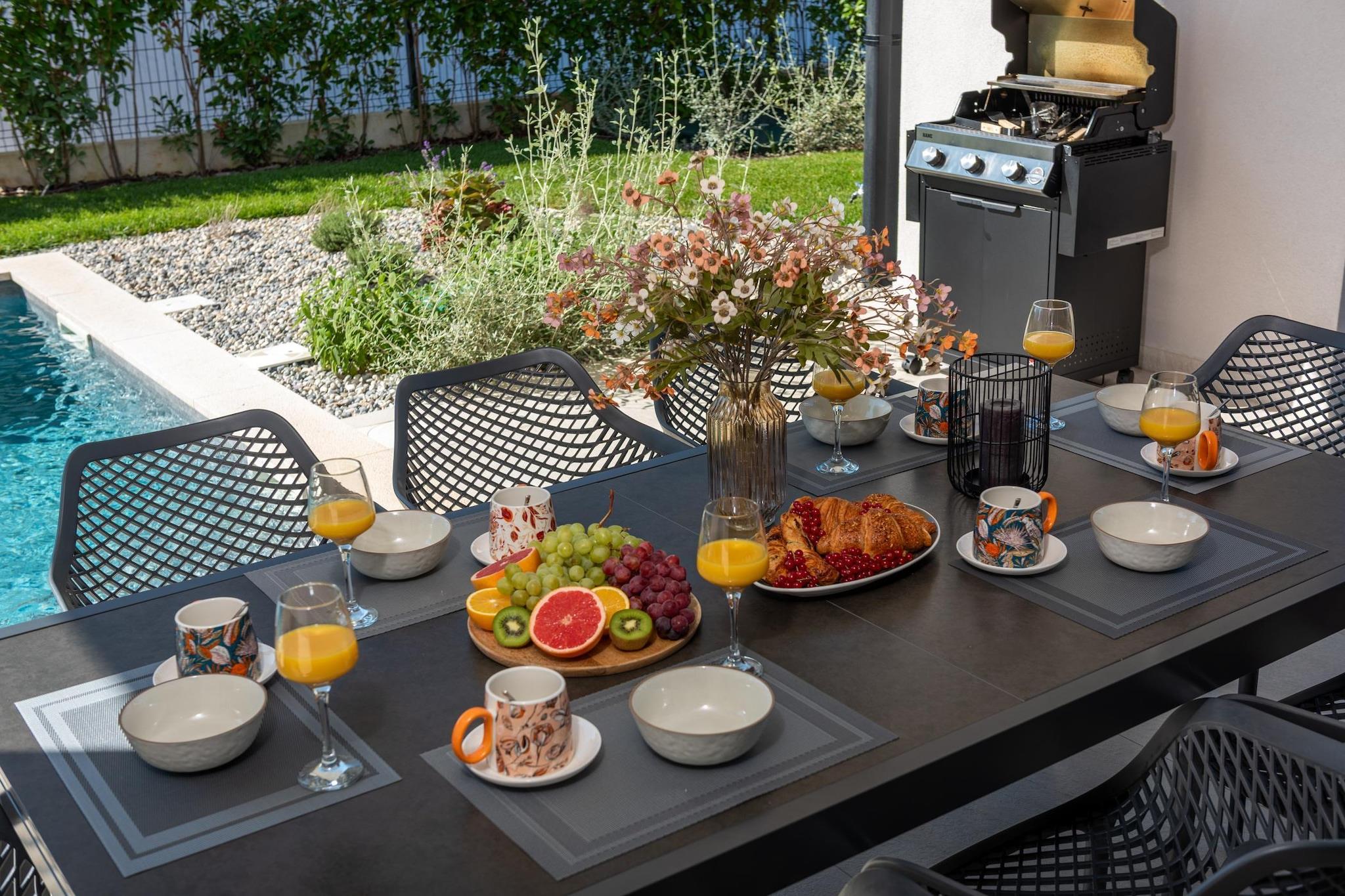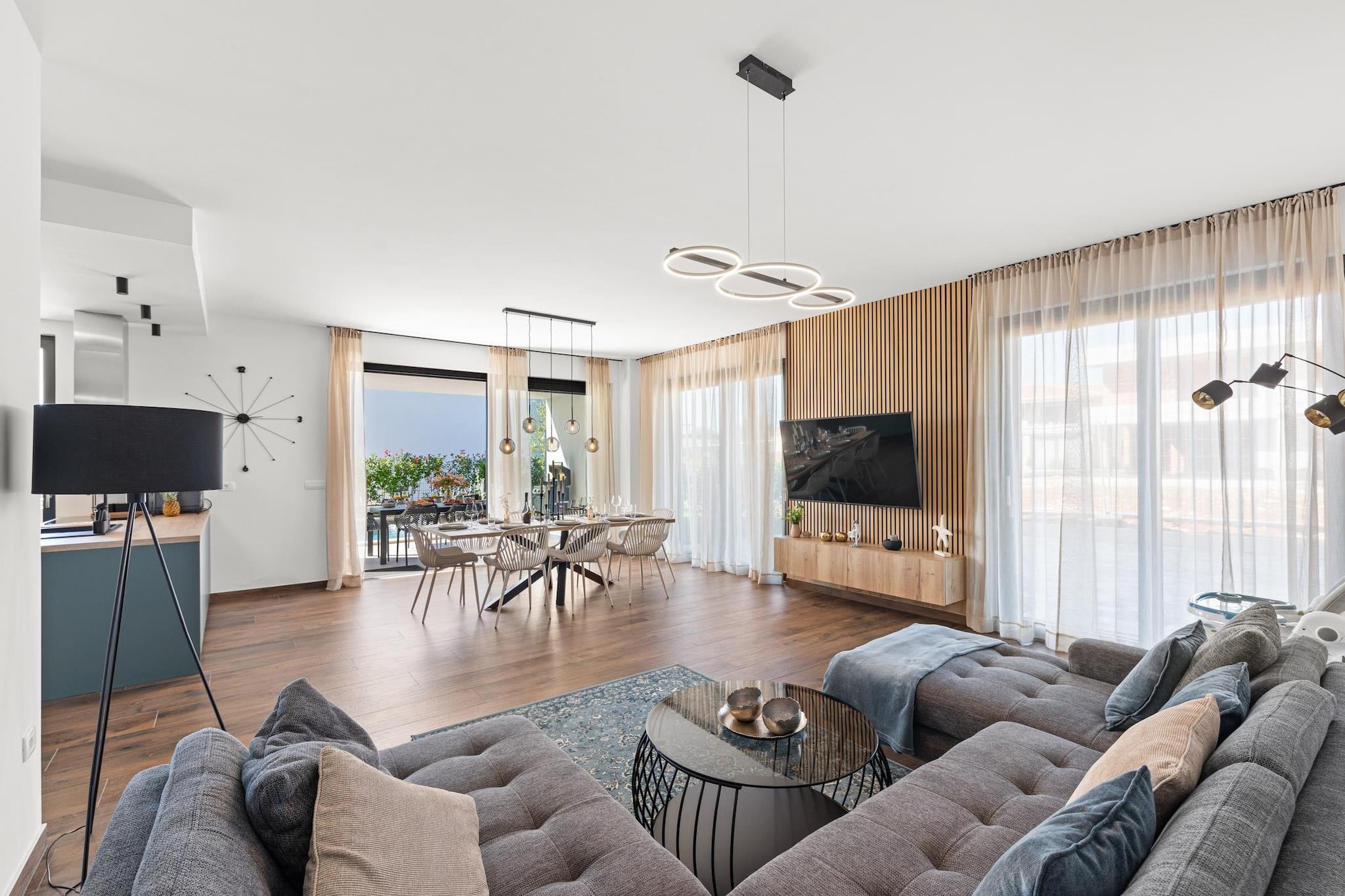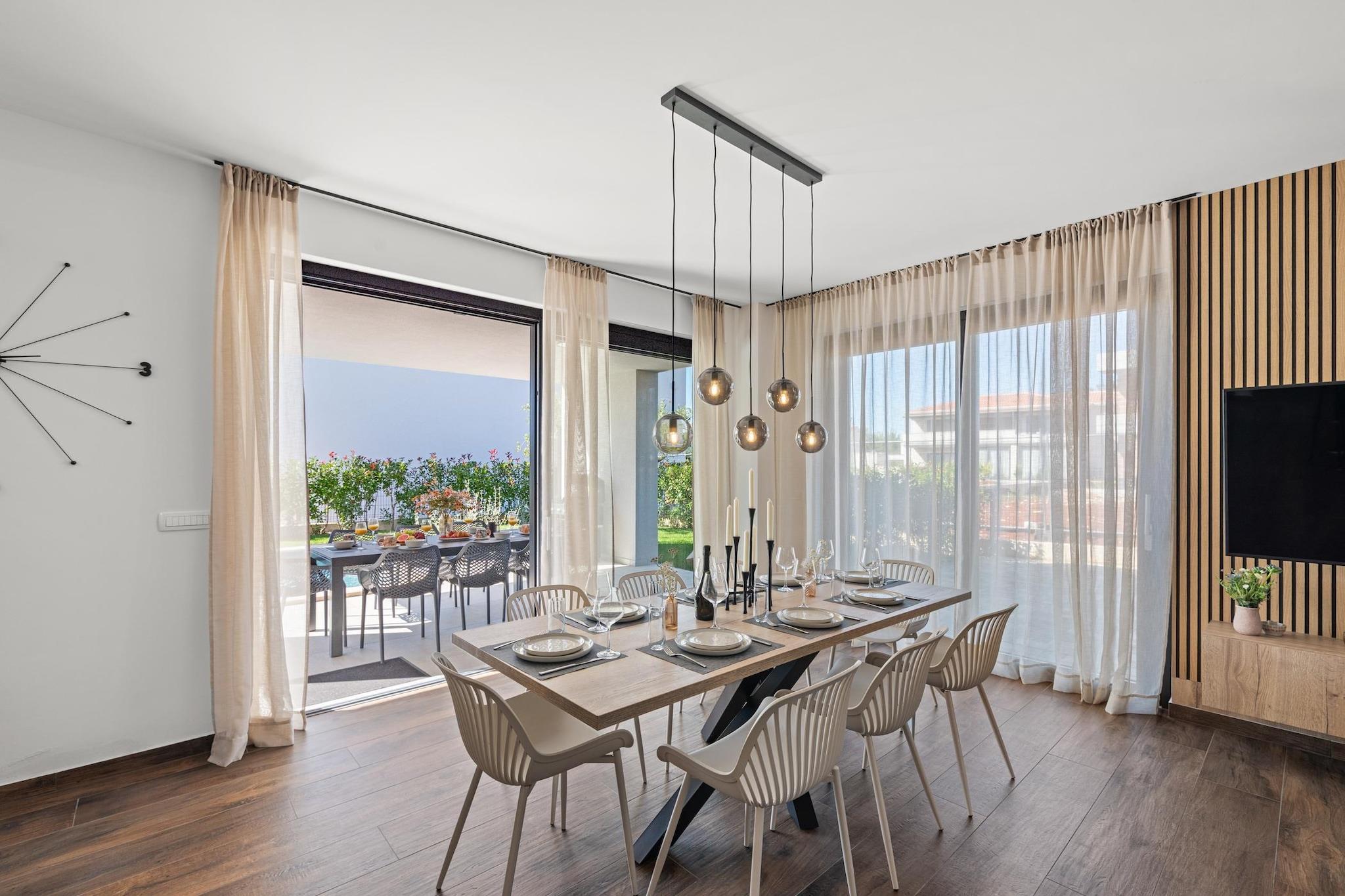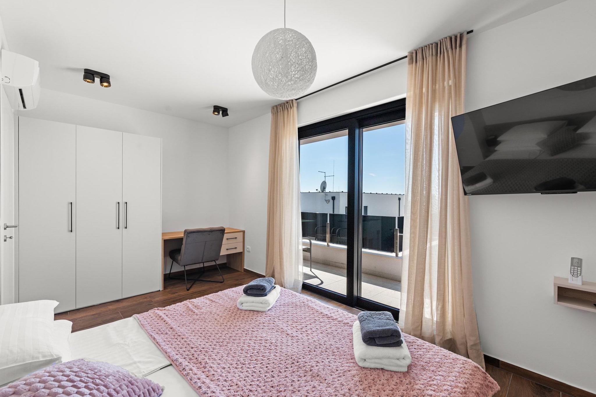 Denne exceptionelle villa tilbyder en høj standard af komfort og privatliv, perfekt designet til en stor familie eller en gruppe venner. Stueetagen har et lyst, åbent køkken, der er fuldt udstyret med moderne apparater, herunder ovn, mikrobølgeovn, opvaskemaskine og et stort køleskab med fryser, samt essentielle madlavningsprodukter. Dette rum løber ud i en rummelig stue/spisestue møbleret med spisebord og et komfortabelt siddeområde med satellit-tv. For nemheds skyld rummer stueetagen også det første dobbeltværelse med eget badeværelse (bruser, håndvask, toilet). På første sal er der de resterende tre sovesuiter, der hver tilbyder fuldstændig privatliv. Den består af tre yderligere dobbeltværelser, der hver har sit eget badeværelse med bruser, håndvask og toilet, hvilket sikrer, at alle gæster har deres egne private faciliteter. Hele villaen er udstyret med essentielle moderne bekvemmeligheder som internetadgang, aircondition og vaskemaskine. Der er også varme, hvilket gør den behagelig til ophold året rundt. Udendørsområdet er et sandt højdepunkt og giver en privat oase til afslapning. Gæsterne kan nyde en privat swimmingpool omgivet af en terrasse og have møbleret med liggestole og havemøbler. Der er grill til udendørs spisning. Ejendommen har også en balkon eller terrasse og bekvem parkering på stedet. Villaen ligger kun 1,5 km fra restauranter og 2,0 km fra stranden og tilbyder afsondrethed uden at ofre nem adgang til faciliteter og attraktioner.
