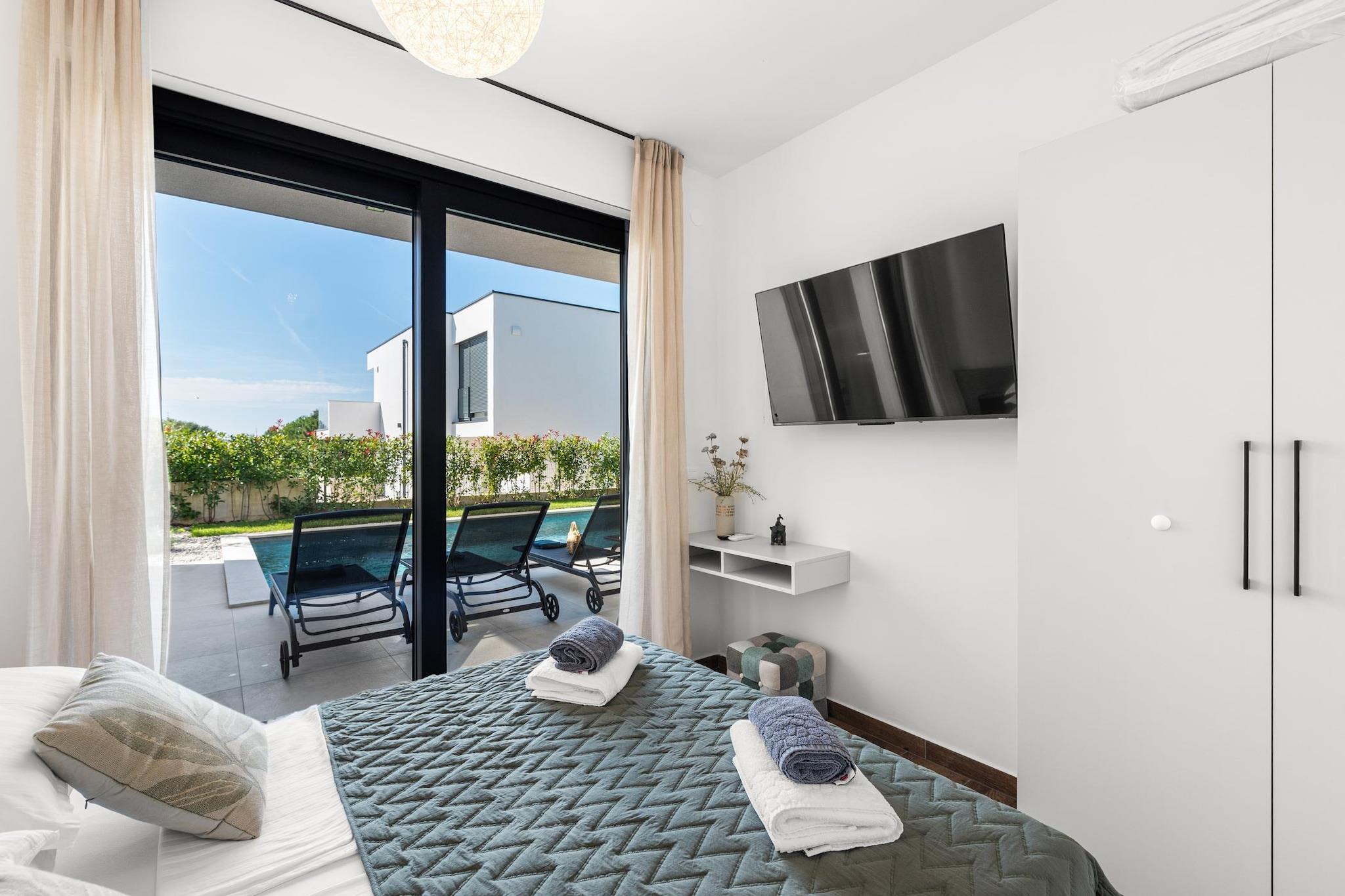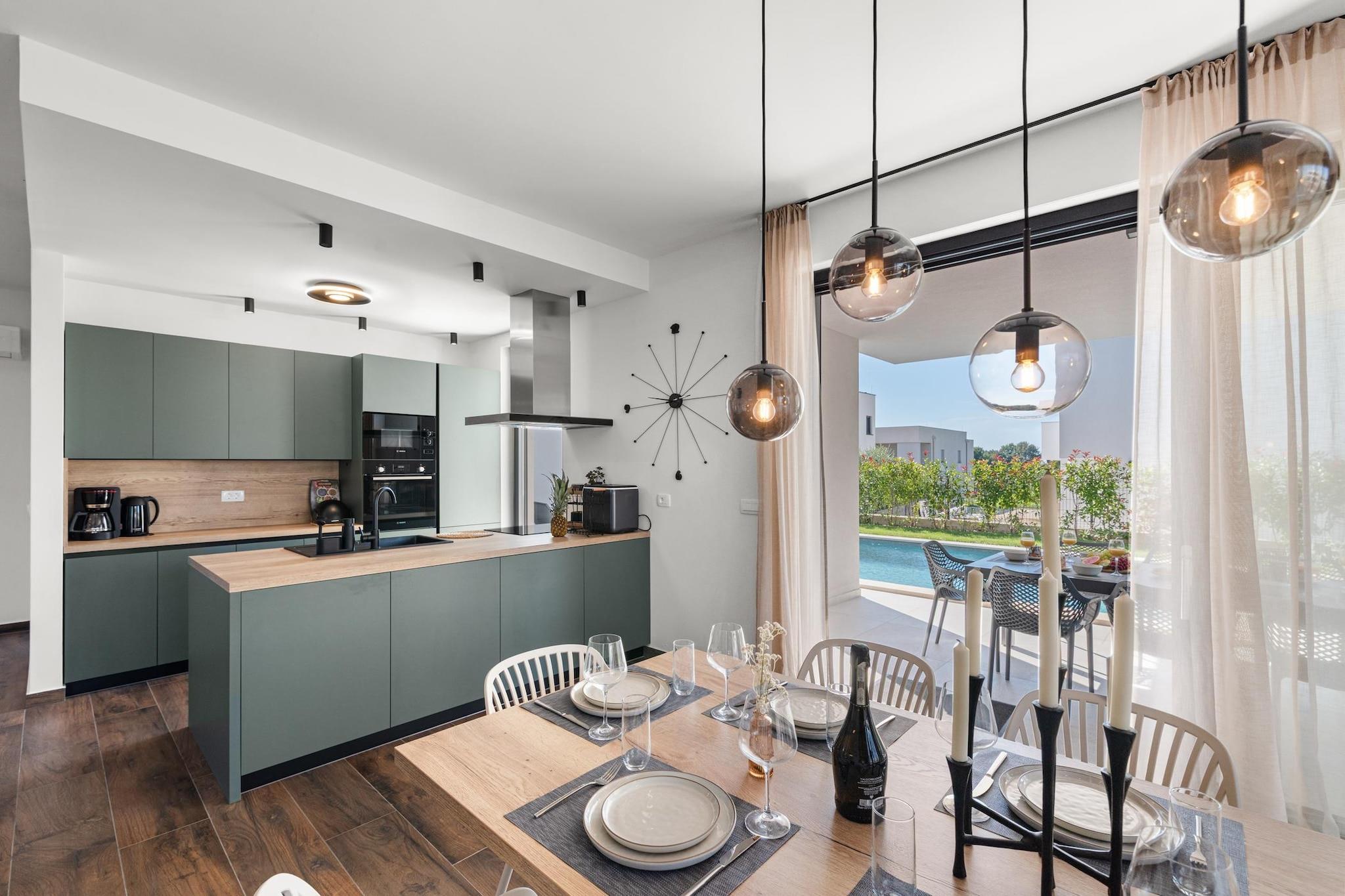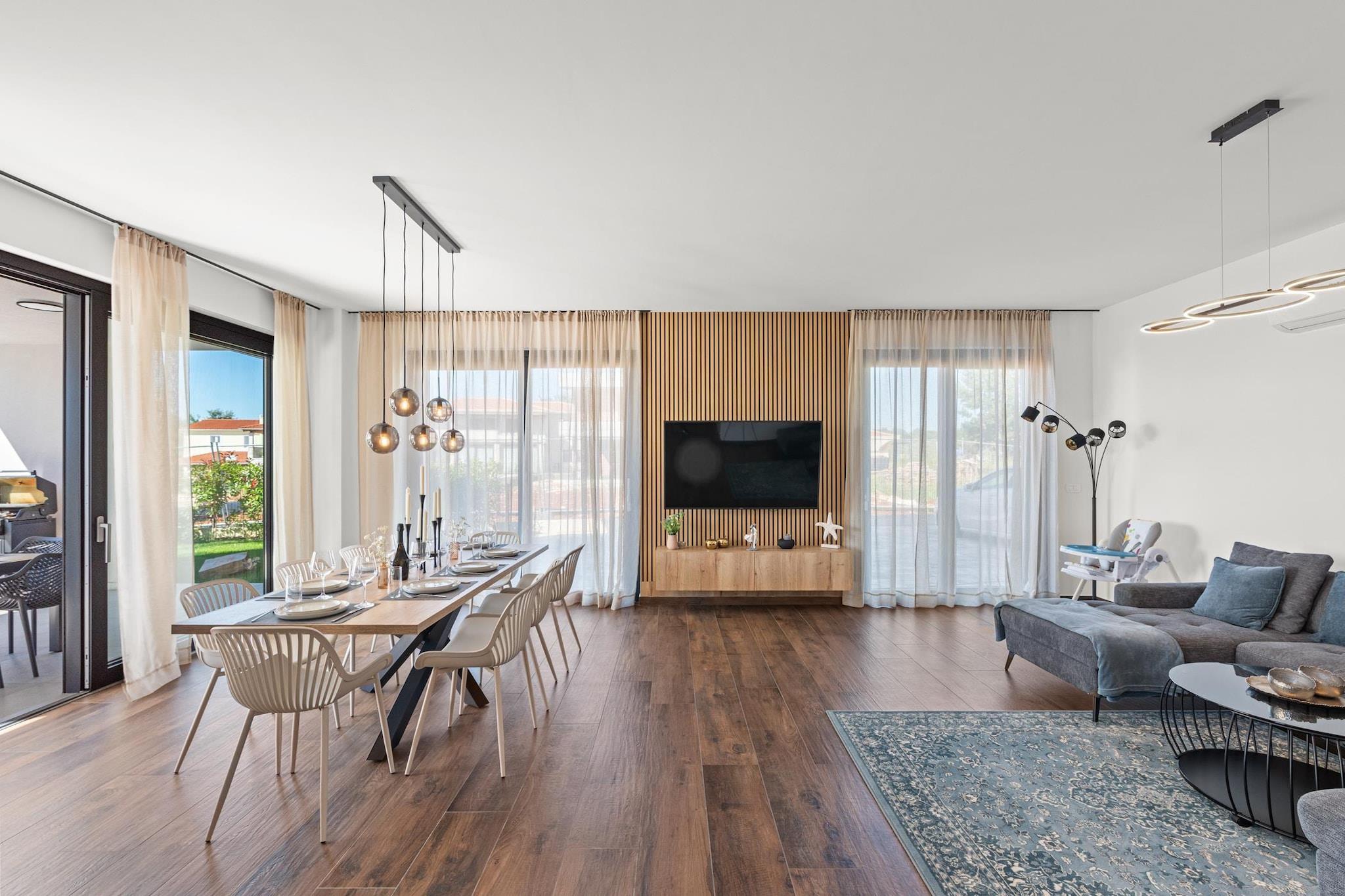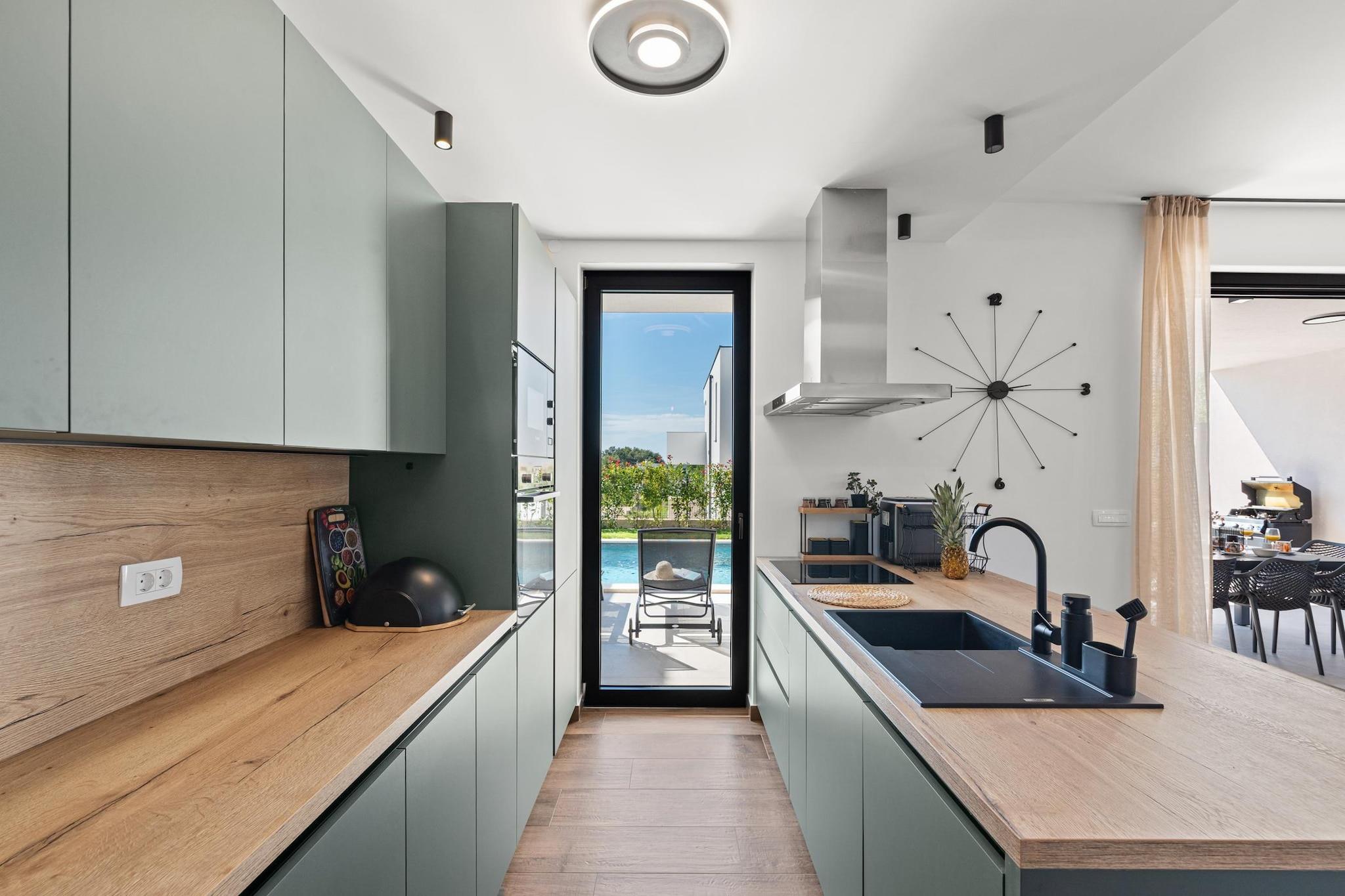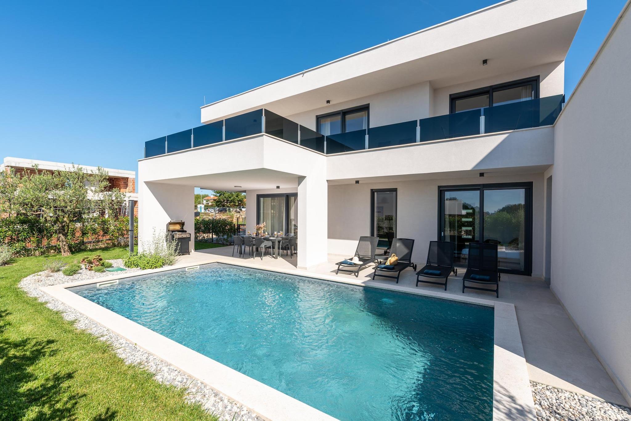 Denne exceptionelle villa tilbyder en høj standard af komfort og privatliv, perfekt designet til en stor familie eller en gruppe venner. Stueetagen har et lyst, åbent køkken, der er fuldt udstyret med moderne apparater, herunder ovn, mikrobølgeovn, opvaskemaskine og et stort køleskab med fryser, samt essentielle madlavningsprodukter. Dette rum løber ud i en rummelig stue/spisestue møbleret med spisebord og et komfortabelt siddeområde med satellit-tv. For nemheds skyld rummer stueetagen også det første dobbeltværelse med eget badeværelse (bruser, håndvask, toilet). På første sal er der de resterende tre sovesuiter, der hver tilbyder fuldstændig privatliv. Den består af tre yderligere dobbeltværelser, der hver har sit eget badeværelse med bruser, håndvask og toilet, hvilket sikrer, at alle gæster har deres egne private faciliteter. Hele villaen er udstyret med essentielle moderne bekvemmeligheder som internetadgang, aircondition og vaskemaskine. Der er også varme, hvilket gør den behagelig til ophold året rundt. Udendørsområdet er et sandt højdepunkt og giver en privat oase til afslapning. Gæsterne kan nyde en privat swimmingpool omgivet af en terrasse og have møbleret med liggestole og havemøbler. Der er grill til udendørs spisning. Ejendommen har også en balkon eller terrasse og bekvem parkering på stedet. Villaen ligger kun 1,5 km fra restauranter og 2,0 km fra stranden og tilbyder afsondrethed uden at ofre nem adgang til faciliteter og attraktioner.