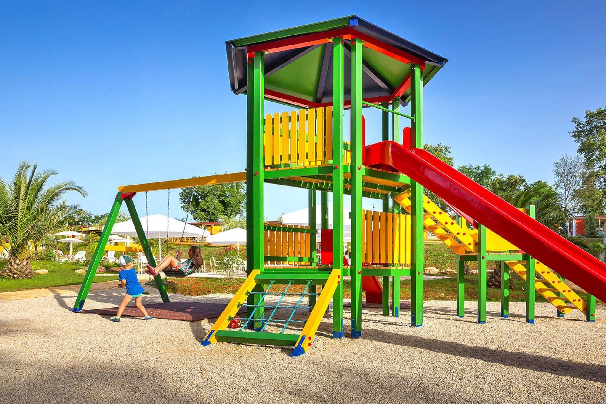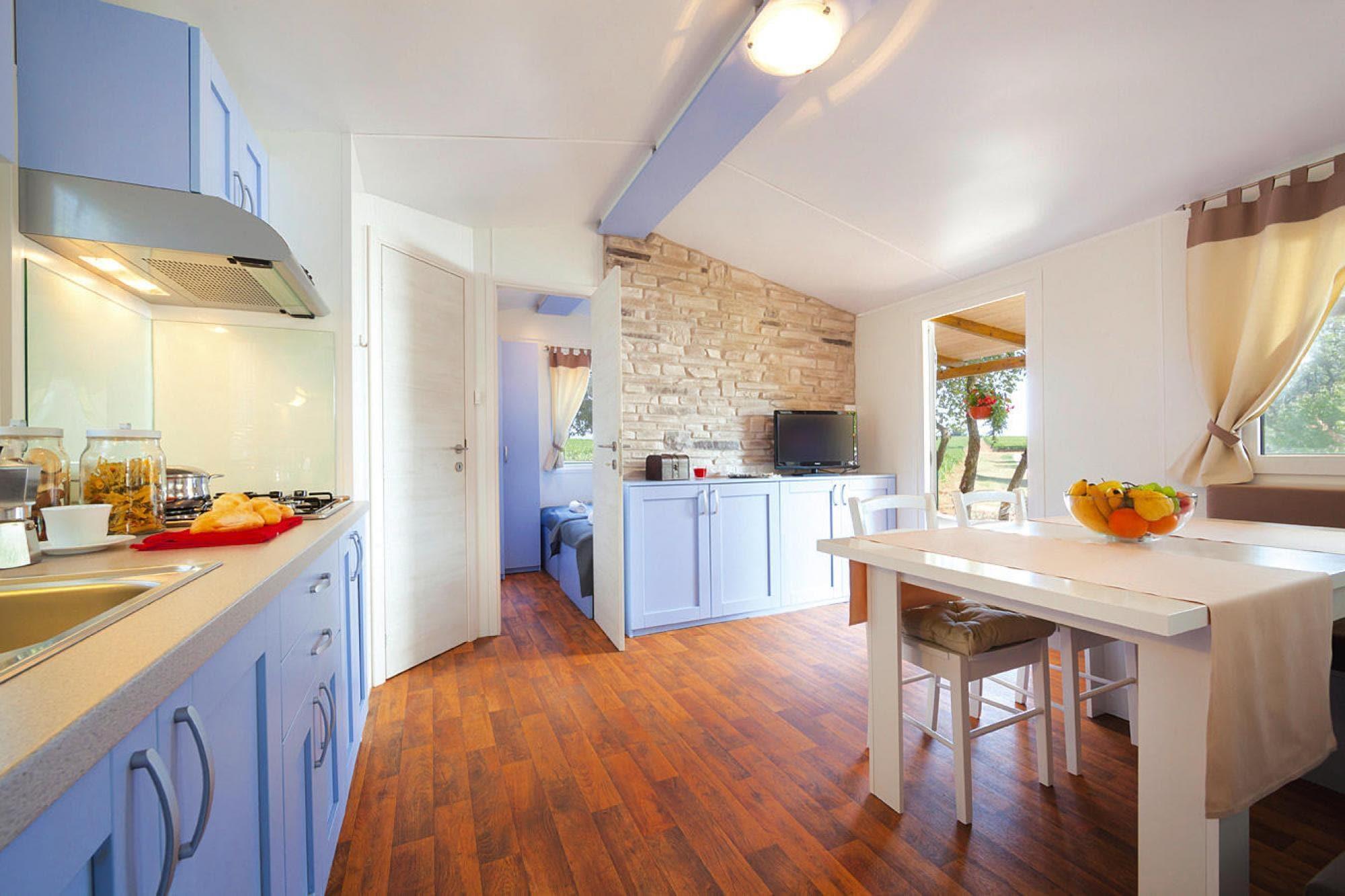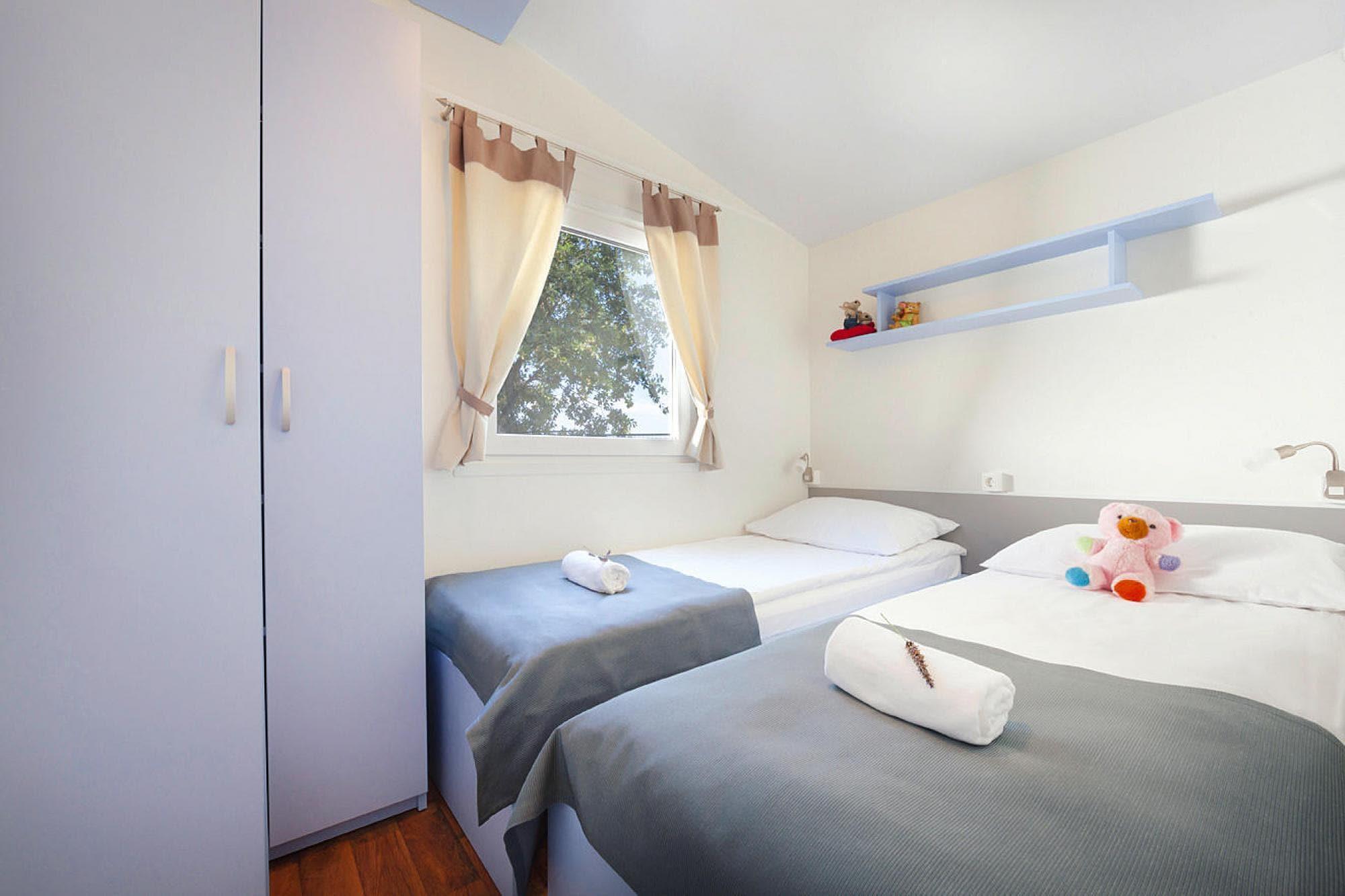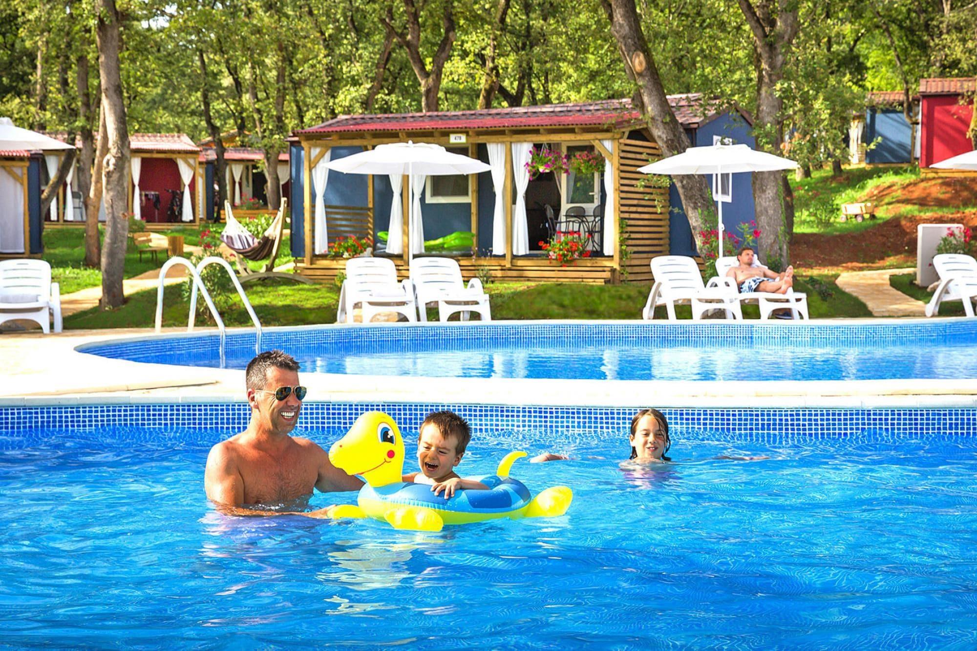 Bilfrit campingvognsskur lige ved havet og midt i en egeskov, omgivet af flere hektar vinmarker. Et særligt kendetegn ved banen er en udendørs pool fyldt med havvand og en olivenoliehave med 170 træer. Nogle af mobilhomes er placeret i den bakkede del af campingvognsparken og er grupperet omkring en grillplads og et børneområde efter forbillede i tidligere landsbyer. Andre danner til gengæld en såkaldt istrisk landsby, som fungerer uafhængigt af resten af parken. Det ydre af disse mobilhomes minder om typiske istriske stenhuse. Her fuldender den private køkkenhave tilbagevenden til naturen. Du kan hjælpe dig selv til de naturligt dyrkede grøntsager gratis. Du kan også finde flere mobilhomes beliggende under skyggefulde træer nær to nybyggede swimmingpools. Der er også et separat afslapningsområde med hængende liggestole, et fortelt og gynger. Den dels stenede, dels stenstrand, med en bred vifte af vandsport, strækker sig et par hundrede meter forbi campingvognsparken. Detaljer: WLAN-registreringsgebyr Aktiviteter i nærheden: Den historiske by Novigrad med italienske påvirkninger er kun 4 km væk. En tur til Baredine-hulerne i Nova Vas og den nærliggende by Porec kan også anbefales. Aquapark Istralandia byder på masser af spænding for besøgende i alle aldre. Vandverdenen, der dækker mere end 80.000 kvadratmeter, ligger mellem Novigrad og Brtonigla, kun omkring 9 km fra kysten Ikke egnet til personer med nedsat mobilitet