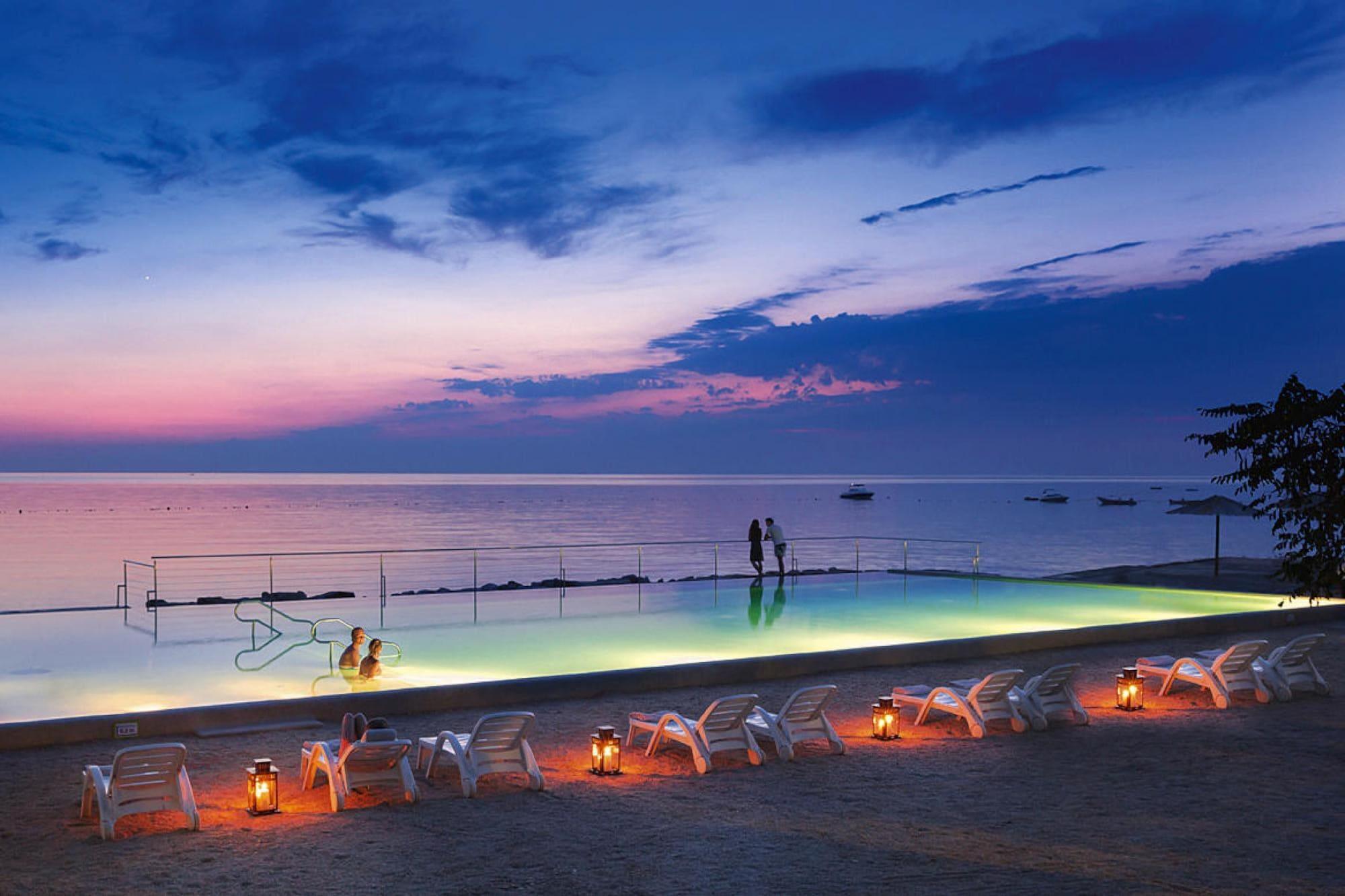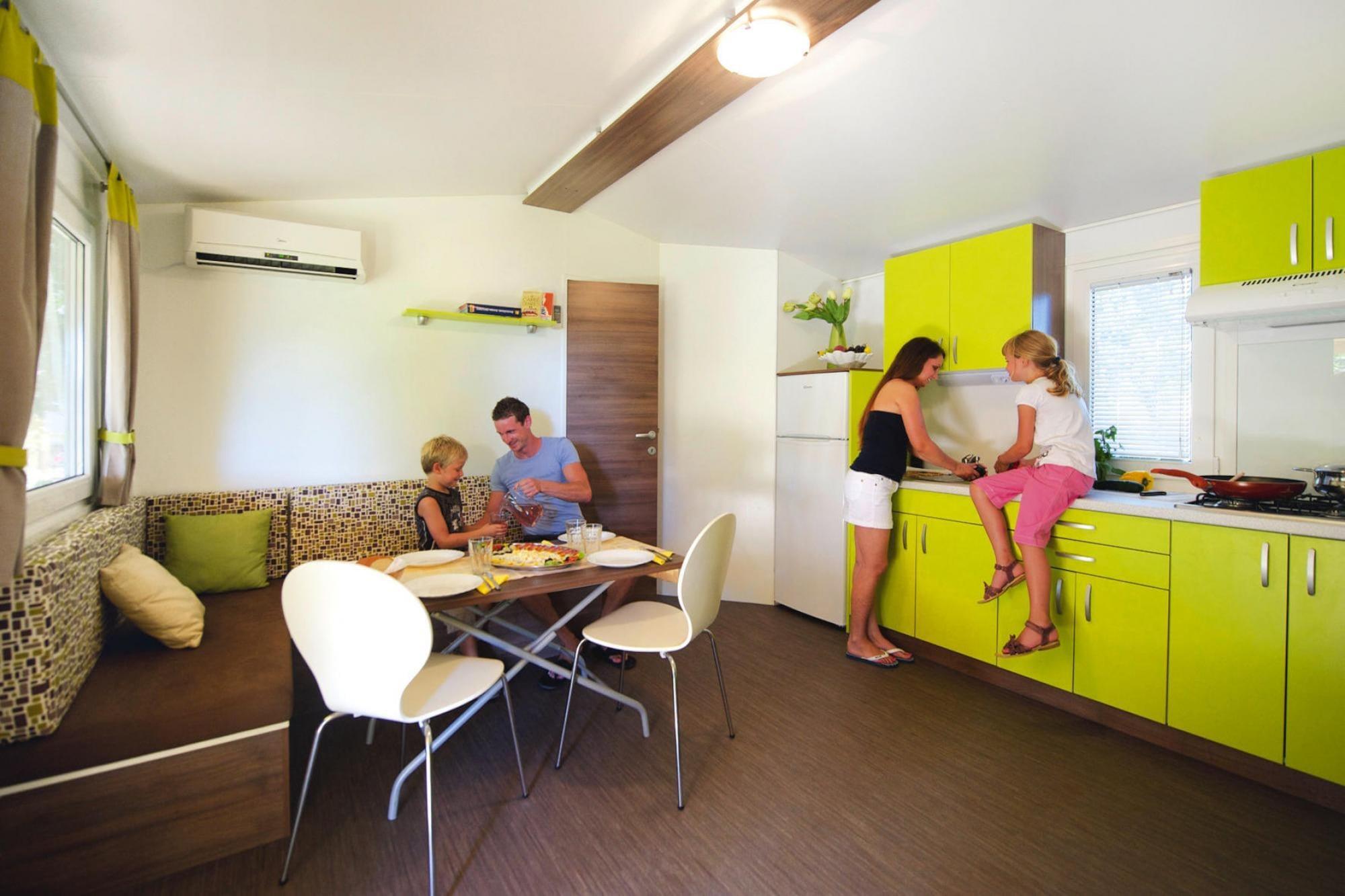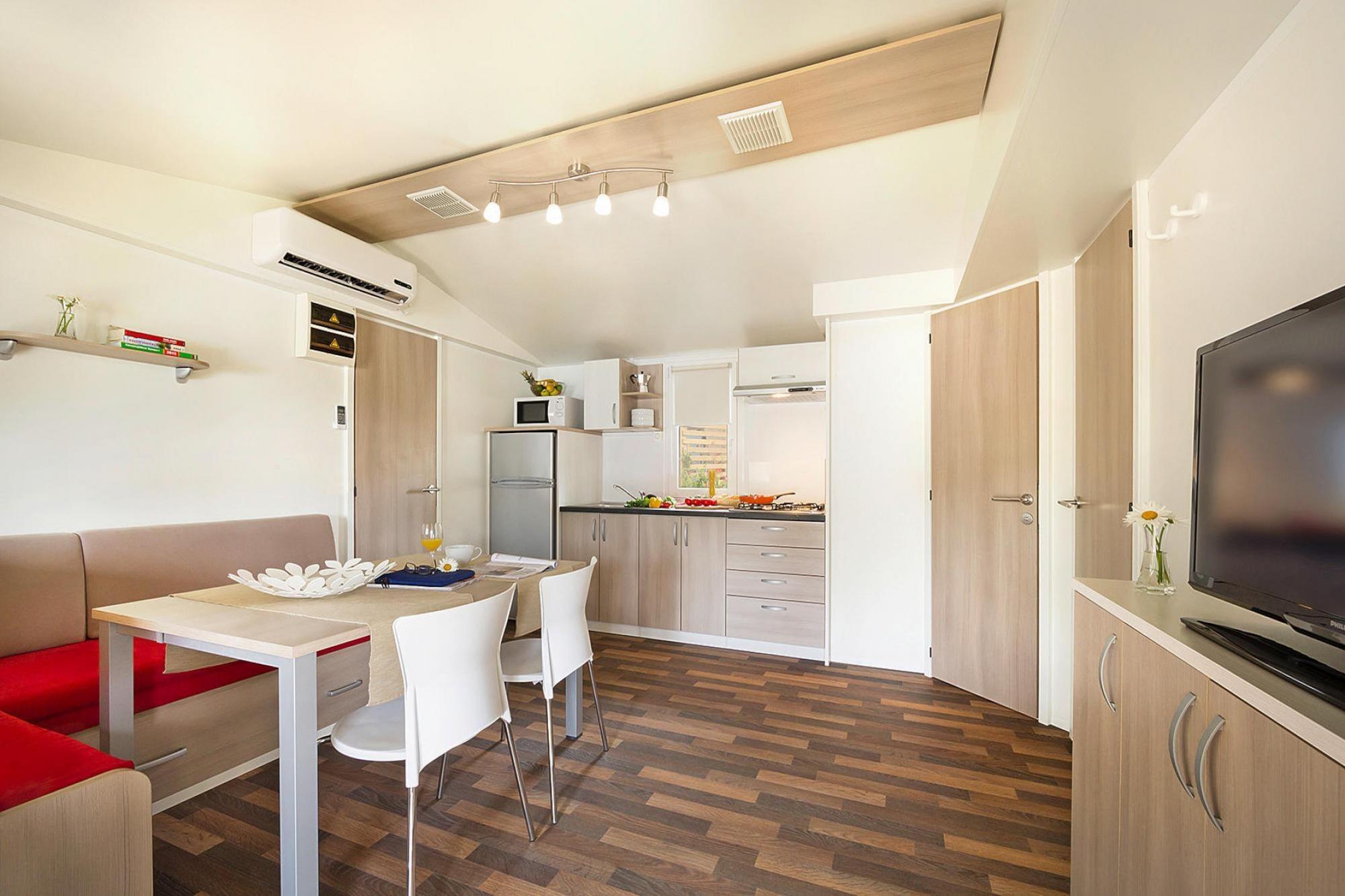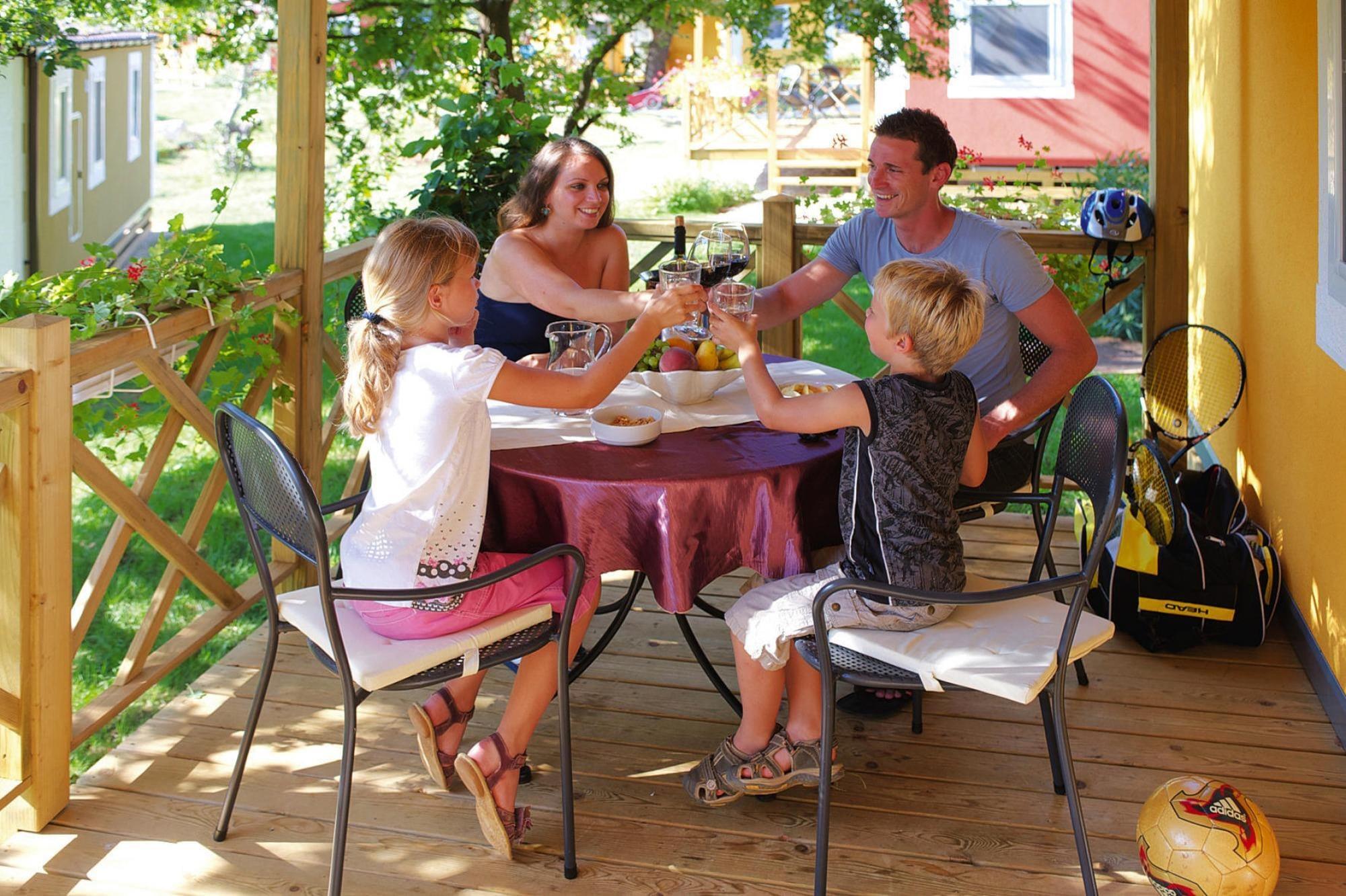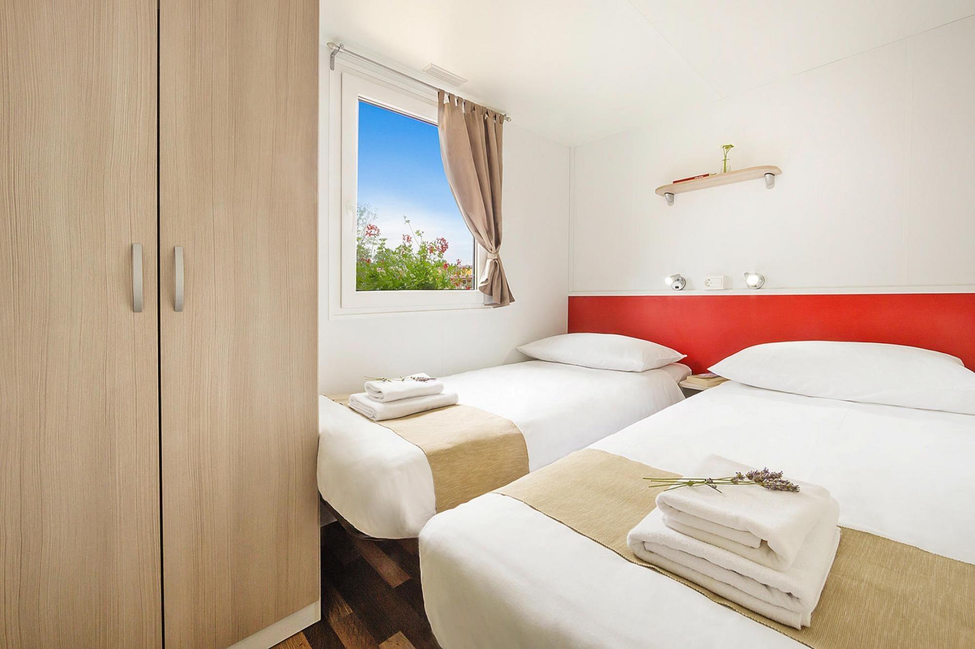 Bilfrit campingvognsskur lige ved havet og midt i en egeskov, omgivet af flere hektar vinmarker. Et særligt kendetegn ved banen er en udendørs pool fyldt med havvand og en olivenoliehave med 170 træer. Nogle af mobilhomes er placeret i den bakkede del af campingvognsparken og er grupperet omkring en grillplads og et børneområde efter forbillede i tidligere landsbyer. Andre danner til gengæld en såkaldt istrisk landsby, som fungerer uafhængigt af resten af parken. Det ydre af disse mobilhomes minder om typiske istriske stenhuse. Her fuldender den private køkkenhave tilbagevenden til naturen. Du kan hjælpe dig selv til de naturligt dyrkede grøntsager gratis. Du kan også finde flere mobilhomes beliggende under skyggefulde træer nær to nybyggede swimmingpools. Der er også et separat afslapningsområde med hængende liggestole, et fortelt og gynger. Den dels stenede, dels stenstrand, med en bred vifte af vandsport, strækker sig et par hundrede meter forbi campingvognsparken. Detaljer: WLAN-registreringsgebyr Aktiviteter i nærheden: Den historiske by Novigrad med italienske påvirkninger er kun 4 km væk. En tur til Baredine-hulerne i Nova Vas og den nærliggende by Porec kan også anbefales. Aquapark Istralandia byder på masser af spænding for besøgende i alle aldre. Vandverdenen, der dækker mere end 80.000 kvadratmeter, ligger mellem Novigrad og Brtonigla, kun omkring 9 km fra kysten Ikke egnet til personer med nedsat mobilitet