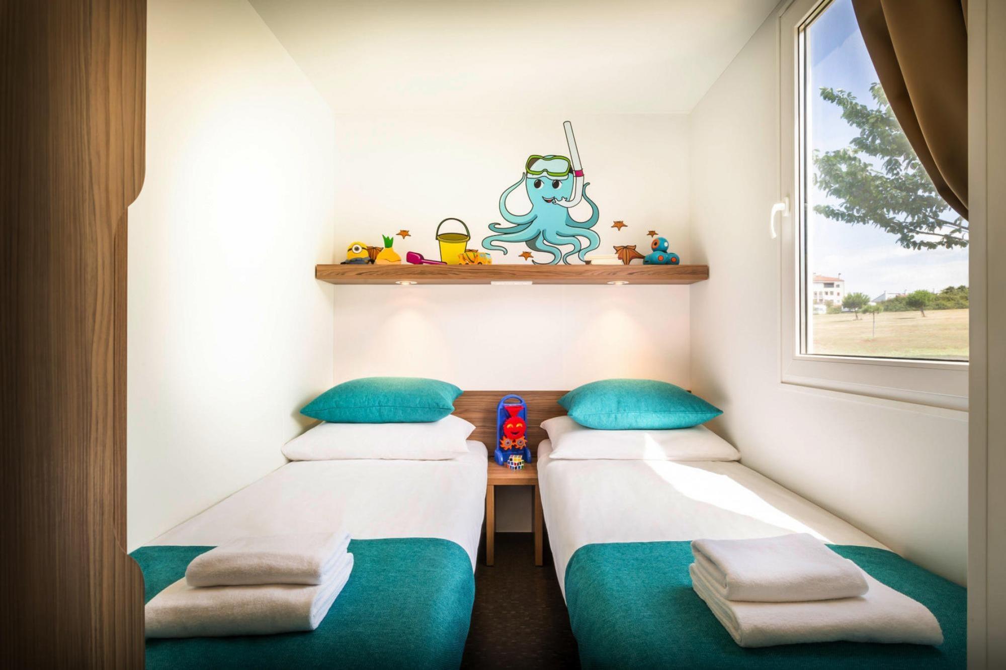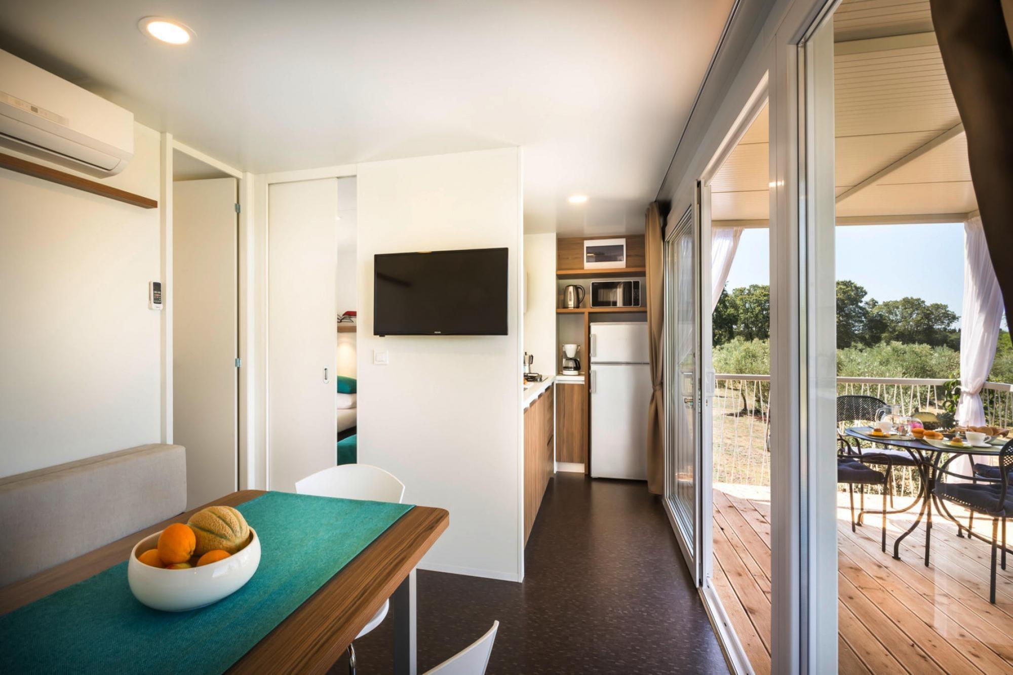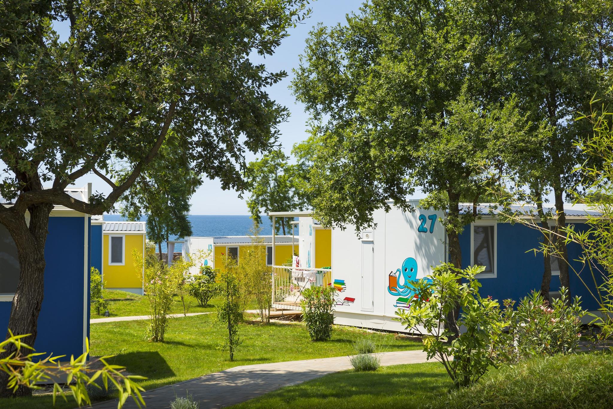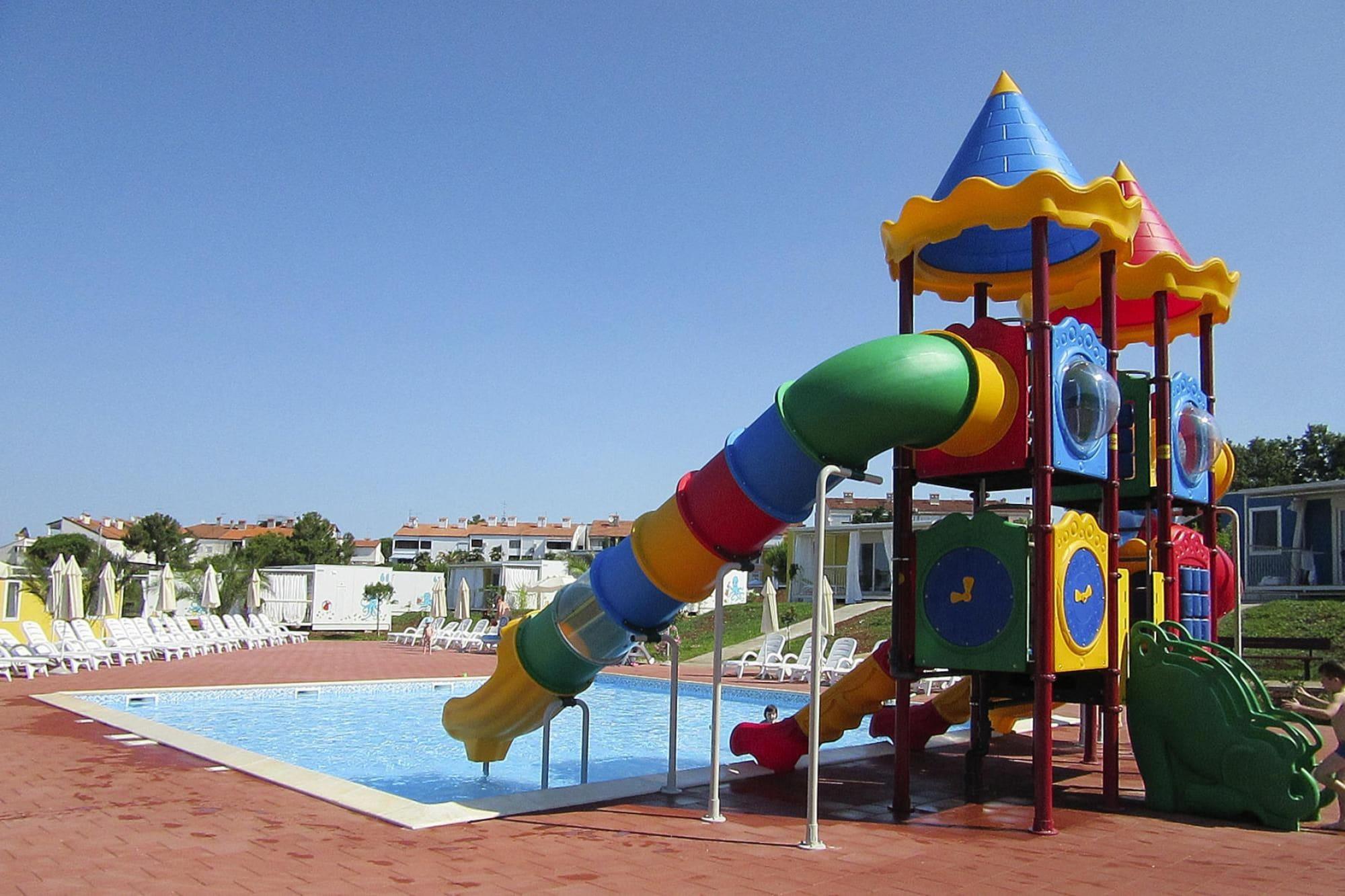 Bilfrit campingvognsskur lige ved havet og midt i en egeskov, omgivet af flere hektar vinmarker. Et særligt kendetegn ved banen er en udendørs pool fyldt med havvand og en olivenoliehave med 170 træer. Nogle af mobilhomes er placeret i den bakkede del af campingvognsparken og er grupperet omkring en grillplads og et børneområde efter forbillede i tidligere landsbyer. Andre danner til gengæld en såkaldt istrisk landsby, som fungerer uafhængigt af resten af parken. Det ydre af disse mobilhomes minder om typiske istriske stenhuse. Her fuldender den private køkkenhave tilbagevenden til naturen. Du kan hjælpe dig selv til de naturligt dyrkede grøntsager gratis. Du kan også finde flere mobilhomes beliggende under skyggefulde træer nær to nybyggede swimmingpools. Der er også et separat afslapningsområde med hængende liggestole, et fortelt og gynger. Den dels stenede, dels stenstrand, med en bred vifte af vandsport, strækker sig et par hundrede meter forbi campingvognsparken. Detaljer: WLAN-registreringsgebyr Aktiviteter i nærheden: Den historiske by Novigrad med italienske påvirkninger er kun 4 km væk. En tur til Baredine-hulerne i Nova Vas og den nærliggende by Porec kan også anbefales. Aquapark Istralandia byder på masser af spænding for besøgende i alle aldre. Vandverdenen, der dækker mere end 80.000 kvadratmeter, ligger mellem Novigrad og Brtonigla, kun omkring 9 km fra kysten Ikke egnet til personer med nedsat mobilitet