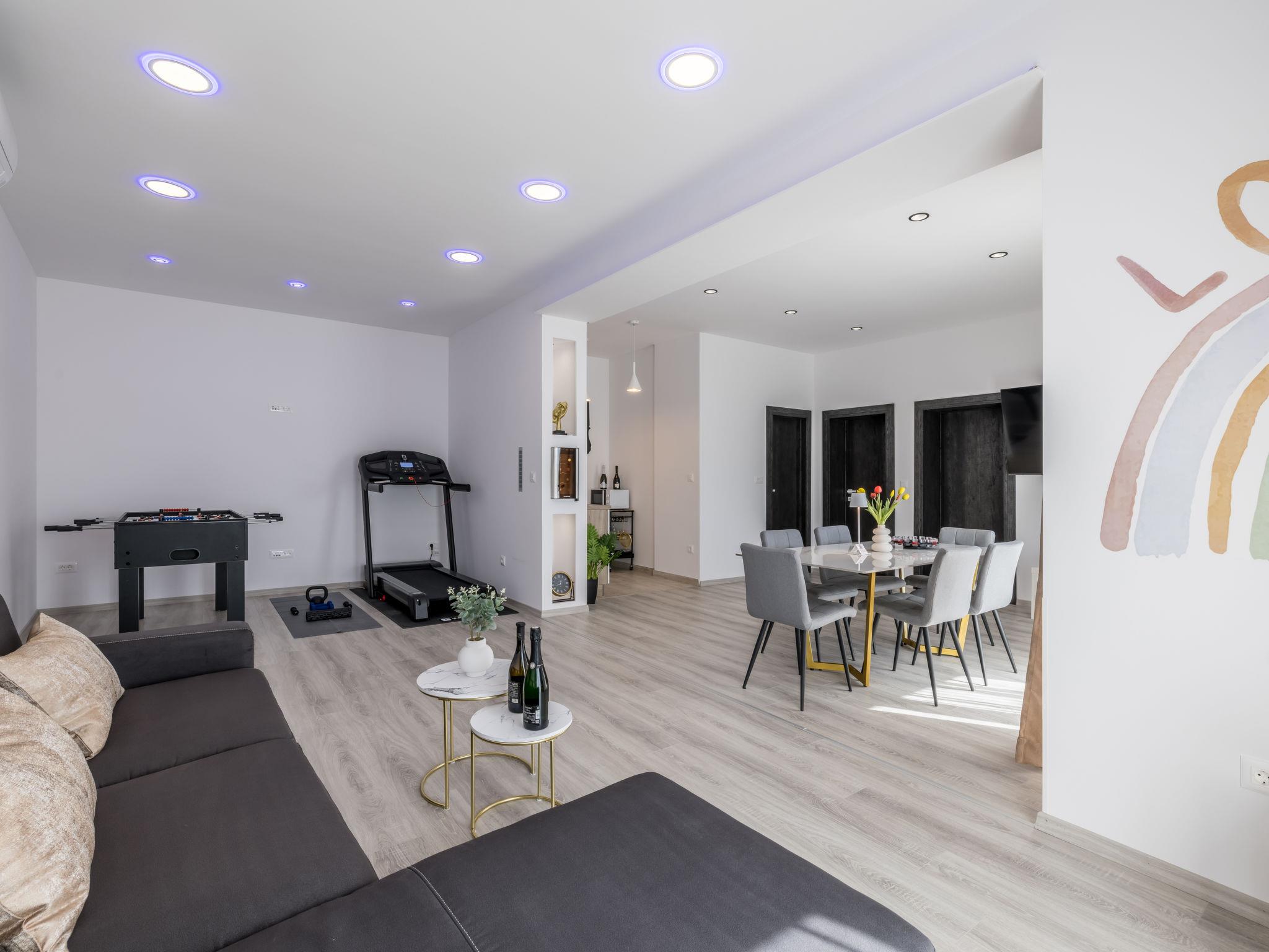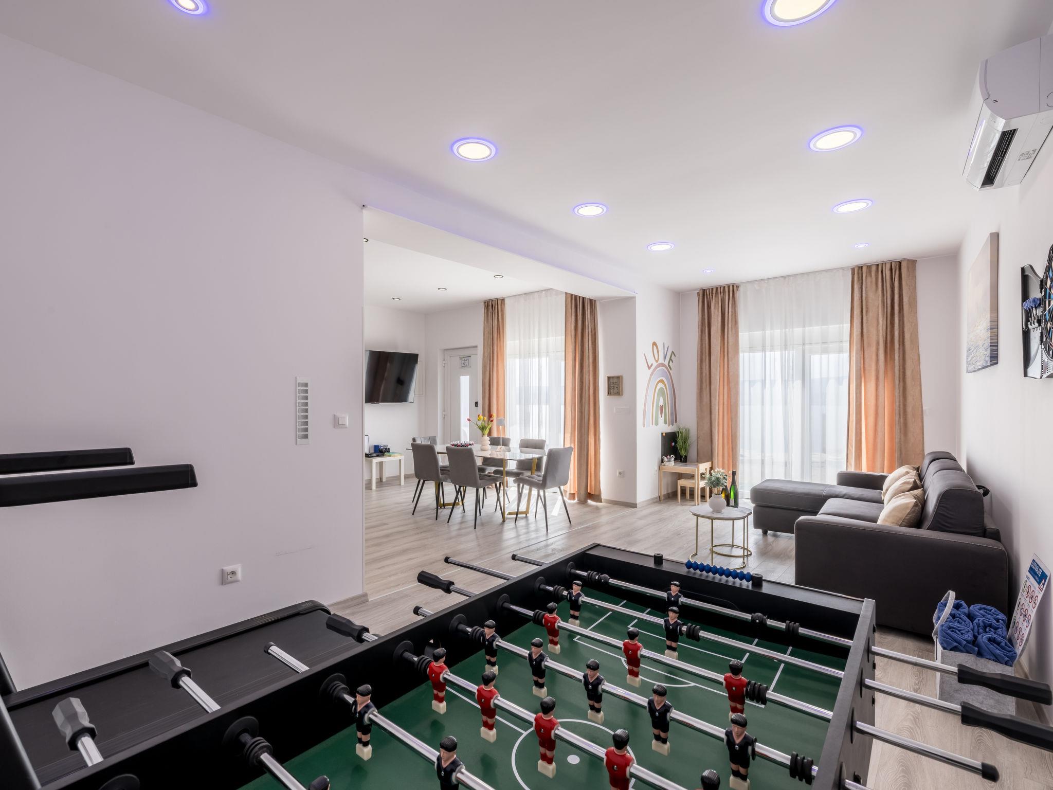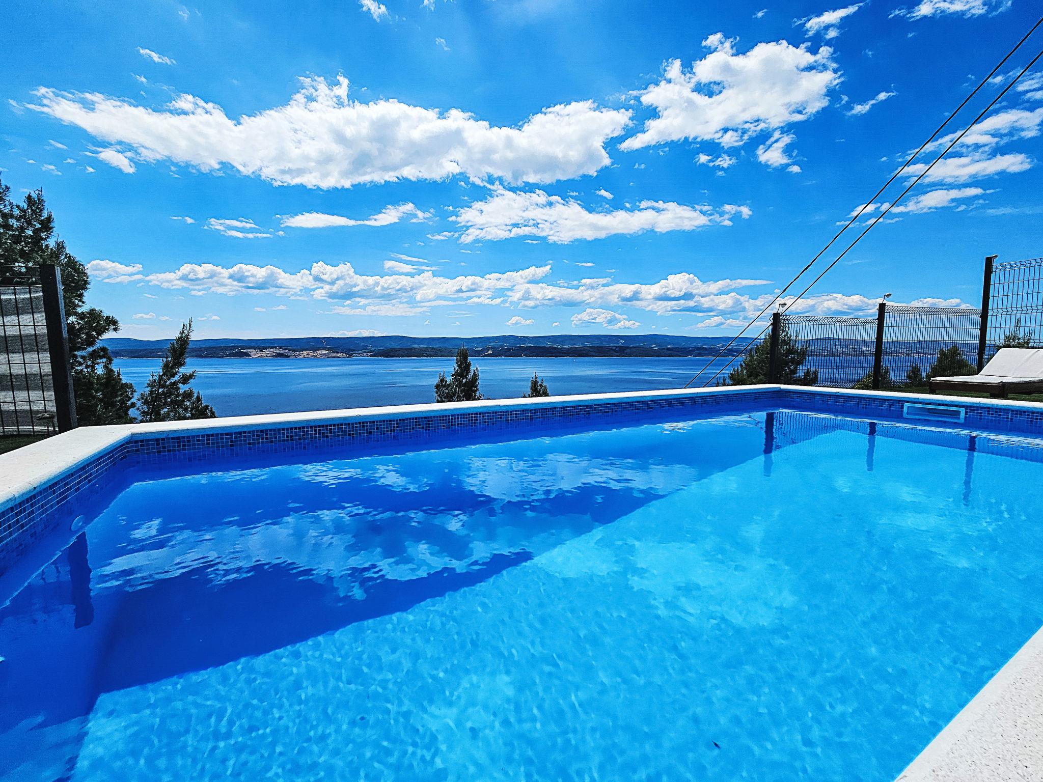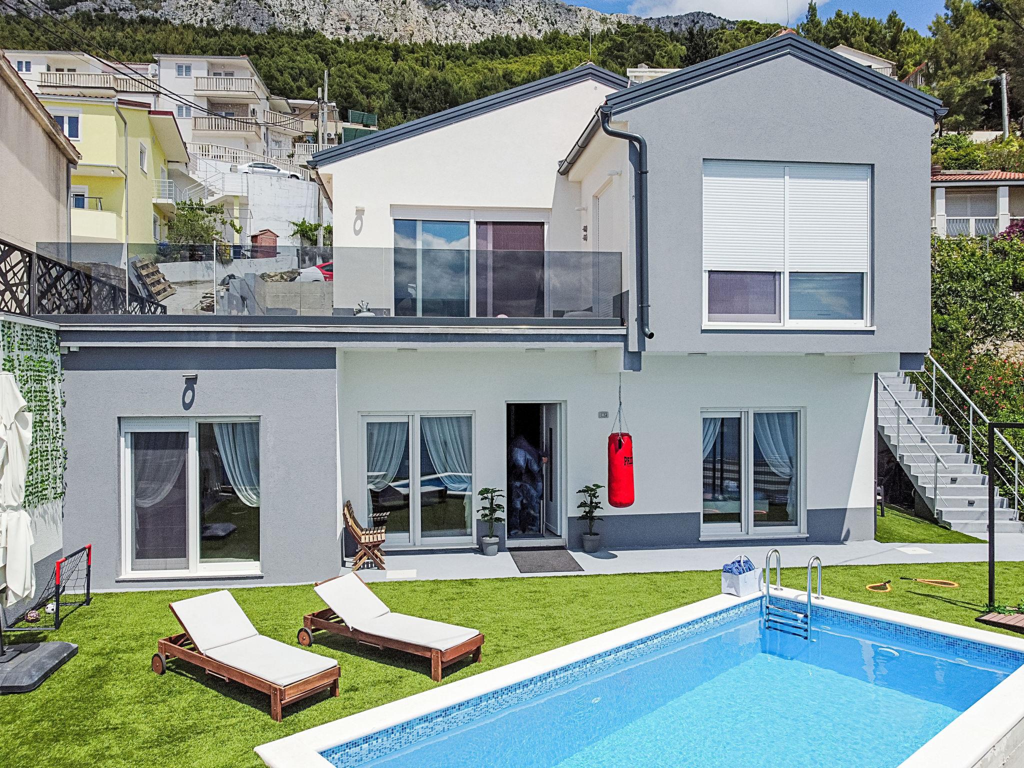 2-family house, 2 storeys, built in 2023. 6 km from the centre of Omiš, 31 km from the centre of Split, in a quiet, sunny, elevated position, 750 m from the sea, 800 m from the beach, in a cul-de-sac. Private: property 450 m2 (fenced), swimming pool angular (6 x 3 m, depth 170 cm, seasonal availability: 15.May. - 01.Oct.). Outdoor shower, badminton, terrace (30 m2), garden furniture, barbecue. In the house: internet access, table football. Parking (for 3 cars) at the house on the premises. Shop 500 m, restaurant 1 km, bus stop 1.6 km, pebble beach, rocky beach 800 m. Video surveillance of the driveway and parking.