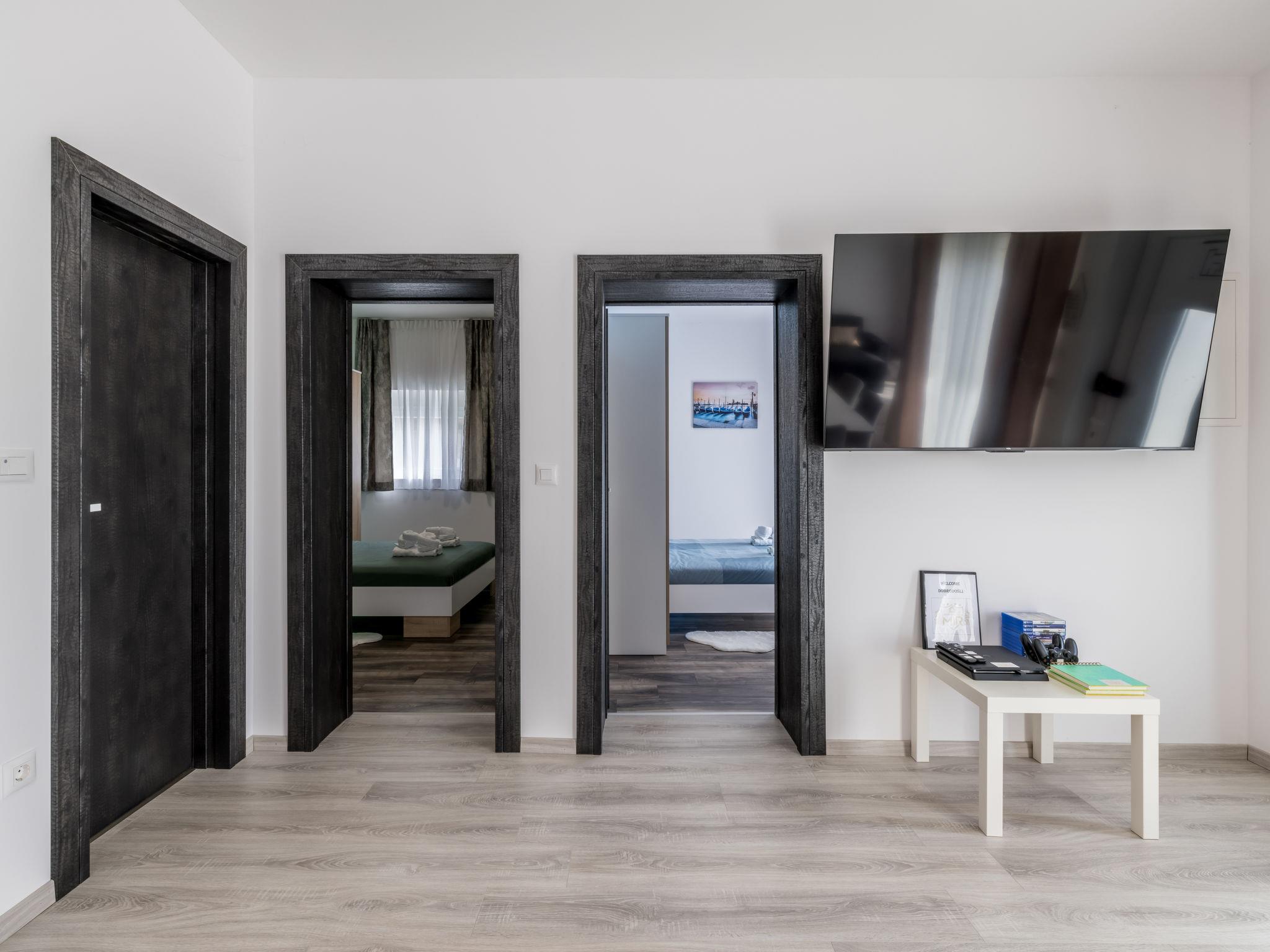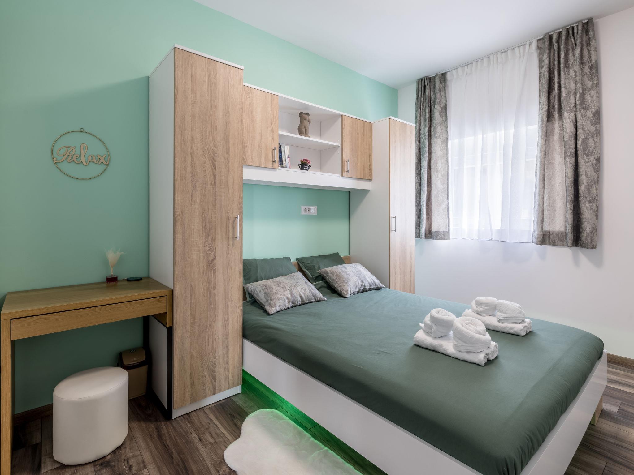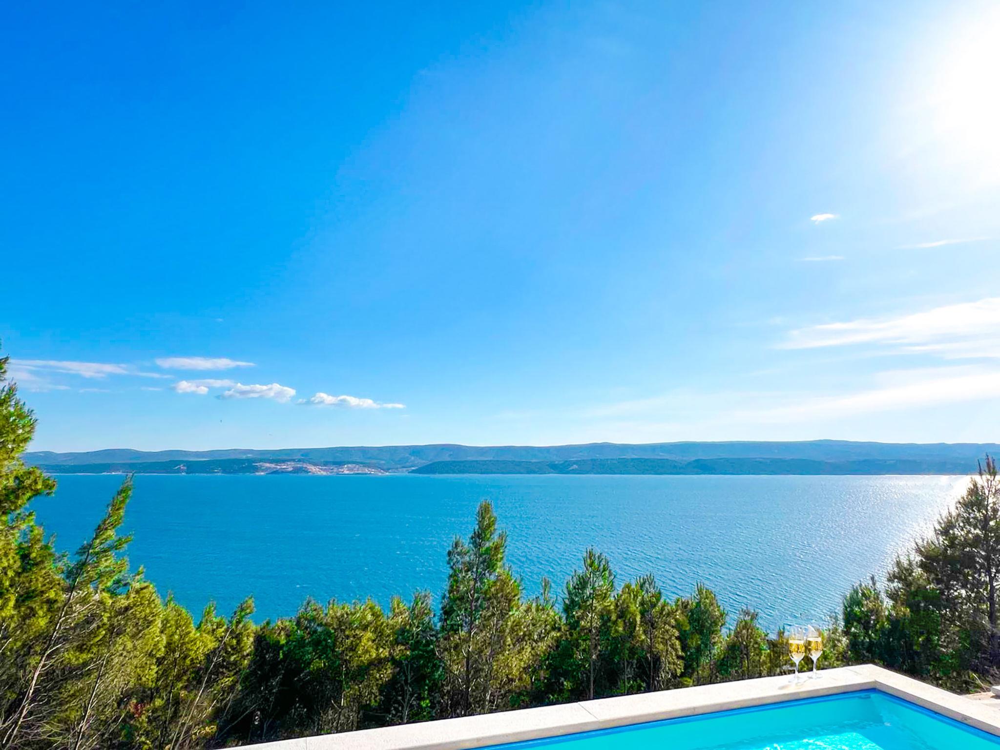 "Luxury Mir", 3-room apartment 80 m2, lower ground floor, south facing position. Living/dining room with 1 double sofabed (140 cm, length 200 cm), satellite TV (flat screen), air conditioning. Exit to the terrace, to the swimming pool. 1 room with 1 french bed (160 cm, length 200 cm), fan. Exit to the swimming pool. 1 room with 1 french bed (160 cm, length 200 cm), fan. Open kitchen (dishwasher, 2 induction hot plates, toaster, kettle, microwave, freezer, electric coffee machine). Shower/WC. Barbecue, deck chairs (4). Marvellous panoramic view of the sea. Facilities: iron, baby cot, hair dryer. Internet (WiFi, free). 2181/1-06/05-18-24-3-DP