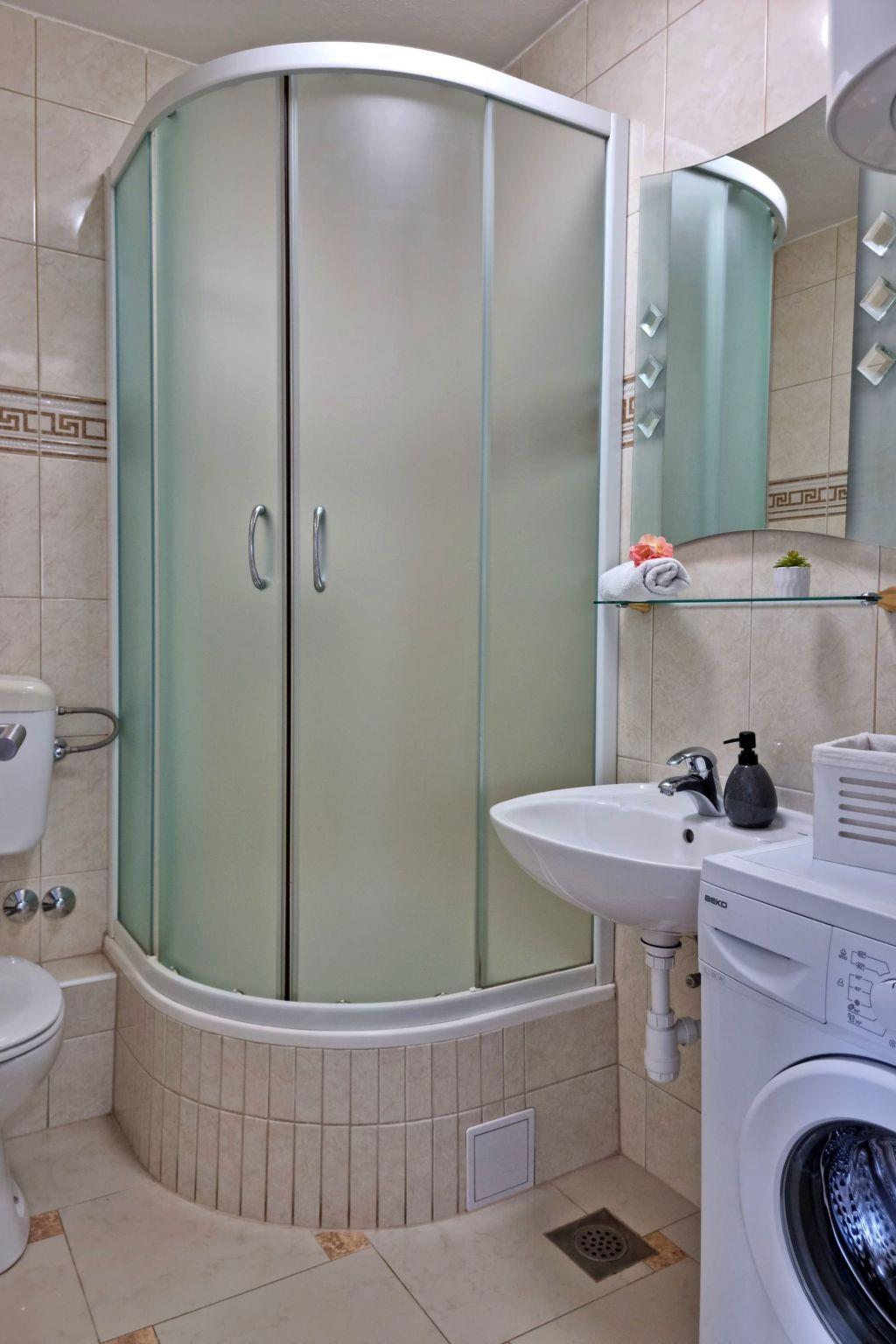 It is a private apartment in a building, on the 1st floor, and it can accommodate up to 5 persons. The apartment features two bedrooms with double beds, in one of them is a sofa bed for one additional sleeping possibility, an equipped kitchen (including an oven, a dishwasher, kitchenware and other kitchen appliances) with a living room and a dining/sitting area, 2 bathrooms and a sea-view balcony with an outdoor dining/sitting area.Additional amenities include Wi-Fi, SAT/TV, a washing machine and air-conditioning (one unit in each bedroom and one unit in the living room).