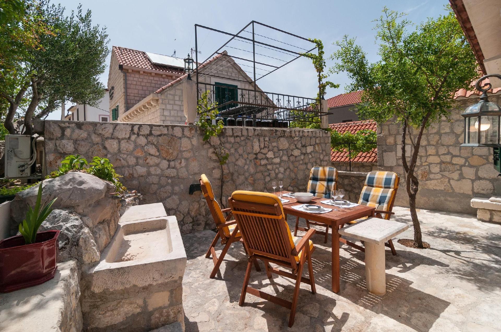 This 35m² holiday apartment is an independent little house in the interior courtyard of the site. The house is built with old Dalmatian stone and in the interior you can also see the flair of the traditional style due to the beautiful stone walls. The ground floor has a bathroom, cloakroom space, a little kitchen and a living room with a sitting corner and TV. The bathroom provides a shower cubicle, a hairdryer and a toilet. The kitchen corner is equipped with a fridge, a two-ring hob, a kettle and all the usual utensils for simple self-catering. There are stairs up to the upper floor with a bedroom for three people, furnished with a double bed (160 x 200cm) and a single bed (90 x 190cm) and a dresser. The living and sleeping areas have air conditioning. There is a TV with an Astra satellite receiver. Right in front of the entrance door you can find a beautiful courtyard garden with olive trees and grape vines, as well as a variety of seating and a grill.