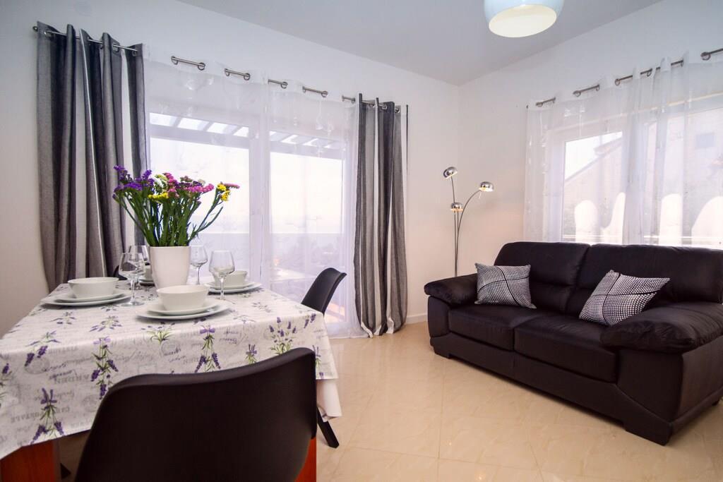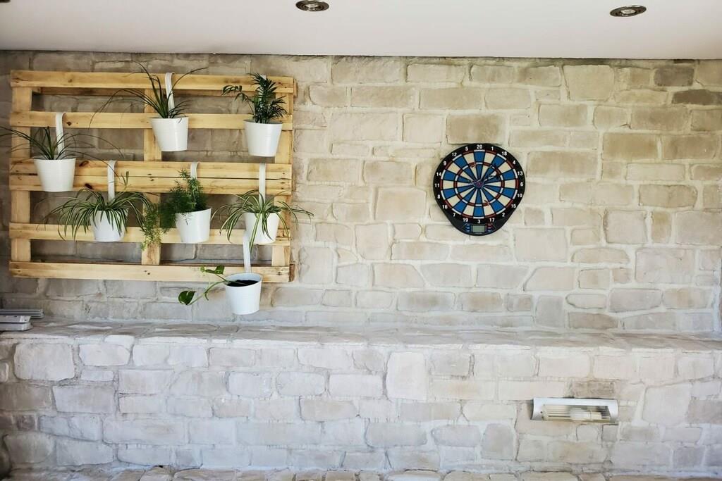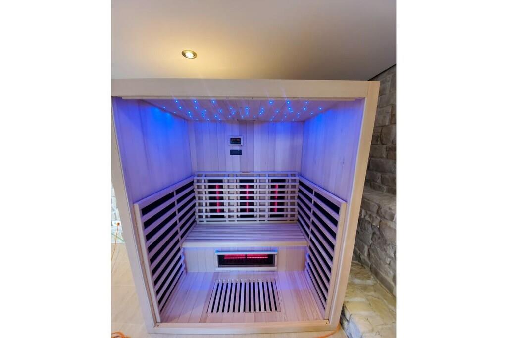 Stueetage: (Køkken(kakkelovn, kogeplade, ovn, opvaskemaskine , klimaanlæg), Stue/soveværelse(Fjernsyn, klimaanlæg), Stue/soveværelse(enkeltsovesofa, Fjernsyn, klimaanlæg), soveværelse(king size-seng, klimaanlæg), soveværelse(king size-seng, klimaanlæg)) På 1. etage: (Køkken(kakkelovn, kogeplade, ovn, opvaskemaskine , køleskab, klimaanlæg), soveværelse(king size-seng, klimaanlæg), soveværelse(king size-seng, klimaanlæg), badeværelse(bruser, håndvask, toilet, Håndklæder inkl.), badeværelse(bruser, håndvask, toilet, Håndklæder inkl.)) grill, solarium, sauna, balkon, klimaanlæg, terrasse, swimmingpool, bordtennisbord, dart, Gyngestativ