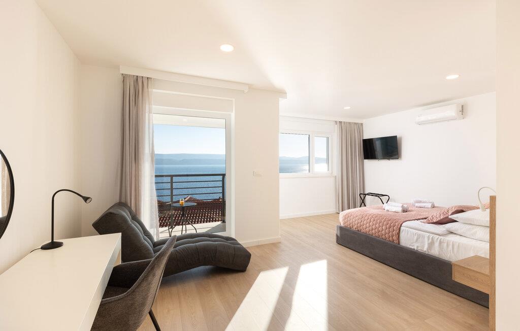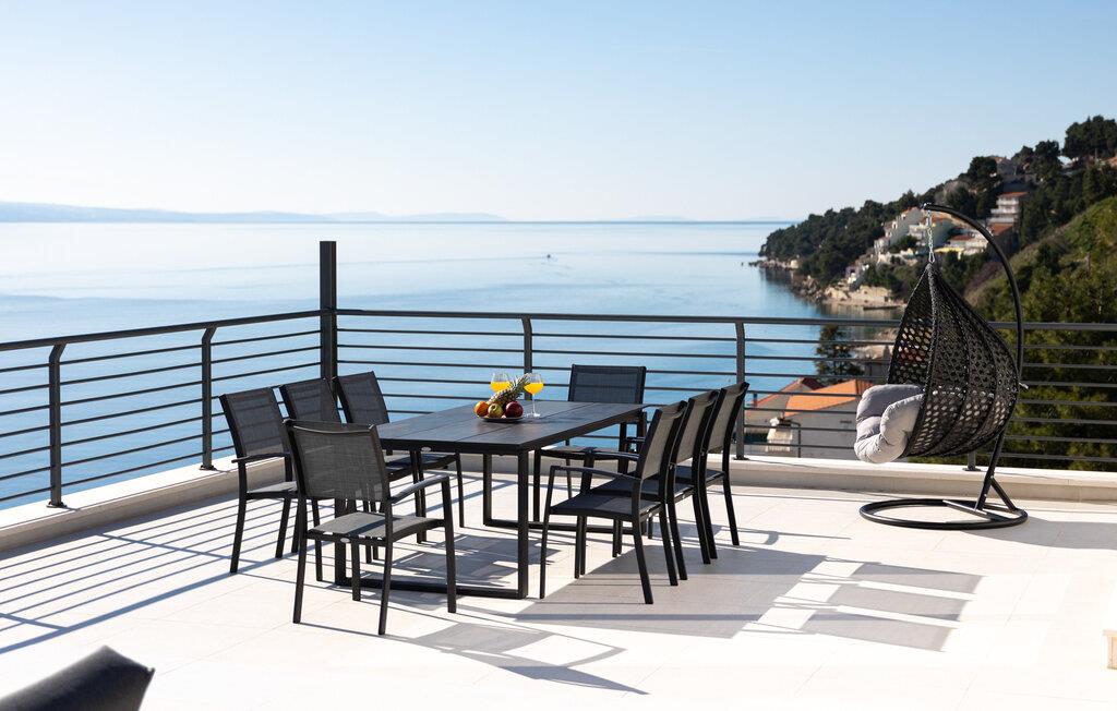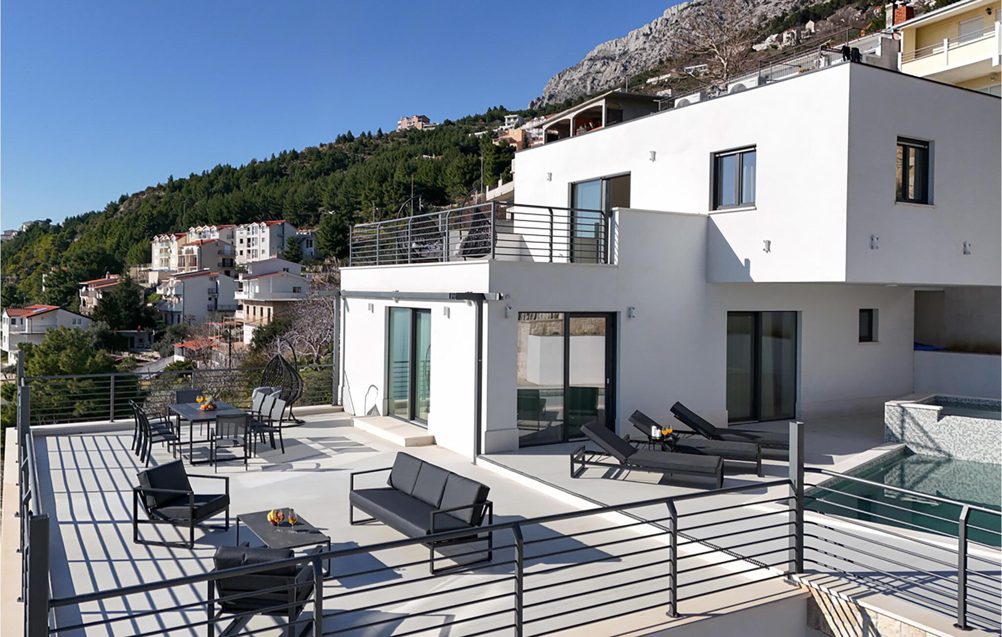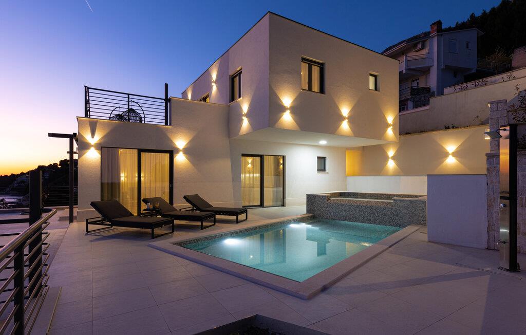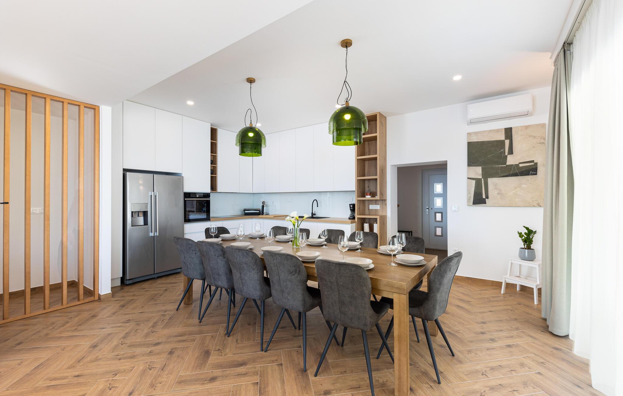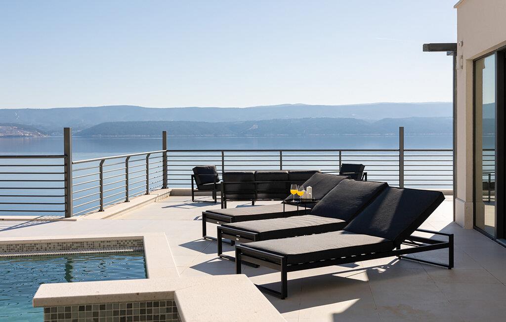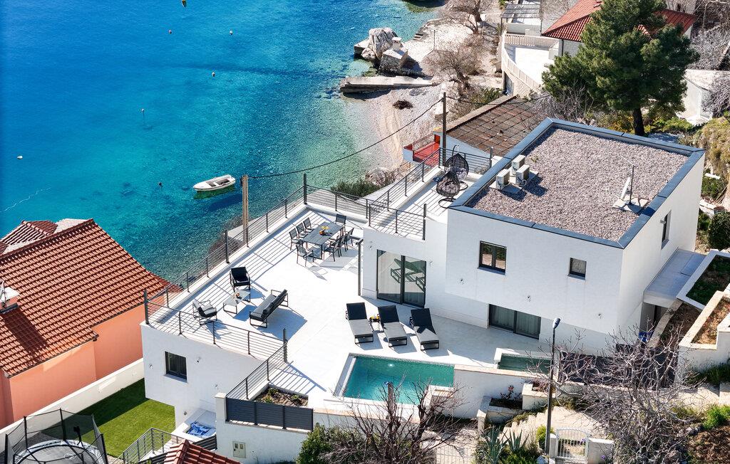 I denne rummelige villa på den dalmatiske kyst venter en uforglemmelig pause på jer i en privilegeret beliggenhed direkte over det turkise hav. Det elegante interiør kombinerer minimalistisk design med varme træelementer og bløde toner. Fremtryll kulinariske højdepunkter i det åbne køkken, og tag plads ved det stilfulde spisebord. Slap af i den åbne opholdsstue og afslut dagen med en filmaften eller en god samtale.