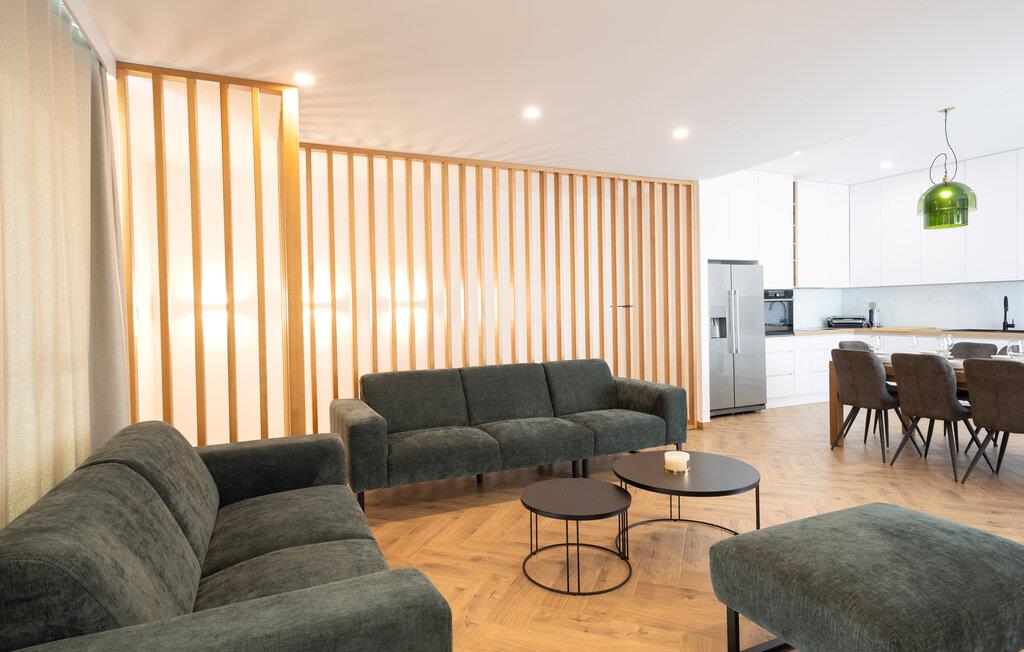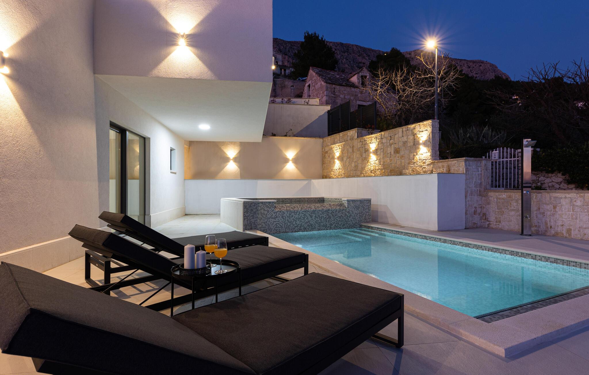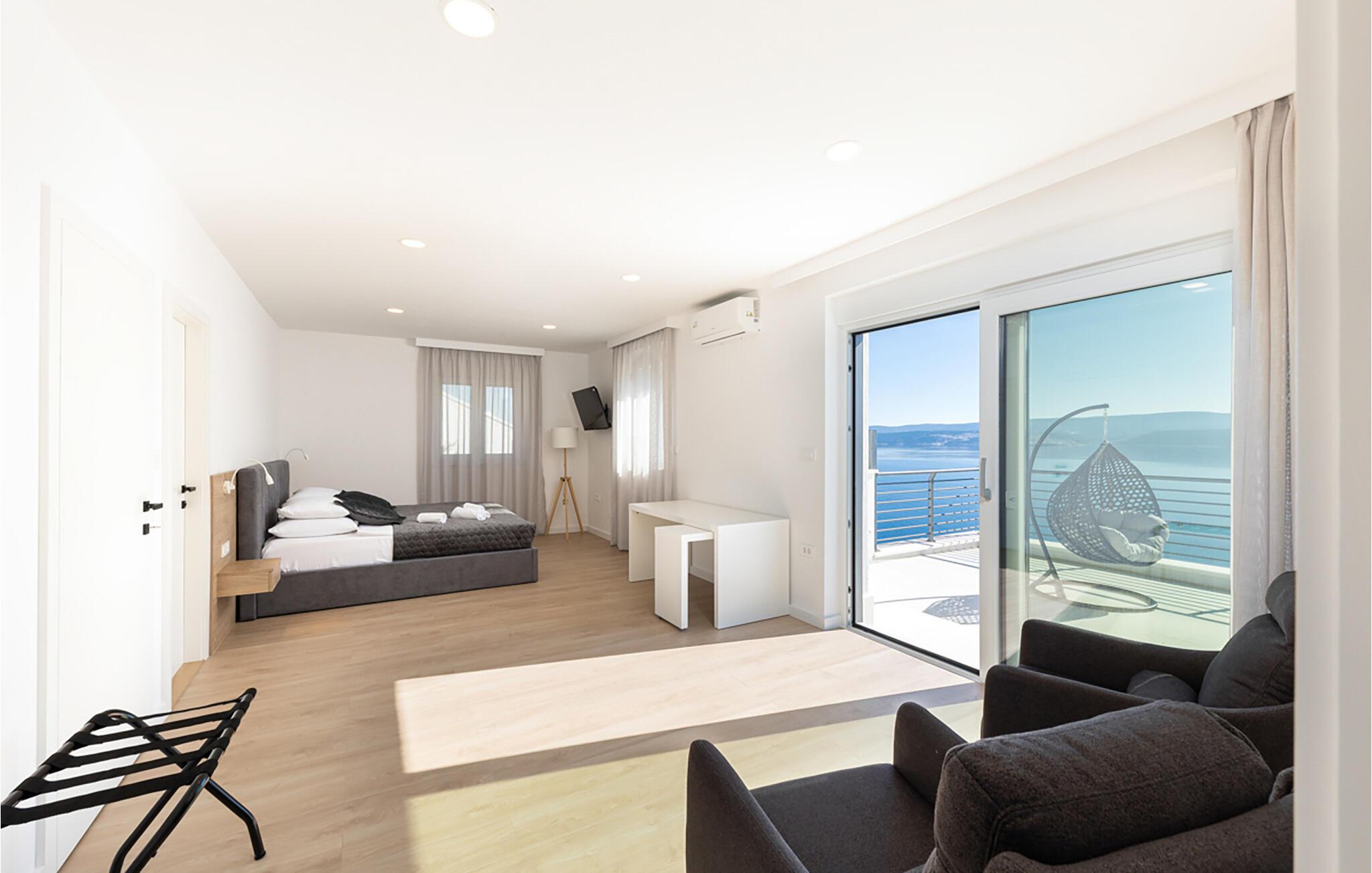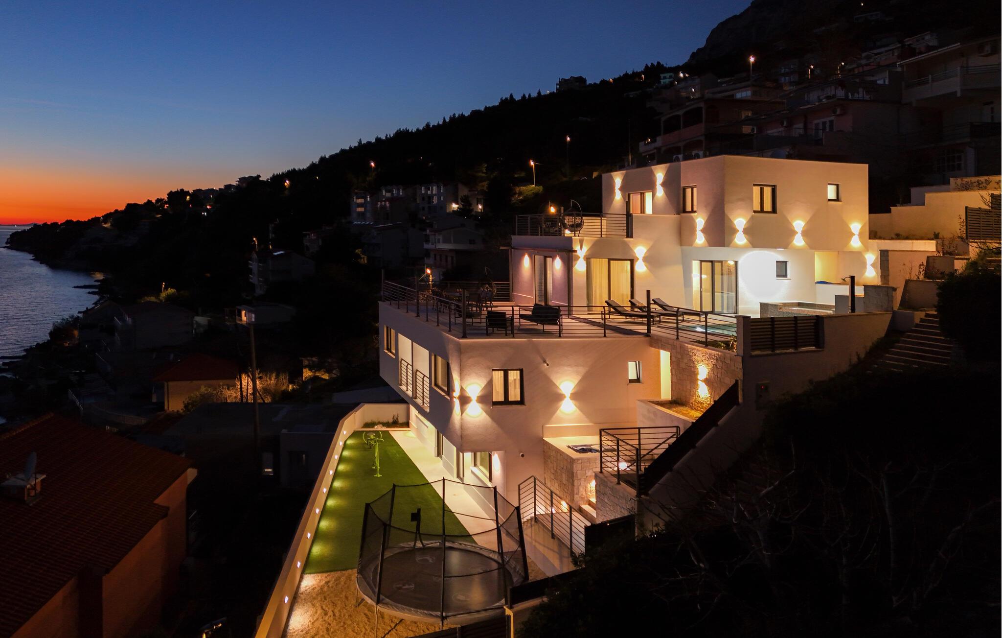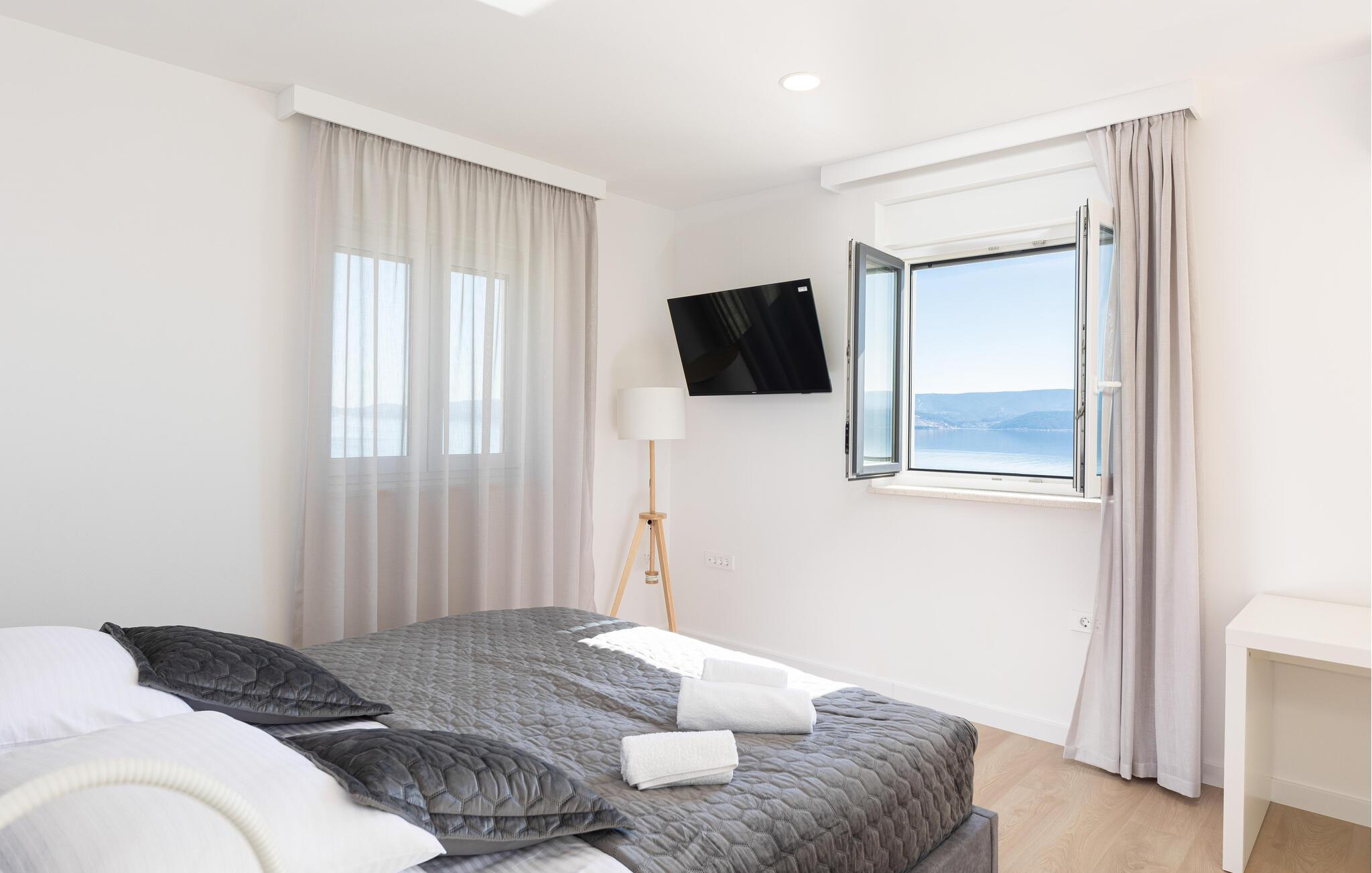 I denne rummelige villa på den dalmatiske kyst venter en uforglemmelig pause på jer i en privilegeret beliggenhed direkte over det turkise hav. Det elegante interiør kombinerer minimalistisk design med varme træelementer og bløde toner. Fremtryll kulinariske højdepunkter i det åbne køkken, og tag plads ved det stilfulde spisebord. Slap af i den åbne opholdsstue og afslut dagen med en filmaften eller en god samtale.