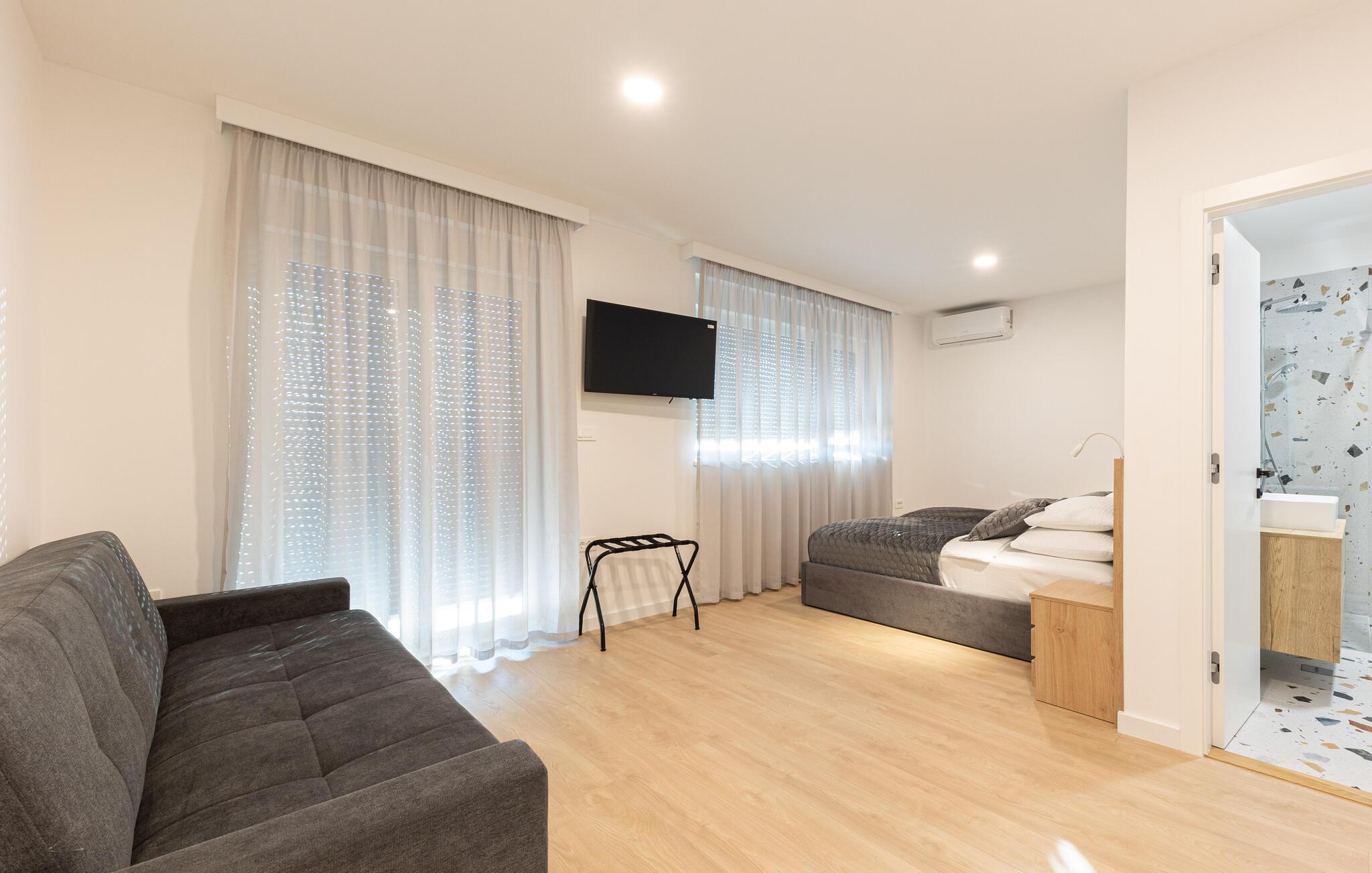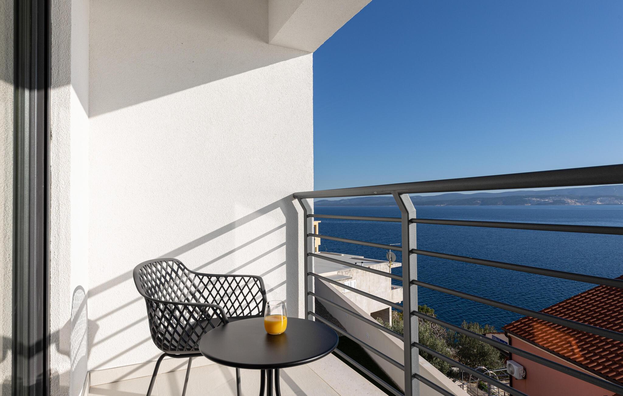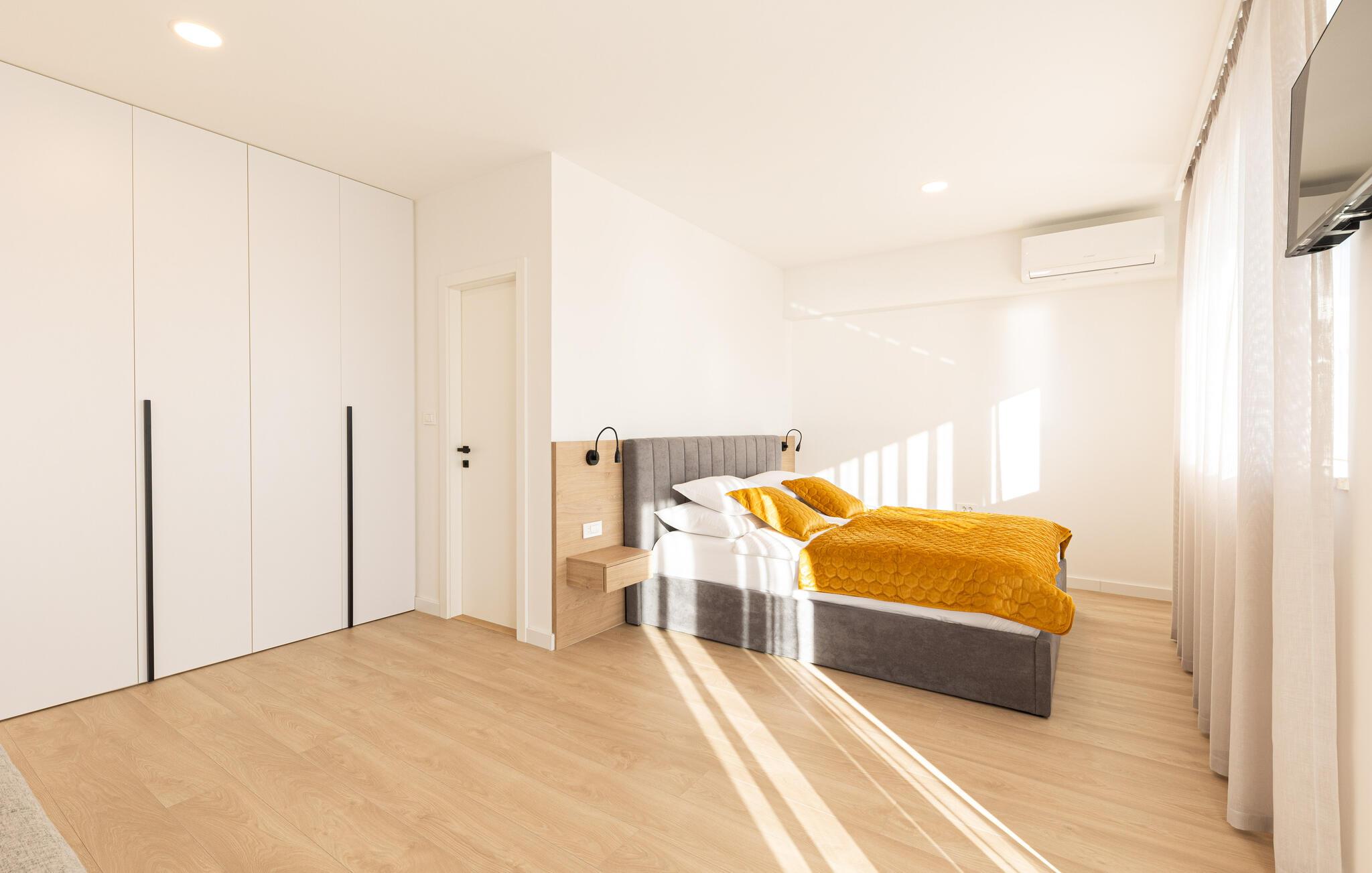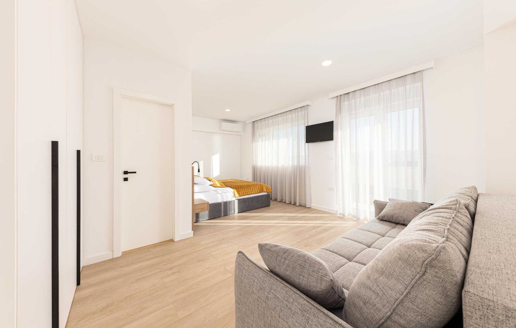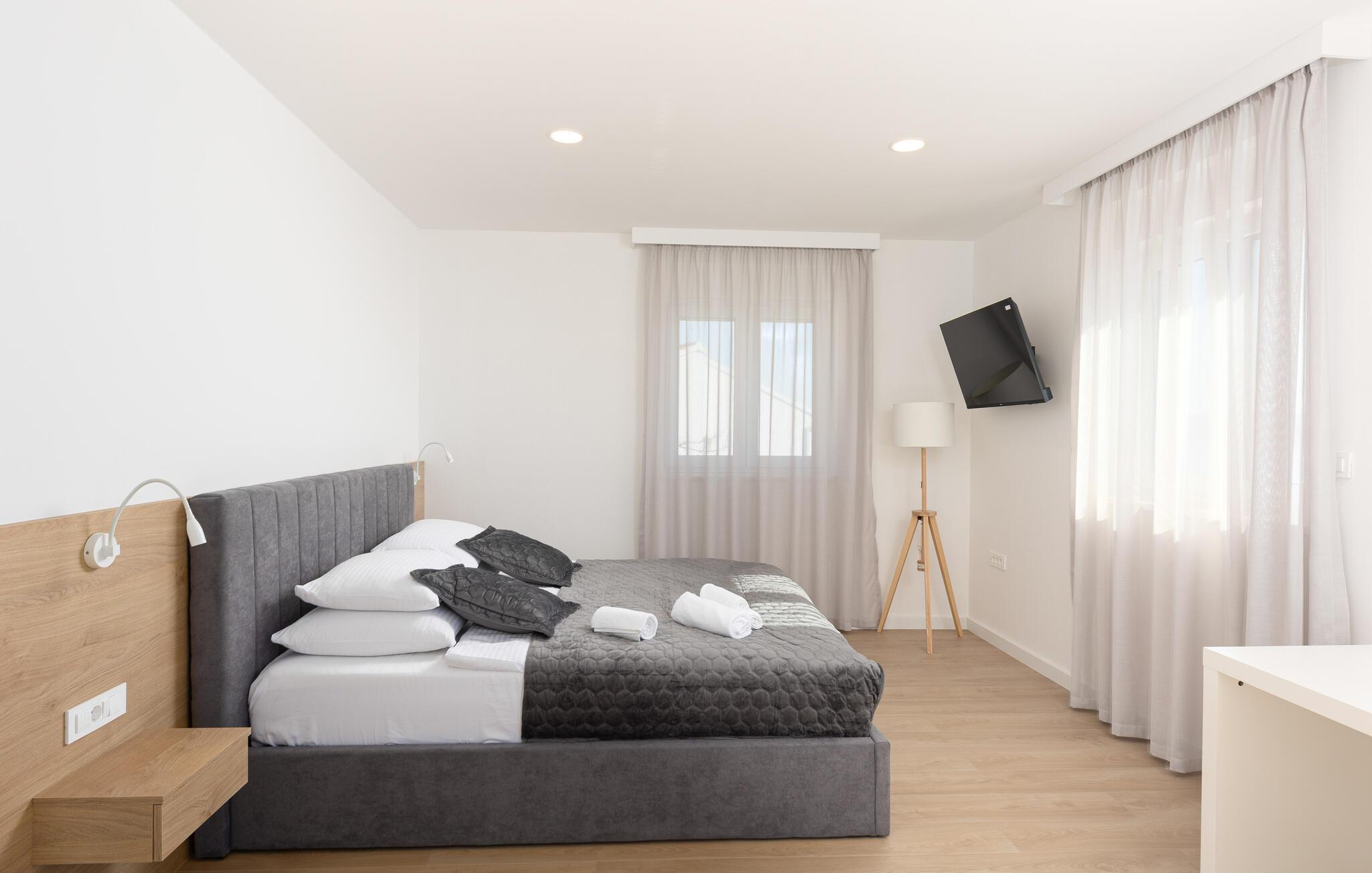 I denne rummelige villa på den dalmatiske kyst venter en uforglemmelig pause på jer i en privilegeret beliggenhed direkte over det turkise hav. Det elegante interiør kombinerer minimalistisk design med varme træelementer og bløde toner. Fremtryll kulinariske højdepunkter i det åbne køkken, og tag plads ved det stilfulde spisebord. Slap af i den åbne opholdsstue og afslut dagen med en filmaften eller en god samtale.